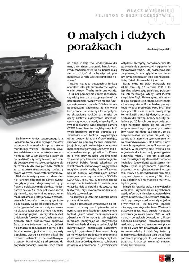 Włącz myślenie! Felieton o bezpieczeństwie O małych i dużych porażkach Andrzej Popielski Definitywny koniec tegorocznego lata. Poznałem to po lekkim wysypie tematów sezonowych w mediach, np. że szkolne monitoringi wizyjne – bo przecież, skwaszona dziatwo, marsz do szkoły – skuteczne nie są. Jest w tym ziarenko prawdy, ale co się dziwić – systemy telewizji w oświacie powstawały w masowej, politycznej akcji, za małe budżetowe pieniądze. Nastąpił za to zupełnie niezauważony społeczny awans woźnych; na operatorki systemów. Niektóre tematy są jeszcze rodem z letniej kanikuły. Fotografii do kamer, zwłaszcza gdy obydwa rodzaje urządzeń są cyfrowe, a obiektywy mają obydwa, nie jest bardzo daleko. Ale, choć pokrewne, różnią się nie tylko ruchomymi lub nieruchomymi obrazkami. W profesjonalnych zastosowaniach fotografia i programy graficzne dla niej zaszły już na takie rubieże, że niejedna „gwiazdka” nie może się rozpoznać na okładce czasopisma, z tego nadmiaru naturalnego piękna. Przeczytałem tekścik o dziwnych funkcjonalnościach wprowadzanych przez producentów aparatów. Są to znane światowe marki, co jednak nie oznacza, że rozum mają z górnej półki. Przyhamowano, jeśli chodzi o produkty popularne, wyścig na miliony pikseli (bo przecież lustrzanki z pełnoklatkowymi przetwornikami wciąż są adresowane do zwykłych zjadaczy... kawioru), więc trochę na oślep szukają tzw. wodotrysków dla mas, o wyraźnym znaczeniu handlowym. Producenci kamer też już nie bardzo mają się na co ścigać. Może by więc zaimplementować w nich jakąś fotograficzną nowinkę? Weźmy np. taką powszechną funkcję aparatów foto, jak automatyczne wykrywanie twarzy. Trochę mnie ona obraża. To już bez pomocy nie umiem rozpoznać, czy widzę twarz, czy np. „plecy dolne”, za przeproszeniem? Może więc modna funkcja wykrywania uśmiechu? Ciebie też nie podejrzewam, Czytelniku, że nie wiesz kiedy model się szczerzy i to sympatyczne skrzywienie kącików ust musisz do oceny zostawić algorytmowi decydującemu, czy otworzy wtedy migawkę. Poza tym to niekaralne, więc dlaczego kamera CCTV? Rozumiem, że mogłaby zaspokoić twoją branżową próżność potrzeba doskonałości – np. funkcja wygładzająca obraz twarzy. To taki cyfrowy makijaż, zapewne za pomocą techniki odszumiającej obraz, czyli pozbawiający go atutów marketingowego wyścigu, tzn. tych milionów reklamowanych pikseli, np. z 15 mln na 5 mln przy trądziku uogólnionym? To akurat przy kamerach wielomegapikselowych byłaby funkcja szkodliwa, bo w zbliżeniach stadionowych wągry kiboli mogłyby stracić cechy identyfikacyjne. Kolejna funkcja, wyszczuplająca postać (stosujmy skuteczny marketing – ODCHUDZAJĄCA!). Nie... nie... w telewizji chodzi o rozpoznanie i ustalenie tożsamości, a tu wszystko idzie w kierunku nie tego, co jest faktycznie... czyli wyobrażeń modela o sobie. Ale to, to on kupi. Na szczęście jeszcze nie nadeszła nasza pora na zidiocenie. Teraz o pasażerach zmuszanych na lotniskach do naturyzmu. Z opisem technicznym na poziomie każdego szanowanego tabloidu, jakieś polskie medium podało za „Guardianem” informację, że na brytyjskich lotniskach, poczynając od londyńskiego Heathrow, będą skanery w technologii fal milimetrowych rozbierające pasażerów, ale tylko „rysunkowo”, konturowo. Mają za to wszystkie podejrzane przedmioty pokazywać jako żółte prostokąty czy kwadraciki. Ma być to łagodniejsze rozbieranie pasażera w porównaniu z ujawniającymi Systemy Alarmowe nr 5, wrzesień – październik 2011 wstydliwe szczegóły pornoskanerami (to też określenie z brukowców) – agresywnie forsowanych w USA. Tutaj pasażer ma sam decydować, bo ma oglądać obraz pierwszy, czy nie narusza on jego godności osobistej. Taka kultura ekshibicjonizmu! Nasze okno na świat otworzyło się 20 lat temu, tj. 17 sierpnia 1991 r. To jest data pierwszego polskiego połączenia internetowego. Wtedy Rafał Pietrak z Wydziału Fizyki Uniwersytetu Warszawskiego połączył się z Janem Sorensenem z Uniwersytetu w Kopenhadze, początkowo tylko z prędkością 9600 b/s. Takie były początki życia w sieci, nowej drogi komunikacji i transmisji danych, tak ważnej także dla rozwoju branży security. Zaledwie po 20 latach bez tego pożytecznego narzędzia obejść się nie umiemy w życiu zawodowym i prywatnym. Jesteśmy nawet od niego uzależnieni, co dla bezpieczeństwa korzystne nie jest. Prywatnie zaś stajemy się cyferkami (nie tylko zerojedynkowymi), ale kodów, pinów i innych wymysłów identyfikacyjno-opisowych. W pajęczynę sieci wplatają się zagrożenia dla informacji, przestępstwa przeciwko mieniu i dobrom osobistym oraz rozrastająca się sfera niedozwolonej inwigilacji (dozwolonej też jesteśmy niechętni). Tylko w gospodarce z powodu przestępstw w cyberprzestrzeni w tym roku straty np. amerykańskich firm mają osiągnąć gigantyczną kwotę 130 miliardów dolarów! Ale nie ma się co martwić... będzie gorzej. Minęła 10. rocznica ataku na nowojorskie wieże WTC. Przypomniała mi się zasłyszana wtedy informacja, nie wiem czy prawdziwa. O tym, że nowe miejskie centrum zarządzania kryzysowego znajdowało się w jednej z tych wież, co – jeśli tak było – musiało mieć wpływ na akcję ratunkową. W wieżach pracowało 25 tys. ludzi, zginęło na oczach przerażonego świata prawie 3000. W skali makro – po atakach powstało w USA podobno ok. 1300 agencji i różnych organizacji rządowych; przeciwko terroryzmowi pracuje też ok. 2000 firm prywatnych. Zaś co do zachowań władzy, to niektórzy twierdzą, że największa demokracja stała się de facto państwem policyjnym. To jest największa przegrana. A przy tym nie jesteśmy nawet trochę bezpieczniejsi. o 5