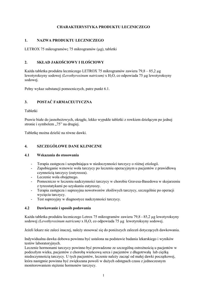 CHARAKTERYSTYKA PRODUKTU LECZNICZEGO 1. NAZWA PRODUKTU LECZNICZEGO LETROX 75 mikrogramów; 75 mikrogramów (µg), tabletki 2. SKŁAD JAKOŚCIOWY I ILOŚCIOWY Każda tabletka produktu leczniczego LETROX 75 mikrogramów zawiera 79,8 – 85,2 µg lewotyroksyny sodowej (Levothyroxinum natricum) x H2O, co odpowiada 75 µg lewotyroksyny sodowej. Pełny wykaz substancji pomocniczych, patrz punkt 6.1. 3. POSTAĆ FARMACEUTYCZNA Tabletki Prawie białe do jasnobeżowych, okrągłe, lekko wypukłe tabletki z rowkiem dzielącym po jednej stronie i symbolem „75” na drugiej. Tabletkę można dzielić na równe dawki. 4. SZCZEGÓŁOWE DANE KLINICZNE 4.1 Wskazania do stosowania - 4.2 Terapia zastępcza i uzupełniająca w niedoczynności tarczycy o różnej etiologii. Zapobieganie wznowie wola tarczycy po leczeniu operacyjnym u pacjentów z prawidłową czynnością tarczycy (eutyreoza). Leczenie wola obojętnego. Pomocniczo w leczeniu nadczynności tarczycy w chorobie Gravesa-Basedowa w skojarzeniu z tyreostatykami po uzyskaniu eutyreozy. Terapia zastępcza i supresyjna nowotworów złośliwych tarczycy, szczególnie po operacji wycięcia tarczycy. Test supresyjny w diagnostyce nadczynności tarczycy. Dawkowanie i sposób podawania Każda tabletka produktu leczniczego Letrox 75 mikrogramów zawiera 79,8 - 85,2 µg lewotyroksyny sodowej (Levothyroxinum natricum) x H2O, co odpowiada 75 µg lewotyroksyny sodowej. Jeżeli lekarz nie zaleci inaczej, należy stosować się do poniższych zaleceń dotyczących dawkowania. Indywidualna dawka dobowa powinna być ustalona na podstawie badania lekarskiego i wyników testów laboratoryjnych. Leczenie hormonami tarczycy powinno być prowadzone ze szczególną ostrożnością u pacjentów w podeszłym wieku, pacjentów z chorobą wieńcową serca i pacjentów z długotrwałą lub ciężką niedoczynnością tarczycy. U tych pacjentów, leczenie należy zacząć od małej dawki początkowej, która następnie powinna być zwiększana powoli w dużych odstępach czasu z jednoczesnym monitorowaniem stężenie hormonów tarczycy. 1 Doświadczenia wykazały, iż małe dawki początkowe są również wystarczające w przypadku niewielkiej masy ciała oraz dużego wola guzkowego. Wskazanie Niedoczynność tarczycy Dawkowanie u dorosłych (dawkę należy zwiększać o 25-50 µg w odstępach 2-4 tygodni) Profilaktyka nawrotu wola Wole obojętne Dawkowanie u dzieci Liczba µg lewotyroksyny sodowej/dobę Dawka początkowa Dawka podtrzymująca 25 - 50 100 - 200 Dawka początkowa 75 - 200 75 - 200 12,5 - 50 Dawka początkowa 25 - 50 (noworodki) Wielkość dawki podtrzymującej, stosowanej przez dłuższy czas, ustalana jest między innymi na podstawie wieku i wagi dziecka: Wiek Dawka µg /dobę Dawka µg /kg/dobę 0-6 miesięcy 25-50 10-15 6-24 miesiące 50-75 8-10 2-10 lat 75-125 4-6 10-16 lat 100-200 3-4 > 16 lat 100-200 2-3 W przypadku wrodzonej niedoczynności tarczycy jak najszybsze rozpoczęcie leczenia jest decydujące dla osiągnięcia normalnego rozwoju psychoruchowego. Wartości standardowe stężenia T4 należy osiągnąć podczas pierwszych 3 do 4 lat życia. Podczas pierwszych 6 miesięcy życia ocena stężenia T4, jako parametru kontrolnego, jest bardziej wymierna, niż stężenia TSH. Pomimo odpowiedniego dostarczenia T4 normalizacja stężenia TSH może trwać, w pojedynczych przypadkach, do 2 lat. Terapia wspomagająca leczenie 50 - 100 tyreostatyczne nadczynności tarczycy Po operacji usunięcia tarczycy z powodu złośliwego raka tarczycy 150 - 300 Test supresyjny w diagnostyce nadczynności tarczycy 200 (przez 14 dni do momentu wykonania scyntygramu) Całkowitą dawkę dobową należy przyjmować rano, na czczo, co najmniej ½ godziny przed śniadaniem, popijając odpowiednią ilością wody. Niemowlęta powinny otrzymywać dawkę dobową co najmniej ½ godziny przed pierwszym karmieniem. Tabletki należy rozpuścić w niewielkiej ilości wody, a powstałą w ten sposób zawiesinę podać z odpowiednią ilością płynów. Uwaga: za każdym razem tabletki muszą być rozpuszczane bezpośrednio przed podaniem! W przypadku niedoczynności tarczycy oraz po operacji usunięcia tarczycy z powodu nowotworu złośliwego tarczycy, leczenie trwa zazwyczaj przez całe życie; w przypadku wola obojętnego i profilaktyki nawrotu wola leczenie trwa kilka miesięcy lub lat, a nawet do końca życia; w terapii 2 wspomagającej leczenie nadczynności tarczycy czas trwania leczenia zależy od długości leczenia tyreostatycznego. 4.3 - Przeciwwskazania Nadwrażliwość na substancję czynną – lewotyroksynę – lub którąkolwiek substancję pomocniczą wchodzącą w skład produktu Letrox 75 mikrogramów. Nadczynność tarczycy, niezależnie od etiologii. Wyjątek stanowi terapia wspomagająca leczenie tyreostatyczne nadczynności tarczycy po osiągnięciu eutyreozy; należy jednak pamiętać, że jednoczesne przyjmowanie lewotyroksyny i leku tyreostatycznego jest przeciwwskazane u kobiet w ciąży. 4.4 Specjalne ostrzeżenia i środki ostrożności dotyczące stosowania Przed rozpoczęciem terapii hormonem tarczycy należy wykluczyć lub wprowadzić odpowiednią terapię następujących chorób: Niewydolność wieńcowa, niewydolność serca lub zaburzenia rytmu (tachyarytmia) Należy szczególnie ostrożnie ustalać lub zwiększać dawkę, aby uniknąć jatrogennej nadczynności tarczycy. W związku z tym, może być konieczna częstsza kontrola stężenia hormonów tarczycy (patrz punkt 4.2). Niedoczynność tarczycy niedoczynność kory nadnerczy W przypadku wtórnej niedoczynności tarczycy, należy wykluczyć jednoczesną niedoczynność kory nadnerczy. Jeśli niedoczynność kory nadnerczy zostanie potwierdzona, w pierwszej kolejności należy zastosować hydrokortyzon. U kobiet z niedoczynnością tarczycy, w okresie pomenopauzalnym, ze zwiększonym ryzykiem wystąpienia osteoporozy, należy częściej kontrolować czynność tarczycy, w celu uniknięcia zbyt 