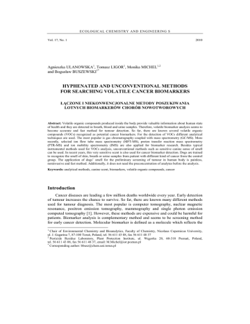 E C O LO GIC AL C H E M IS T R Y AN D E N GIN E E R IN G S Vol. 17, No. 1 2010 Agnieszka ULANOWSKA1, Tomasz LIGOR1, Monika MICHEL1,2 and Bogusław BUSZEWSKI1* HYPHENATED AND UNCONVENTIONAL METHODS FOR SEARCHING VOLATILE CANCER BIOMARKERS ŁĄCZONE I NIEKONWENCJONALNE METODY POSZUKIWANIA LOTNYCH BIOMARKERÓW CHORÓB NOWOTWOROWYCH Abstract: Volatile organic compounds produced inside the body provide valuable information about human state of health and they are detected in breath, blood and urine samples. Therefore, volatile biomarker analysis seems to become accurate and fast method for tumour detection. So far, there are known several volatile organic compounds (VOCs) recognized as potential cancer biomarkers. For the detection of VOCs different analytical techniques are used. The most popular is gas chromatography coupled with mass spectrometry (GC/MS). More recently, selected ion flow tube mass spectrometry (SIFT-MS), proton transfer reaction mass spectrometry (PTR-MS) and ion mobility spectrometry (IMS) are also applied for biomarker research. Besides typical instrumental methods used for VOCs analysis, unconventional methods such as sensitive canine sense of smell can be used. In recent years, this very sensitive scent is also used for cancer biomarker detection. Dogs are trained to recognize the smell of skin, breath or urine samples from patient with different kind of cancer from the control group. The application of dogs’ smell for the preliminary screening of tumour in human body is painless, noninvasive and fast method. Additionally, it does not need the preconcentration of analytes before the analysis. Keywords: analytical methods, canine scent, biomarkers, volatile organic compounds, cancer Introduction Cancer diseases are leading a few million deaths worldwide every year. Early detection of tumour increases the chance to survive. So far, there are known many different methods used for tumour diagnosis. The most popular is computer tomography, nuclear magnetic resonance, positron emission tomography, mammography and single photon emission computed tomography [1]. However, these methods are expensive and could be harmful for patients. Biomarker analysis is complementary method and seems to be screening method for early cancer detection. Molecular biomarker is defined as a molecule which reflects the 1 Chair of Environmental Chemistry and Bioanalytics, Faculty of Chemistry, Nicolaus Copernicus University, ul. J. Gagarina 7, 87-100 Toruń, Poland, tel. 56 611 43 08, fax 56 611 48 37 2 Pesticide Residue Laboratory, Plant Protection Institute, ul. Węgorka 20, 60-318 Poznań, Poland, tel. 56 611 43 08, fax 56 611 48 37, email: [email protected] * Corresponding author: [email protected] 10 Agnieszka Ulanowska, Tomasz Ligor, Monika Michel and Bogusław Buszewski pathological state of the organism and it can be characteristic pharmacologic response to a therapeutic intervention. The expression of estrogen receptors (ER), progesterone receptor (PR), p53, B-cell lymphoma-2 (Bcl-2), cyclin E, cytokeratin 5/6, human epidermal growth factor-2 (HER-2/neu) oncogenes and the Ki-67 index of proliferative activity are protein biomarkers used in medicine [2, 3]. However, huge number of various classes of compounds present in the tissue makes protein biomarkers searching extremely difficult. Therefore, analysis of substances present in exhaled breath seems to be easier to perform, faster and non-invasive method which can be used for cancer detection [4, 5]. In exhaled air more than 2000 different compounds can be detected [6]. These substances are in the most cases volatile organic compounds (VOCs) but nonvolatile organic compounds (proteins, leukotrienes, etc.) and inorganic volatile compounds (carbon oxide, nitrogen oxides, carbonyl sulfide) are also identified. Their exhaled amount may change depends on age, state of health, life style, gender. However, in pathological states of the organism some additional compounds are produced and/or their concentration is changed [7]. Gas chromatography with flame ionization detector (FID) or with mass spectrometry (MS) has been applied for detection and quantitation compounds existing in breath. [8, 9]. Different mass spectrometry techniques such as proton-transfer-reaction mass spectrometry (PTR-MS) [10], selected-ion-flow-tube mass spectrometry (SIFT-MS) [11], ion mobility spectrometry (IMS) [12] allow to on-line breath testing. Except analytical methods, canine sense of smell can be use for cancer detection [13]. At first, dog’s olfactory system was used in finding bombs, drugs and people [14]. Nowadays, trained dogs smelling different probes (ie skin, urine, breath) are able to recognize samples from people with cancer and healthy volunteers. The aim of this review is the presentation of instrumental analytical methods and canine scent which can be used for detection of volatile cancer biomarkers. Substances recognized as potential biomarkers have been also present. Volatile organic compounds proposed as cancer biomarkers Volatile organic compounds present in exhaled air have both origins - endogenous or exogenous. First are produced during different biochemical processes which occur in living organisms and second can be undertaken with food, inhaled with the air or absorbed by the skin. Only the first group can be considered as a diseases marker. There are known metabolic pathways of formation only limited examples of endogenous substances. Saturated hydrocarbons (ethane, pentane) and aldehydes (acetaldehyde) are generated during lipid peroxidation of fatty acids (Fig. 1) [5]. According to Spanel et al formaldehyde is a potential biomarker of bladder and prostate cancer [15]. Concerning to another aldehydes such as heptanal and hexanal they are supposed to be characteristic for patients with breast or lung cancer [16-21]. Acetone is one of the most abundant compound in breath and an important metabolic marker in breath [22]. It is ultimately forme