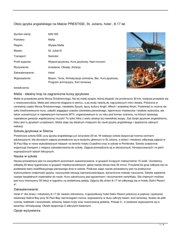 Obóz języka angielskiego na Malcie PRESTIGE, St. Julians, hotel , 8-17 lat Symbol oferty: 635/183 Państwo: Malta Region: Wyspa Malta Miasto: St. Julian'S Transport: Samolot Profil wyjazdu: Wyjazd językowy, Kurs językowy, Nad morzem Wyżywienie: śniadanie, Obiady, Kolacje Zakwaterowanie: Hotel Wyposażenie: Basen, Tenis, Klimatyzacja centralna, Bar, Kurs językowy, Program animacyjny, Kort tenisowy świadczenia: Malta - idealny kraj na zagraniczne kursy językowe Malta to prawdziwa perła Morza Śródziemnego. Na tej małej wyspie, której długość nie przekracza 30 km, tradycja przeplata się z nowoczesnością. Malta jest wiecznie skąpana w słońcu, a jej wody należą do najczystszych mórz świata. Położona w centralnej części Morza Śródziemnego, niedaleko Sycylii, łączy kultury Anglii, Włoch i arabskiej Afryki. Podziwiać tu można nie tylko średniowieczne mury, zabytki sięgające czasów człowieka pierwotnego, tajemnicze miasteczka i skaliste wybrzeża, ale także uczestniczyć w największym koncercie MTV, organizowanym tu co roku pod koniec czerwca, na którym śpiewają największe gwiazdy współczesnej muzyki! To tylko kilka z wielu atrakcji tej niewielkiej wyspy. Zaś dzięki językowi angielskiemu, który jest tu językiem urzędowym, Malta staje się idealnym miejscem do nauki języka angielskiego i spędzenia udanych wakacji. Szkoła językowa w Sliema Prestiżowa szkoła ESE uczy języka angielskiego już od prawie 20 lat. W wakacje szkoła dysponuje trzema centrami edukacyjnymi: dla dorosłych zajęcia prowadzone są w budynku głównym w St Julians, a dzieci i młodzież odbywają zajęcia w St Paul Bay w nowo wybudowanych klasach na terenie hotelu Coastline oraz w szkole w Pembroke. Szkoła codziennie organizuje transport z miejsca zakwaterowania do szkoły. Zajęcia prowadzone są w słonecznych, klimatyzowanych i w pełni wyposażonych salach lekcyjnych. Nauka w szkole Nauka prowadzona jest na wszystkich poziomach zaawansowania, w grupach liczących maksymalnie 15 osób. Uczestnicy odbędą 20 lekcji tygodniowo w grupach międzynarodowych, gdzie każda lekcja trwa 45 minut. Przydział do grup odbywa się na podstawie testu kwalifikacyjnego pierwszego dnia w szkole. Podczas zajęć nacisk prowadzony jest na praktyczne wykorzystanie znajomości języka, nauczyciele stosują najnowocześniejsze, dynamiczne metody nauczania. Szkoła zapewnia zestaw bezpłatnych materiałów do nauki. Kurs zakończony jest egzaminem i otrzymaniem certyfikatu. Dla chętnych możliwy jest kurs intensywny 30 lekcji w tygodniu za dodatkową opłatą. Zajęcia dla dzieci 8-17 lat odbywają się w hotelu Salini Resort 4*. Zakwaterowanie Hotel 4* dla dzieci i młodzieży 8-17 lat: świeżo odnowiony, 4-gwiazdkowy hotel Salini Resort położony w pięknej i spokojnej lokalizacji Salina Bay przy St Paul Bay nad brzegiem morza, wyposażony w duży odkryty basen, kort tenisowy, boisko do piłki nożnej, siatkówki i koszykówki, siłownię, basen kryty oraz nowoczesną jadalnię. Pokoje 3-, 4-osobowe wyposażone są w łazienkę i klimatyzację. Obiekt dysponuje 2 odkrytymi basenami. Opcje wyżywienia 1/4 3 posiłki dziennie: śniadania i obiadokolacje w miejscu zakwaterowania, pakowane lunche. Zajęcia pozalekcyjne by urozmaicić Twój kurs angielskiego w Sliema Program organizowany jest przez szkołę, dostosowany do zainteresowań każdej grupy wiekowej. W programie m.in. wycieczki kulturoznawcze, plażowanie, gry i zabawy zespołowe z rówieśnikami z innych krajów. Szkoła posiada ponadto 2 plażowe kluby dedykowane specjalnie dla uczestników - w Sliemie i St Julians. Szkoła organizuje czas wieczorami - gry i zabawy, wspólne wyjścia oraz wieczorne wycieczki. Transport Przelot grupowy z Warszawy, Krakowa, Wrocławia i Gdańska. Dzieci i młodzież odprawiane są przez przedstawiciela ATJ Lingwista i odbierane na lotnisku na Malcie przez polskiego opiekuna lub szkolnego przedstawiciela. Wszystkie przeloty z Warszawy są z opiekunem, a z innych miast na potwierdzenie. Opieka Podczas pobytu dzieci i młodzież znajdują się pod stałą opieką zagranicznej kadry oraz polskiego rezydenta. Ceny w PLN 2 tygodnie - 6 199 PLN/dziecko 3 tygodnie - 9 250 PLN/dziecko Cena za wyjazd językowy obejmuje Kurs języka angielskiego: 20 lekcji w tygodniu Zakwaterowanie w hotelu 4* Wyżywienie: 3 posiłki dziennie Transfer z/na lotnisko Opieka opiekuna / rezydenta Ubezpieczenie KL/NNW/NWS/bagaż Certyfikat ukończenia kursu Materiały do nauki Gadżety: zeszyt, długopis, T-shirt Dodatkowo płatne Dopłata do kursu intensywnego 30 lekcji w tygodniu dla uczestników 12-99 lat: 500 PLN/ tydzień. Transport: przelot z Warszawy 1350 PLN, przelot z Krakowa lub Wrocławia lub Gdańska od 900 PLN (cena biletu potwierdzona w dniu jego zakupu). Obowiązkowy program pozalekcyjny dla dzieci i młodzieży: 150 EUR/ 2 tygodnie, 210 EUR/ 3 tygodnie płatne opiekunowi. Informacje praktyczne Osoba wyjeżdżająca na kurs powinna zabrać ze sobą paszport lub dowód osobisty, 1 zdjęcie legitymacyjne, kostium kąpielowy, krem z filtrem, ręcznik plażowy, okrycie na głowę, adaptor do gniazdka elektrycznego. Sugerowane kieszonkowe: 150 Euro na 2 tygodnie Ubezpieczenie ATJ LINGWISTA gwarantuje Klientowi umowę ubezpieczeniową na okres wyjazdu: polisa SIGNAL IDUNA Polska Towarzystwo Ubezpieczeń S.A.. Z tytułu umowy Klientowi przysługują odszkodowania: od kosztów leczenia, od nieszczęśliwych wypadków, utrata bagażu. Kwoty ubezpieczenia: KL: (koszty leczenia) równowartość w PLN 10 000 EUR NNW: (nieszczęśliwe wypadki) 15000 PLN Bagaż: 800 PLN Istnieje możliwość zawarcia dodatkowego ubezpieczenia na wyższe kwoty za pośrednictwem naszej strony internetowej http://lingwista.com.pl/ubezpieczenia.html, jak również ubezpieczenie od kosztów rezygnacji z udziału w imprezie oraz od chorób przewlekłych (informacje na ten temat 2/4 dostępne w naszym biurze lub u agenta). TERMINY: od: 2017-06