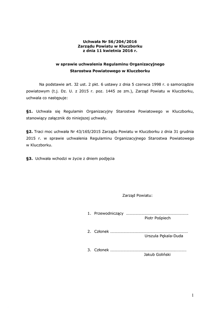 Regulamin Organizacyjny Starostwa Powiatowego w Kluczborku z