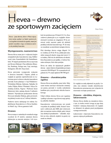TECHNOLOGIE Hevea – drewno ze sportowym zacięciem Hevea – jasne drewno, które w Polsce najczęściej można spotkać na halach sportowych, a szczególnie na kortach do squasha, znane jest przede wszystkim z tego, że dostarcza surowca do produkcji kauczuku. Występowanie, nazewnictwo Drewno Hevea znane jest w większości krajów europejskich jako kauczukowiec (ang. Rubberwood, niem. Kautschukholz lub Gummibaumholz). W krajach pochodzenia Hevea nazywana jest Hevaru (Malezja) i Para rubbertree (Brazylia), Rambung, Seringa rana, Capi, messinge, Seringueirs, Sibi-sibi i Kayu karet. Hevea pierwotnie występowała wyłącznie w dorzeczu Amazonki i Gujanie, jednak ze względu na ogromne zapotrzebowanie na wytwarzane przez to drzewo mleczko kauczukowe powstały liczne plantacje w Azji PołudniowoWschodniej (Malezja, Indonezja, Tajlandia, Sri Lanka, Filipiny, Birma i Wietnam) i Afryce Zachodniej (Liberia, Nigeria i Wybrzeże Kości Słoniowej), które zajmują obecnie 9 milionów hektarów. Największym producentem drewna Hevea jest aktualnie Malezja, gdzie powierzchnię plantacji ocenia się na 2 miliony hektarów. Naukowa nazwa należącego do rodziny Euphorbiaceae Kauczukowca to Hevea brasiliensis Muell. Arg. i Hevea guanensis Aubl. Drzewo Hevea rosnąca w naturalnych warunkach osiąga wysokość do 25 metrów, natomiast drzewa plantacyjne są znacznie mniejsze i ich wyso- 34 kość nie przekracza po 30 latach 10-12 m. Kauczukowce plantacyjne są ze względów ekonomicznych wycinane po osiągnięciu 30 lat, ponieważ wtedy znacznie spada ich zdolność produkcji mleczka kauczukowego. W ich miejsce nasadzane są natychmiast następne drzewa. Pień dorosłego drzewa osiąga długość 2-6 m i średnicę od 30 do 50 cm, jednak pnie naturalnie rosnących okazów mogą mieć nawet 1,5 m średnicy. Biel nie do odróżnienia od rdzenia. Kora Kauczukowca jest gładka, w kolorze brunatno-zielonym, liście duże potrójne. Hevea nie należy do najcięższych gatunków drewna – ciężar właściwy bezpośrednio po ścięciu wynosi ok. 850-950 kg/m3. Po wysuszeniu do wilgotności ok. 9% ciężar spada do 500-700 kg/m3. Drewno – charakterystka ogólna Drewno Hevea ma jednolity, jasny kolor. Miejscami można zauważyć nieznacznie ciemniejsze pasma, powstałe w wyniku uszkodzenia kambium przy pozyskiwaniu mleczka kauczukowego. Układ włókien drewna Hevea jest regularny i podłogi wykonane z tego drewna mają spokojny, jednolity charakter. Kauczukowiec wykorzystywany jest przede wszystkim do produkcji mebli, boazerii ściennych i sufitowych, płyt MDF, płyt wiórowych, jako wewnętrzna warstwa sklejki, palet i skrzyń oraz drobnych przedmiotów – szkatułek, stojaków na wino, zabawek, stojaków na gazety czy ramek na obrazki. Piotr Pióro Nazwy naukowe Hevea brasiliensis Muell. Arg. Nazwy handlowe Rubberwood, Kautschukholz, Gummibaumholz, Rambung Występowanie Naturalnie – Dorzecze Amazonki, Gujana Plantacje – Azja PołudniowoWschodnia, Afryka Zachodnia Zastosowanie Podłogi, równiez sportowe, meble, okładziny ścienne wewnątrz, MDF, płyty wiórowe, palety, skrzynie, drobne przedmioty dekoracyjne i użytkowe Obróbka mechaniczna Łatwa Klejenie Łatwe Lakierowanie Łatwe Ciężar właściwy (drewno mokre) 850-950 kg/m3 Ciężar właściwy (9-12%) 500-700 kg/m3 Twardość Janki 43 N/mm2 Moduł elastyczności 9 200 N/mm2 Wytrzymałość na ugięcie 66 N/mm2 Średni skurcz styczny 7,00% Średni skurcz promieniowy 3,80% Średni skurcz objętościowy 4,80% Współczynnik skurczu 0,17 Stabilność Dobra Trwałość Dobra Odporność na insekty Mała Karta charakterystyki: HEVEA Ze względu na małą odporność na grzyby i insekty oraz zmienne warunki atmosferyczne Kauczukowiec przeznaczony jest wyłącznie do stosowania wewnątrz pomieszczeń. Drewno - obróbka, klejenie, lakierowanie Drewno Hevea obrabia się stosunkowo łatwo, z tym, że trzeba zwrócić uwagę na jego dużą twardość i mniejszą elastyczność. Ze względu na skłonność do pękania przed przybijaniem wymaga nawiercania. Lakierowanie i olejowanie Kauczukowca nie sprawia większych problemów. Podłoga 1/2010 TECHNOLOGIE Posadzki z kauczukowca Oferta materiałów podłogowych z drewna Hevea dostępnych w Polsce obejmuje lite, dwulamelowe deski parkietowe, łączone na mikrowczepy (22 x 129 x 1830 mm), olejowane fabrycznie. Przy względnej wilgotności powietrza 50% i temperaturze 20°C Hevea osiąga stan równowagi higroskopijnej na poziomie ok. 9%, a więc podobnie jak nasze krajowe gatunki. Hevea charakteryzuje się jednak znacznie niższym współczynnikiem skurczu. Hevea - z plantacji na hale sportowe Hevea była początkowo uprawiana wyłacznie w celu pozyskiwania mleczka kauczukowego. Usuwanie wyciętych drzew wiązało się z dużymi kosztami, więc z czasem w krajach, gdzie znajdują się największe plantacje Kauczukowca, zaczęto wykorzystywać pozyskane drewno do produkcji mebli, płyt wiórowych i parkietów. Istniejące plantacje produkują rocznie 39 milionów metrów sześciennych drewna, z czego przerabiane jest ok. 5 milionów kubików, a reszta najczęściej spalana. Zapotrzebowanie na drewno Hevea wzrosło przed ok. 10 laty, gdy stopniały zasoby używanych dotychczas tropikalnych gatunków o podobnym wyglądzie i właściwościach, takich jak ramin, aghatis oraz japońskie nara i buna. Hevea zdobyła bardzo dużą popularność wśród firm specjalizujących się w produkcji profesjonalnych podłóg do squasha. Ten zdobywający w Polsce coraz większą rzeszę zwolenników sport stawia nawierzchni na korcie specyficzne wymagania. Podłoga przeznaczona do gry w squasha musi być równocześnie: • odpowiednio sprężysta, aby chronić gracza pochłaniając część energii i odciążając stawy sportowca w czasie niezwykle dynamicznych gier, oraz ustępując przy upadkach, • wystarczająco sztywna, aby zapewnić odpowiednie odbicie piłki, Podłoga 1/2010 • w jasnym kolorze, aby pędząca z du
