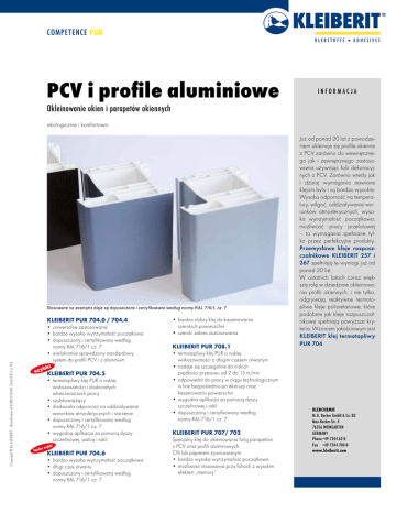 CompetenCE PUR PCV i profile aluminiowe Informacja Okleinowanie okien i parapetów okiennych ekologicznie i komfortowo Stosowane na zewnątrz kleje są dopuszczone i certyfikowane według normy RAL 716/1, cz. 7 Copyright © by KLEIBERIT – Brandname of KLEBCHEMIE GmbH & Co. KG KLEIBERIT PUR 704.0 / 704.4 • uniwersalne zastosowanie • bardzo wysoka wytrzymałość początkowa • dopuszczony i certyfikowany według normy RAL 716/1 cz. 7 • wielokrotnie sprawdzony standardowy system do profili PCV i z aluminium bki szy KLEIBERIT PUR 704.5 • termotopliwy klej PUR o niskiej wiskozowatości i doskonałych właściwościach pracy • szybkowiążący • doskonała odporność na oddziaływanie warunków atmosferycznych i starzenie • dopuszczony i certyfikowany według normy RAL 716/1 cz. 7 • wygodna aplikacja za pomocą dyszy szczelinowej, walca i rakli ybki o sz bardz KLEIBERIT PUR 704.6 • bardzo wysoka wytrzymałość początkowa • długi czas otwarty • dopuszczony i certyfikowany według normy RAL 716/1 cz. 7 • bardzo dobry klej do kaszerowania szerokich powierzchni • szeroki zakres zastosowania KLEIBERIT PUR 708.1 • termotopliwy klej PUR o niskiej wiskozowatości z długim czasem otwartym • nadaje się szczególnie do niskich prędkości przesuwu od 2 do 15 m/min • odpowiedni do pracy w ciągu technologicznym in-line bezpośrednio po ekstruzji oraz kaszerowaniu powierzchni • wygodna aplikacja za pomocą dyszy szczelinowej i rakli • dopuszczony i certyfikowany według normy RAL 716/1 cz. 7 KLEIBERIT PUR 707/ 702 Specjalny klej do okleinowania folią parapetów z PCV oraz profili aluminiowych CPL lub papierem żywicowanym • bardzo wysoka wytrzymałość początkowa • możliwość stosowania przy foliach z wysokim efektem „memory” Już od ponad 20 lat z powodzeniem okleinuje się profile okienne z PCV zarówno do wewnętrznego jak i zewnętrznego zastosowania używając folii dekoracyjnych z PCV. Zarówno wtedy jak i dzisiaj wymagania stawiane klejom były i są bardzo wysokie. Wysoka odporność na temperatury, wilgoć, oddziaływanie warunków atmosferycznych, wysoka wytrzymałość początkowa, możliwość pracy przelotowej – to wymagania spełniane tylko przez perfekcyjne produkty. Przemysłowe kleje rozpuszczalnikowe KLEIBERIT 257 i 267 spełniają te wymogi już od ponad 30 lat. W ostatnich latach coraz większą rolę w dziedzinie okleinowania profili okiennych, i nie tylko, odgrywają reaktywne termotopliwe kleje poliuretanowe, które podobnie jak kleje rozpuszczalnikowe spełniają powyższe kryteria. Wzorcem jakościowym jest KLEIBERIT klej termotopliwy PUR 704. KLEBCHEMIE M. G. Becker GmbH & Co. KG Max-Becker-Str. 4 76356 WEINGARTEN GERMANY Phone+49 7244 62-0 Fax +49 7244 700-0 www.kleiberit.com CompetenCE PUR KLEBSTOFFE • ADHESIVES •z dodatkiem 5% utwardzacza 870 osiąga wysoką odporność na temperatury, wilgoć i na starzenie •stosowany na zimno • nanoszony za pomocą rakli Kleje rozpuszczalnikowe • na bazie poliestrów •z dodatkiem 5% utwardzacza osiągają wysoką odporność na temperatury i wilgoć • dobra adhezja do tworzyw sztucznych i metali • bardzo dobra odporność na starzenie • dobra adhezja do tworzyw sztucznych i powierzchni metalowych (np. aluminium) • od 20 lat stosowany z powodzeniem na profilach zewnętrznych Zastosowanie: do okleinowania profili PCV, z drewna, materiałów drewnopochodnych i aluminiowych foliami termoplastycznymi, fornirem naturalnym i papierem. Reaktywne kleje termotopliwe PUR (poliuretany) KLEIBERIT kleje przemysłowe 257 i 261 do okleinowania profili PCV i aluminiowych foliami termoplastycznymi i papierem STOSOWANIE Kleje rozpuszczalnikowe Z klejami rozpuszczalnikowymi 257 i 261 z dodatkiem 5% utwardzacza 870 pracuje się na zimno. Ich aplikacja odbywa się za pomocą rakli na spodnią stronę materiału okleinującego. Przed kontaktem folii z profilem należy odparować większą część rozpuszczalnika w kanale suszarniczym lub na płytach grzewczych. Rolkami dociskowymi ustawionymi odpowiednio do geometrii profila dociskamy folię do profila. •oprócz fizycznego procesu wiązania dochodzi również do sieciowania chemicznego • to podnosi wyraźnie odporność na wilgoć i temperatury do 140°C Kleje termotopliwe PUR W zależności od rodzaju kleju posiadają one niską lub średnią wiskozowatość. Odznaczają się łatwym stapianiem, łatwością dozowania, dłuższym czasem otwartym, a także wysoką wytrzymałością początkową. Klej nanosi się przede wszystkim na spodnią stronę materiału okleinującego. Stosowane metody aplikacji to: nanoszenie za pomocą walca, rakli i dyszy szczelinowej. Temperatura nanoszenia zależy od danego kleju termotopliwego i wynosi od 100 do 140°C. Przygotowanie profila Profile PCV są z reguły myte, szczotkowane lub obdmuchiwane. Dodatkowo stosuje się filce nanoszące primer KLEIBERIT 831, 840 lub 848. Zadaniem primera jest czyszczenie, zmiękczanie powierzchni zewnętrznej profila oraz zmniejszenie napięcia powierzchniowego. Przez doprowadzenie ciepła odparowywuje się i wysusza primer, tym samym podgrzewa się profil do temperatury 45°C. KLEIBERIT kleje i primery do okleinowania profili i parapetów okiennych 2 PRIMER 3 zawiera rozpuszczalnik wiskozowatość w mPas 120°C 140°C temperatura nanoszenia predkość przesuwu m/min sposób nanoszenia W R S poliestr tak RT ok. 2000 m Pas RT 2-15 X PUR 704.0 PUR nie 30.000 15.000 120°C-140°C 15-35 X X X sprawdzony wg RAL 716/1, stosowany od 20 lat; bardzo kleisty, szerokie spektrum zastosowania PUR 704.4 PUR nie 33.000 17.000 120°C-140°C 15-40 X X X sprawdzony wg RAL 716/1; bardzo wysoka wytrzymałość początkowa, do skomplikowanych geometrycznie profili PUR 704.5 PUR nie 33.000 17.000 110°C-140°C 10-40 X X X o niskiej wiskozowatości, doskonały do dyszy szczelinowej, szybkowiążący, dopuszczony przez RAL PUR 704.6 PUR nie 60.000 33.000 110°C-140°C 5-40 X X X bardzo 