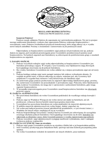 REGULAMIN BEZPIECZEŃSTWA PODCZAS PROWADZENIA ZAJĘĆ Szanowni Państwo! Poniższe zasady oddajemy Państwu do zapoznania się i potwierdzenia podpisem. Nie jest to przejaw naszego umiłowania biurokracji, a jedynie chęć zapewnienia Państwu większego bezpieczeństwa i oszczędzenia i nam i Państwu ewentualnych przykrych konsekwencji, które mogą zdarzyć się w wyniku nawet małych zaniedbań. Prosimy o zrozumienie i zastosowanie się do poniższych zasad. Odpowiadamy za bezpieczeństwo uczestników zajęć podczas ich prowadzenia (nie np. podczas dojścia na zajęcia), pod warunkiem przestrzegania przez Uczestników przedstawionych poniżej zasad bezpieczeństwa. Na każdych zajęciach nasi Instruktorzy są zobowiązani do poinformowania grupy o zasadach bezpieczeństwa na zajęciach. I. ZASADY OGÓLNE 1. Podczas wszystkich rodzajów zajęć osobą odpowiedzialną za bezpieczeństwo Uczestników jest Instruktor prowadzący zajęcia. W związku z tym Uczestnicy oraz Opiekunowie mają obowiązek bezwzględnego stosowania się do poleceń Instruktora. 2. Bez wiedzy Instruktora Uczestnikom nie wolno oddalać się z miejsca prowadzenia zajęć ani od reszty grupy. 3. Podczas każdego rodzaju zajęć może nastąpić mniejsze lub większe wybrudzenie ubrania. Ze względu na górski teren, w którym odbywają się zajęcia, wskazane jest, aby Uczestnicy byli zaopatrzeni w wygodne buty terenowe i strój dostosowany do charakteru zajęć. 4. Za zachowanie grupy podczas przebywania na zajęciach odpowiadają Opiekunowie grupy, prosimy, aby zachowanie Uczestników nie przeszkadzało w prowadzeniu zajęć. Polecenia, które Opiekunowie będą wydawać Uczestnikom, nie mogą stać w sprzeczności z poleceniami Instruktora, gdyż mogą zagrażać bezpieczeństwu. 5. W przypadku nieprzestrzegania przez Uczestników zasad bezpieczeństwa Instruktor ma obowiązek przerwać zajęcia. II. ZAJĘCIA ALPINISTYCZNE 1. Bez pozwolenia Instruktora nie wolno Uczestnikom podchodzić do wszelkiego rodzaju krawędzi i skarp. 2. Podczas zajęć na Wiadukcie Wiszącym nie wolno stawać ani siadać na barierkach, ani ich przekraczać, zwłaszcza linowej barierki stanowiącej granicę stanowiska. 3. Uczestnikom bez pozwolenia Instruktora nie wolno podchodzić do stanowisk alpinistycznych. 4. W pobliżu stanowisk alpinistycznych nie wolno biegać, skakać, popychać się. 5. Nie wolno pod żadnym pozorem zrzucać jakichkolwiek przedmiotów, w tym również śmieci, z Wiaduktu ani innych miejsc znajdujących się na wysokości. 6. Podczas bezpośredniego korzystania z atrakcji linowej Uczestnik jest zobowiązany do szczególnie uważnego słuchania poleceń Instruktora i bezwzględnego stosowania się do nich. Instruktor nie odpowiada za obrażenia i urazy, które Uczestnik poniesie w wyniku zignorowania jego poleceń. 7. Podczas wszystkich zajęć alpinistycznych występuje możliwość wybrudzenia, otarć i zadrapań (zwłaszcza podczas wspinaczki). III. ZAJĘCIA ŁUCZNICZE i inne na strzelnicy 1. Podczas zajęć grupa Uczestników przebywa na strzelnicy (Halla) lub w jej bezpośrednim pobliżu. 2. Jeśli Uczestnicy przebywają poza budynkiem Halli, sprawuje nad nimi kontrolę przynajmniej jeden opiekun. 3. Nie wolno Uczestnikom wchodzić do namiotów ani innych obiektów, poza toaletami. 4. Nie wolno Uczestnikom zdejmować ze ścian i półek żadnych elementów, stanowiących wyposażenie Halli, chyba, że pod opieką Instruktora. Uczestnicy będą odpowiadać finansowo za ewentualne zniszczenia. 5. Podczas strzelania (lub rzutów) pod żadnym pozorem nie wolno odwracać się z bronią w kierunku innych Uczestników, symulując strzał, ani z żadnego innego powodu. 6. Stanowisko strzeleckie Uczestnik opuszcza dopiero po pozwoleniu Instruktora (a nie po skończeniu strzelania), ze względu na ryzyko postrzelenia przez innych strzelających. 7. W Halli oraz na całym przyległym terenie istnieje całkowity zakaz używania otwartego ognia, w tym również palenia papierosów. Zakaz dotyczy także Opiekunów. IV. ZAJĘCIA TERENOWE 1. Podczas wszelkich wyjść w teren Instruktor jest zobowiązany wyznaczyć jednego z Opiekunów grupy do zamykania marszu. Opiekun ten powinien informować Instruktora o każdym przypadku pozostawania Uczestnika w tyle. 2. Instruktor jest zobowiązany dostosować tempo marszu do kondycji grupy oraz bezwzględnie dbać o zwartość grupy. 3. Instruktor jest zobowiązany liczyć Uczestników co jakiś czas, w związku z czym może prosić grupę o ustawienie się w szeregu lub dwuszeregu. 4. Uczestnikom nie wolno oddalać się od grupy bez pozwolenia Instruktora, a zwłaszcza w terenie fortecznym, gdzie grozi to upadkiem z wysokości i śmiercią. 5. Podczas wycieczek na teren Twierdzy pod żadnym pozorem nie wolno wchodzić w żadne miejsca, w które nie pozwolił wejść Instruktor, a zwłaszcza nie wolno podchodzić do krawędzi fos lub murów, wchodzić do pomieszczeń, jak również wybierać innych dróg przejścia niż ta, którą Instruktor wskazał. 6. Podczas zwiedzania kazamat i innych obiektów fortecznych należy z uwagą słuchać zaleceń Instruktora i się do nich stosować. 7. Na terenie fortecznym nie wolno biegać ani popychać się. 8. ZAJĘCIA NOCNE a) Podczas wszystkich zajęć nocnych Uczestnicy są zobowiązani wyposażyć się w latarki, w ilości przynajmniej 1 na 3 osoby. b) Ze względu na szczególny charakter terenu zaleca się, aby Uczestnicy mieli obuwie sznurowane ponad kostkę. c) We wszystkich zajęciach nocnych bierze udział przynajmniej dwóch Instruktorów, chyba, że zajęcia odbywają się z grupą poniżej 15 osób lub są to zajęcia stacjonarne. d) Podczas zajęć nocnych, a zwłaszcza podczas wypraw szlakiem tuneli i sztolni, istnieje duża możliwość poważnego wybrudzenia ubrania w błocie. e) W przypadku braku odpowiedniego ekwipunku (latarki, stroje i obuwie) zastrzegamy możliwość odwołania zajęć. 9. W przypadku, jeśli Uczestnik od