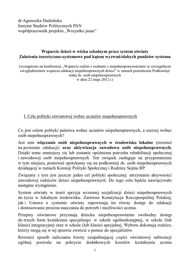 dr Agnieszka Dudzińska Instytut Studiów Politycznych PAN współpracownik projektu „Wszystko jasne” Wsparcie dzieci w wieku szkolnym przez system oświaty Założenia teoretyczno-systemowe pod kątem wyzwań/słabych punktów systemu (wystąpienie na konferencji „Wsparcie rodzin z osobami z niepełnosprawnościami ze szczególnym uwzględnieniem wsparcia edukacji niepełnosprawnych dzieci” w ramach posiedzenia Podkomisji stałej ds. osób niepełnosprawnych w dniu 22 maja 2012 r.) I. Cele polityki oświatowej wobec uczniów niepełnosprawnych Co jest celem polityki państwa wobec uczniów niepełnosprawnych, a szerzej wobec osób niepełnosprawnych? Jest nim włączanie osób niepełnosprawnych w środowisko lokalne (również na poziomie edukacji) oraz aktywizacja zawodowa osób niepełnosprawnych. Dzięki temu zmniejszy się lub zostanie opóźniona potrzeba rehabilitacji społecznej i zawodowej osób niepełnosprawnych. Ten związek zasługuje na przypomnienie w tym miejscu, ponieważ spotykamy się na podkomisji ds. osób niepełnosprawnych działającej w ramach Komisji Polityki Społecznej i Rodziny Sejmu RP. Związany z tym jest jeszcze jeden cel polityki społecznej: utrzymanie aktywności zawodowej rodziców dzieci niepełnosprawnych. Do tego celu będzie nawiązywało następne wystąpienie. System oświaty w teorii sprzyja wczesnej socjalizacji dzieci niepełnosprawnych do życia w lokalnym środowisku. Zarówno Konstytucja Rzeczpospolitej Polskiej, jak i Ustawa o systemie oświaty zapewniają im równy dostęp do edukacji i dostosowanie procesu nauczania do potrzeb i możliwości ucznia. Przepisy oświatowe przyznają dziecku niepełnosprawnemu swobodny dostęp do trzech form kształcenia specjalnego: w szkole ogólnodostępnej, w szkole (lub klasie) integracyjnej oraz w szkole (lub klasie) specjalnej. Wyboru dokonują rodzice, którzy mogą się w tej sprawie zwrócić o pomoc do specjalistów. Również sposób naliczania kwoty uzupełniającej części oświatowej subwencji ogólnej pozwala na pokrycie dodatkowych kosztów kształcenia ucznia 1 niepełnosprawnego niezależnie od formy kształcenia. Subwencja naliczana jest bowiem na dziecko, zależnie od wpisanej w orzeczeniu o potrzebie kształcenia specjalnego przyczyny niepełnosprawności, bez związku z typem placówki. Racjonalne podejście do prowadzonej polityki oświatowej zakłada okresową ocenę istniejących rozwiązań pod kątem osiąganych celów, a następnie wprowadzenie stosownych modyfikacji. Wielu rodziców dzieci niepełnosprawnych doznaje bolesnego zderzenia z systemem oświaty. Przekonują się oni – często początkowo z niedowierzaniem – że istniejące rozwiązania są w dużej mierze chybione w stosunku do celu, jakim jest włączanie osób niepełnosprawnych do społeczeństwa. Wielu uczniów niepełnosprawnych jest wypychanych z systemu oświaty, zwłaszcza ze szkół ogólnodostępnych i integracyjnych. Wydaje się, że okres niemal dwóch lat od podpisania przez Ministra Edukacji Narodowej pakietu rozporządzeń wykonawczych reformujących kształcenie specjalne jest wystarczający do tego, by dokonać wstępnej oceny z punktu widzenia końcowego odbiorcy tych rozwiązań, a więc niepełnosprawnego ucznia i jego rodziny. II. Rodzaje niepełnosprawności Niepełnosprawność to problem złożony. Obejmuje wiele różnych kategorii schorzeń. Pierwsze skojarzenie to niepełnosprawność ruchowa, ale pojęcie niepełnosprawności obejmuje też upośledzenie umysłowe (ponad połowa wszystkich uczniów niepełnosprawnych), autyzm czy problemy sensoryczne (wzrok, słuch). Niepełnosprawność ruchowa wynika często z przyczyn neurologicznych (mózgowe porażenie dziecięce). Niepełnosprawności sprzężone (więcej niż jedna) występują u 12% wszystkich uczniów z niepełnosprawnością. Ze względu na to zróżnicowanie niepełnosprawności, ich nasilenia, a także indywidualne różnice między dziećmi z tym samym rodzajem niepełnosprawności, mówienie o zapewnieniu każdemu uczniowi dwóch godzin zajęć rewalidacyjnych jest nieporozumieniem. Nie wszyscy w ogóle potrzebują dodatkowych zajęć, ponieważ ich wspieranie w procesie edukacji może wymagać zupełnie innych form. (Pomijając już samo dosłowne znaczenie słowa re-walidacja, pokrewnego słowu inwalida.) Rosnącym problemem dla systemu oświaty jest autyzm (w tym różne zaburzenia ze spektrum autyzmu, np. zespół Aspergera, całościowe zaburzenia rozwojowe). Na całym świecie odnotowuje się wzrost liczby osób dotkniętych z autyzmem. Dotyczy to zwłaszcza dzieci i nie wynika wyłącznie z lepszej diagnostyki. W Polsce uczniowie z autyzmem stanowią 4% uczniów niepełnosprawnych, co stanowi ok. 0,1% ogółu uczniów (jeden na tysiąc uczniów). Wliczając w to dzieci ze sprzężeniami, udział autyzmu wśród uczniów niepełnosprawnych wzrasta do 6%. 2 W przedszkolach sam autyzm bez sprzężeń jest jednak przyczyną wydania orzeczenia o potrzebie kształcenia specjalnego już w 25% przypadków uczniów niepełnosprawnych. Należy więc liczyć się z tym, że dzieci te wkrótce wejdą do szkół podstawowych. III. Statystyka W Polsce wg danych z ubiegłego roku szkolnego (2010/11) kształci się ok. 158 tys. uczniów niepełnosprawnych (posiadających orzeczenie z poradni psychologicznopedagogicznej) na poziomie od przedszkola do szkoły ponadgimnazjalnej. Stanowi to 2,4% z ogólnej liczby 6,5 mln uczniów. Najmniej uczniów niepełnosprawnych jest tam, gdzie nie ma obowiązku szkolnego – w przedszkolach i szkołach ponadgimnazjalnych (przedszkola 1%, szkoły podstawowe 2,8%, gimnazja 4,1%, szkoły ponadpodstawowe 1,7%). W placówkach niepublicznych kształci się jedynie 3,2% uczniów niepełnosprawnych (w por. z 10,4% dla ogółu uczniów). Wskaźnik ten jest znacząco wyższy wśród niepełnosprawnych przedszkolaków (15% w por. z 13% dla ogółu przedszkolaków), co świadczy o niezaspokojeniu p
