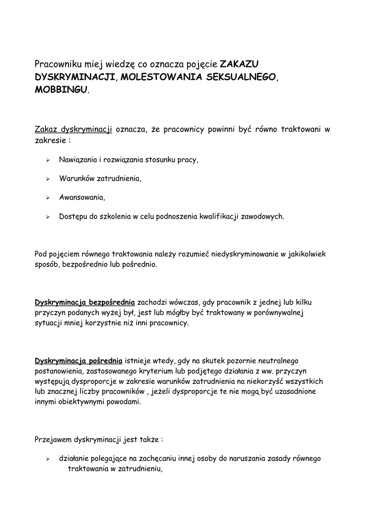 Pracowniku miej wiedzę co oznacza pojęcie ZAKAZU DYSKRYMINACJI, MOLESTOWANIA SEKSUALNEGO, MOBBINGU. Zakaz dyskryminacji oznacza, że pracownicy powinni być równo traktowani w zakresie : ➢ Nawiązania i rozwiązania stosunku pracy, ➢ Warunków zatrudnienia, ➢ Awansowania, ➢ Dostępu do szkolenia w celu podnoszenia kwalifikacji zawodowych. Pod pojęciem równego traktowania należy rozumieć niedyskryminowanie w jakikolwiek sposób, bezpośrednio lub pośrednio. Dyskryminacja bezpośrednia zachodzi wówczas, gdy pracownik z jednej lub kilku przyczyn podanych wyżej był, jest lub mógłby być traktowany w porównywalnej sytuacji mniej korzystnie niż inni pracownicy. Dyskryminacja pośrednia istnieje wtedy, gdy na skutek pozornie neutralnego postanowienia, zastosowanego kryterium lub podjętego działania z ww. przyczyn występują dysproporcje w zakresie warunków zatrudnienia na niekorzyść wszystkich lub znacznej liczby pracowników , jeżeli dysproporcje te nie mogą być uzasadnione innymi obiektywnymi powodami. Przejawem dyskryminacji jest także : ➢ działanie polegające na zachęcaniu innej osoby do naruszania zasady równego traktowania w zatrudnieniu, ➢ zachowanie, którego celem lub skutkiem jest naruszenie godności albo poniżenie lub upokorzenie pracownika (molestowanie). Dyskryminowaniem ze względu na płeć jest także molestowanie seksualne, czyli każde nieakceptowane zachowanie o charakterze seksualnym lub odnoszące się do płci pracownika, którego celem lub skutkiem jest naruszenie godności albo poniżenie albo upokorzenie pracownika. Na zachowanie takie mogą się składać fizyczne, werbalne lub pozawerbalne elementy. Za przejaw zachowania o podłożu seksualnym może być uznane : ➢ czynienie propozycji, domaganie się korzyści seksualnych albo proszenie o nie, ➢ obraźliwe flirtowanie, ➢ obraźliwe komentowanie wyglądu lub ubioru, ➢ szantaż seksualny. Natomiast za molestowanie „fizyczne” uważa się nalegające i pożądające spojrzenia, gesty, niesłużący nikomu dotyk, popychania, klepnięcia. Osoba, wobec której pracodawca naruszył zasadę równego traktowania w zatrudnieniu, ma prawo do odszkodowania w wysokości nie niższej niż minimalne wynagrodzenie za pracę (824 zł). Ciężar dowodu w sprawach o naruszenie nakazu równego traktowania w zatrudnieniu spoczywa na pracodawcy. To pracodawca musi udowodnić, że nie naruszył zakazu dyskryminacji kierując się w swoim zachowaniu wobec pracownika obiektywnymi powodami. Mobbing oznacza wszelkie działania lub zachowania dotyczące pracownika lub skierowane przeciwko pracownikowi, polegające na uporczywym i długotrwałym nękaniu lub zastraszaniu pracownika, wywołujące u niego zaniżoną ocenę przydatności zawodowej, powodujące lub mające na celu poniżenie lub ośmieszenie pracownika, izolowanie go lub wyeliminowanie z zespołu współpracowników. Za zachowania noszące cechy mobbingu można uznać: ➢ ➢ ➢ ➢ pomijanie przy awansach, przeciążanie nadmiarem pracy lub odwrotne zachowanie, czyli pozbawianie pracownika odpowiedzialnych zadań lub przydzielanie zadań poniżej kompetencji i umiejętności, nadmierne krytykowanie i kontrolowanie pracownika, lekceważące zachowanie w stosunku do pracownika, np. stałe przerywanie wypowiedzi. Pracownik, u którego mobbing wywołał rozstrój zdrowia, może na drodze sadowej dochodzić od pracodawcy odpowiedniej sumy tytułem zadośćuczynienia pieniężnego za doznaną krzywdę. Wysokości zadośćuczynienia nie określa przepis, pozostawiając tą kwestię do uznania sądu. Jednak w przypadku gdy pracownik, który wskutek mobbingu rozwiązał umowę, ma prawo dochodzić od pracodawcy odszkodowania w wysokości nie niższej niż minimalne wynagrodzenie za pracę. Obowiązek wykazania, że w stosunku do pracownika był stosowany mobbing należy jednak do niego samego.