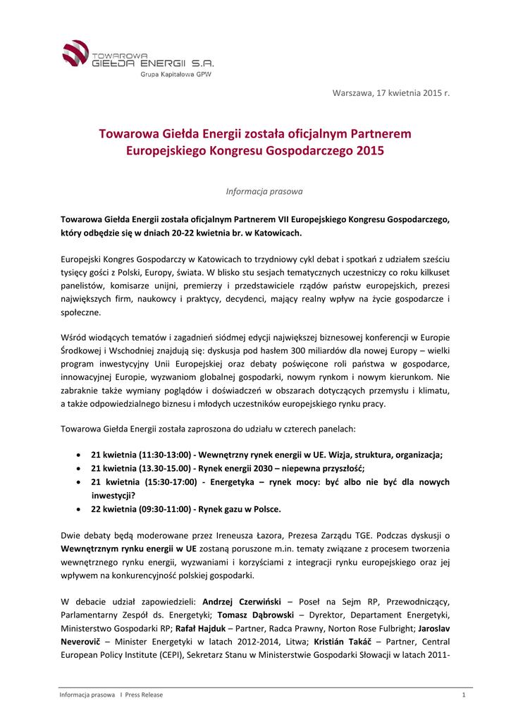 Warszawa, 17 kwietnia 2015 r. Towarowa Giełda Energii została oficjalnym Partnerem Europejskiego Kongresu Gospodarczego 2015 Informacja prasowa Towarowa Giełda Energii została oficjalnym Partnerem VII Europejskiego Kongresu Gospodarczego, który odbędzie się w dniach 20-22 kwietnia br. w Katowicach. Europejski Kongres Gospodarczy w Katowicach to trzydniowy cykl debat i spotkań z udziałem sześciu tysięcy gości z Polski, Europy, świata. W blisko stu sesjach tematycznych uczestniczy co roku kilkuset panelistów, komisarze unijni, premierzy i przedstawiciele rządów państw europejskich, prezesi największych firm, naukowcy i praktycy, decydenci, mający realny wpływ na życie gospodarcze i społeczne. Wśród wiodących tematów i zagadnień siódmej edycji największej biznesowej konferencji w Europie Środkowej i Wschodniej znajdują się: dyskusja pod hasłem 300 miliardów dla nowej Europy – wielki program inwestycyjny Unii Europejskiej oraz debaty poświęcone roli państwa w gospodarce, innowacyjnej Europie, wyzwaniom globalnej gospodarki, nowym rynkom i nowym kierunkom. Nie zabraknie także wymiany poglądów i doświadczeń w obszarach dotyczących przemysłu i klimatu, a także odpowiedzialnego biznesu i młodych uczestników europejskiego rynku pracy. Towarowa Giełda Energii została zaproszona do udziału w czterech panelach: 21 kwietnia (11:30-13:00) - Wewnętrzny rynek energii w UE. Wizja, struktura, organizacja; 21 kwietnia (13.30-15.00) - Rynek energii 2030 – niepewna przyszłość; 21 kwietnia (15:30-17:00) - Energetyka – rynek mocy: być albo nie być dla nowych inwestycji? 22 kwietnia (09:30-11:00) - Rynek gazu w Polsce. Dwie debaty będą moderowane przez Ireneusza Łazora, Prezesa Zarządu TGE. Podczas dyskusji o Wewnętrznym rynku energii w UE zostaną poruszone m.in. tematy związane z procesem tworzenia wewnętrznego rynku energii, wyzwaniami i korzyściami z integracji rynku europejskiego oraz jej wpływem na konkurencyjność polskiej gospodarki. W debacie udział zapowiedzieli: Andrzej Czerwiński – Poseł na Sejm RP, Przewodniczący, Parlamentarny Zespół ds. Energetyki; Tomasz Dąbrowski – Dyrektor, Departament Energetyki, Ministerstwo Gospodarki RP; Rafał Hajduk – Partner, Radca Prawny, Norton Rose Fulbright; Jaroslav Neverovič – Minister Energetyki w latach 2012-2014, Litwa; Kristián Takáč – Partner, Central European Policy Institute (CEPI), Sekretarz Stanu w Ministerstwie Gospodarki Słowacji w latach 2011- Informacja prasowa Ι Press Release 1 2012; Krisztián Tóth – Dyrektor Departamentu ds. Międzynarodowych, Hungarian Energy and Public Utility Regulatory Authority (MEKH). W trakcie panelu o Rynku gazu w Polsce wiodącymi tematami będą: bezpieczeństwo energetyczne w wymiarze politycznym i rynkowym, liberalizacja rynku gazu w Polsce oraz czy jesteśmy w stanie wykorzystać nasze zasoby infrastrukturalne i handlowe, by konkurować z rynkami europejskimi. W dyskusji udział zapowiedzieli: Mariusz Caliński – Prezes Zarządu, Grupa Duon SA; Tomasz Pepliński – Prezes Zarządu, Polskie LNG SA; Markus Rapp – Prezes Zarządu, EWE Polska Sp. z o.o.; Ireneusz Sawicki – Członek Zarządu, Handen Sp. z o.o.; Anna Seemann – Dyrektor ds. Oferty Produktowej, PKP Energetyka SA; Witold Szczypiński – Wiceprezes Zarządu, Dyrektor Generalny, Grupa Azoty SA; Piotr Szlagowski – Dyrektor Departamentu Strategii i Regulacji, PGNiG SA; Małgorzata Szymańska – Dyrektor, Departament Ropy i Gazu, Ministerstwo Gospodarki RP. Serdecznie zapraszamy na wszystkie sesje poświęcone energetyce i rynkowi gazu podczas Europejskiego Kongresu Gospodarczego w Katowicach. *** Towarowa Giełda Energii S.A. (TGE) powstała pod koniec 1999 roku. Jest jedyną licencjonowaną giełdą energii w Polsce. Działalność operacyjną rozpoczęła 30 czerwca 2000 roku. Uruchomienie TGE było jednym z pierwszych działań w kierunku liberalizacji polskiego rynku energii elektrycznej i prywatyzacji sektora elektroenergetycznego. Od lutego 2012 r. TGE jest wyłączną własnością Giełdy Papierów Wartościowych w Warszawie. TGE prowadzi rynki: energii elektrycznej (Rynek Terminowy Towarowy - RTT, Rynek Dnia Następnego - RDN, Rynek Dnia Bieżącego - RDB) oraz gazu (RTT, RDNg), a także Rynek Praw Majątkowych. Jest obecnie najbardziej dynamicznie rozwijającą się giełdą towarową w regionie. Potwierdza to przynależność do organizacji EUROPEX, promującej idee konsolidacji rynków energetycznych poprzez połączenia transgraniczne i zrzeszającej wszystkie towarowe i finansowe giełdy energii w Europie. Od grudnia 2010 TGE i Nord Pool Spot prowadzą połączone rynki dnia następnego na zasadach market coupling na połączeniu Swe-Pol Link łączącym Szwecję i Polskę. Łączny wolumen obrotu na rynkach energii elektrycznej Towarowej Giełdy Energii w 2014 r. wyniósł 186,8 TWh (wzrost o 5,8% w stosunku do 2013 r.), z czego na rynku spot (Rynek Dnia Następnego oraz Rynek Dnia Bieżącego) – 23,8 TWh (wzrost o 7,05% w porównaniu do 2013 r.), natomiast na Rynku Terminowym Towarowym – 163 TWh (wzrost o 5,6% w porównaniu do 2013 r.). Na parkiecie gazu ziemnego łączny wolumen obrotów osiągnął 111,6 TWh, co oznacza, że wzrósł w odniesieniu do wolumenu z 2013 r. prawie 47-krotnie. Na rynku spot gazu (Rynek Dnia Następnego gazu oraz Rynek Dnia Bieżącego gazu) – handel paliwem osiągnął wartość 6,6 TWh (15-krotny wzrost w stosunku do 2013 r.), a na Rynku Terminowym Towarowym - 105 TWh (53-krotny wzrost w porównaniu do 2013 r.). www.tge.pl Kontakt dla mediów: Towarowa Giełda Energii S.A.; Agata Samcik; [email protected], +48 885 885 645, +48 607 030 573. Informacja prasowa Ι Press Release 2