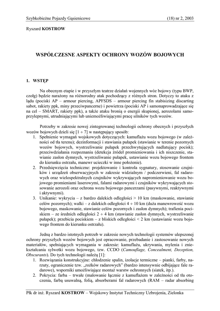 Szybkobieżne Pojazdy Gąsienicowe (18) nr 2, 2003 Ryszard KOSTROW WSPÓŁCZESNE ASPEKTY OCHRONY WOZÓW BOJOWYCH 1. WSTĘP Na obecnym etapie i w przyszłym teatrze działań wojennych wóz bojowy (typu BWP, czołg) będzie narażony na różnorodny atak pochodzący z różnych stron. Dotyczy to ataku z lądu (pociski AP – armour piercing, APFSDS – armour piercing fin stabisizing discarting sabot, rakiety ppk, miny przeciwpancerne) i powietrza (pociski AP i samonaprowadzające się na cel – SMART, rakiety ppk), a także ataku bronią o energii skupionej, aerozolami samoprzylepnymi, utrudniającymi lub uniemożliwiającymi pracę silników tych wozów. Potrzeby w zakresie nowej zintegrowanej technologii ochrony obecnych i przyszłych wozów bojowych dzieli się [1 7] w następujący sposób: 1. Spełnienie wymagań wojskowych dotyczących: kamuflażu wozu bojowego (w zależności od tła terenu); dezinformacji i stawiania pułapek (stawianie w terenie pozornych wozów bojowych, wystrzeliwanie pułapek przechwytujących nadlatujący pocisk); przeciwdziałania rozpoznaniu (detekcja źródeł promieniowania i ich niszczenie, stawianie zasłon dymnych, wystrzeliwanie pułapek, ustawianie wozu bojowego frontem do kierunku ostrzału, manewr ucieczki w inne położenie). 2. Przedsięwzięcia techniczne: projektowanie i kontrola sygnatury, stosowanie czujników i urządzeń obserwacyjnych w zakresie widzialnym / podczerwieni, fal radarowych oraz wielospektralnych czujników wykrywających napromieniowanie wozu bojowego promieniami laserowymi, falami radarowymi i czujników wykrywających stosowanie aerozoli oraz ochrona wozu bojowego pancerzami (pasywnymi, reaktywnymi i aktywnymi). 3. Unikanie: wykrycia – z bardzo dalekich odległości > 10 km (maskowanie, stawianie celów pozornych); walki – z dalekich odległości 4 10 km (duża manewrowość wozu bojowego, maskowanie, stawianie celów pozornych i zasłon dymnych); trafienia pociskiem – ze średnich odległości 2 4 km (stawianie zasłon dymnych, wystrzeliwanie pułapek); przebicia pociskiem – z bliskich odległości < 2 km (ustawianie wozu bojowego frontem do kierunku ostrzału). Jedną z bardzo istotnych potrzeb w zakresie nowych technologii systemów ulepszonej ochrony przyszłych wozów bojowych jest opracowanie, przebadanie i zastosowanie nowych materiałów, spełniających wymagania w zakresie: kamuflażu, ukrywania, mylenia i zniekształcania sylwetki wozu bojowego, tzw. CCDO (Camouflage, Concealment, Deception, Obscurants). Do tych technologii należą [1]: 1. Rozwiązania konstrukcyjne: chłodzenie spalin, izolacje termiczne – pianki, farby, narzuty, ograniczenie tzw. „rożków radarowych” (bardzo intensywnie odbijające fale radarowe), wsporniki umożliwiające montaż warstw ochronnych (siatek, itp.). 2. Pokrycia: farba – trwałe (malowanie łącznie z kamuflażem w zależności od tła otoczenia, farbą usuwalną, folią, absorberami fal radarowych (RAM – radar absorbing Płk dr inż. Ryszard KOSTROW – Wojskowy Instytut Techniczny Uzbrojenia, Zielonka Ryszard KOSTROW 3. 4. 5. 6. 7. material), z zastosowaniem konstrukcji, umożliwiających konwekcję ciepłego powietrza. Materiały tekstylne: brezenty, siatki kamuflażowe. Wielospektralna technologia „stealth”; kształtowanie powierzchni wozu bojowego, pokrycia absorpcyjne, materiały z anizotropowym współczynnikiem odbicia / przewodności pozornej, baldachimy odbijające fale radarowe, kopuły o częstotliwości selektywnej. Technologie zaadaptowane: osłony ochraniające w widmie ultrafioletu, widzialnym, bliskiej podczerwieni, pokrycia i osłony emitujące, materiały termiczne / materiały strukturalne, pokrycia i osłony radarowo aktywne. Materiały zniekształcające sylwetkę wozu bojowego: naturalne efekty zniekształcające, zasłony dymne wielospektralne. Urządzenia mylące – szybko wystrzeliwane pułapki (z wozu bojowego i / lub innych wyrzutni). 2. WYNIKI PRAC WITU 2.1. Ochrona pancerna wozów bojowych Na tle tak szerokich wymagań stawianych wozom bojowym ochrona bezpośrednia tj. ochrona pancerna wydaje się być najważniejsza, gdyż wobec wszystkich zabiegów różnego rodzaju kamuflażu wozu bojowego zawsze istnieje prawdopodobieństwo trafienia go pociskiem. Obecnie pociski są szczególnie groźne, gdyż potrafią niszczyć pancerz stalowy RHA (roled homogeneous armour) o grubości: 80 150 mm (pociski EFP –explosively formed projectile atakujące z góry i z boku), 500 600 mm (pociski APFSDS), 600 1300 mm (pociski kumulacyjne zwykłe HEAT – high explosive anti-tank oraz tandemowe HEAT-RA high explosive anti-tank reactive armour). Wobec takiego zagrożenia obecnie jedyny sposób uniknięcia przebicia wozu bojowego zwłaszcza czołgu jest stosowanie jednocześnie: kompozytowych pancerzy z ceramiką umieszczonych w wieży i w płycie przedniej czołgu przed przebiciem pociskami APFSDS oraz kaset reaktywnych umieszczonych na płycie przedniej, z przodu, boku i górnej części wieży oraz bocznych fartuchach do ochrony przed przebiciem pociskami HEAT i HEAT-RA. Pancerze kompozytowe z ceramiką stosowane są na zagranicznych czołgach (np. Chalanger), a w Polsce zamierza się stosować w przyszłości pancerz CAWA-2 w czołgu PT-91 Twardy [8 10] zamiast dotychczasowego piasku znajdującego się w wieży i zamiast płyt szkłotekstolitowych w płycie przedniej (Rys. 1). Współczesne aspekty ochrony wozów bojowych Rys. 1. Przekrój poprzeczny wieży i przedniej części kadłuba czołgu PT-91 Twardy z pancerzem CAWA-2 1 – płyty stalowe RHA, 2 – pancerz CAWA-2, 3 – kasety ERAWA-1, 4 – kasety ERAWA-2, 5 – piasek Efektywność masowa i efektywność grubości modelu takiego pancerza wynosi odpowiednio 1,62 i 1,16, co oznacza, że masa i grubość takiego pancerza jest odpowiednio o 62% i 16% mniejsza od pancerza RHA o takiej samej zdolności ochronnej [8]. Kompozytowy pancerz ceramiczny jako pancerz dodatkowy stosuje się n