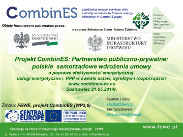 combining energy services with subsidy schemes to finance energy efficiency in Central Europe Objęty honorowym patronatem przez: oraz przez Sekretarza Stanu Adama Zdziebło Projekt CombinES: Partnerstwo publiczno-prywatne: polskie samorządowe wdrożenia umowy o poprawę efektywności energetycznej. usługi energetyczne i PPP w świetle ustaw, dyrektyw i rozporządzeń www.combines-ce.eu Sosnowiec 21.05.2014r. Źródła: FEWE, projekt CombinES (WP2,6) Szymon Liszka [email protected] Jan Twardowski [email protected] Ontologia- źródła i wiążące definicje pojęć: • Prawo energetyczne (1997), • Dyrektywa 2004/18/WE dot. zamówień publ. • Dyrektywa 2006/32/WE -ESD efektywnego końcowego wykorzystania energii i USŁUG ENERGETYCZNYCH • Ustawa o partnerstwie publiczno-prywatnym (2006-2009) • Ustawa prawo zamówień publicznych (2011) • Ustawa o efektywności energetycznej (2011) 2 Ontologia 2- źródła przyszłych definicji pojęć: • Dyrektywa 2012/27/UE – EED w sprawie efektywności energetycznej • Rozporządzenie 1303/2013/UE – (XII) dot. funduszy strukturalnych „operacja PPP” • Umowa Partnerstwa-projekt RM-8stycznia • Dyrektywa 2014/24/UE z dnia 26lutego br. w sprawie zamówień publicznych (…), • Zapisy Programów Operacyjnych 3 Geneza i cele programu CombinES W Europie Środkowej najczęściej stosowanymi mechanizmami wsparcia efektywności energetycznej (EE) są subsydia i dotacje bezpośrednie. Zbyt rzadko uwzględniane są możliwości współfinansowania EE za pośrednictwem „strony trzeciej” poprzez mechanizm umowy o efekt energetyczny (EPC lub EnPC - energy performance contracting). Umowy EnPC finansują poprawiające efektywność energetyczną inwestycje o kilkuletnim okresie zwrotu. Objęcie skutecznym i sprawdzonym mechanizmem EnPC inwestycji o długim okresie zwrotu wymaga dodatkowego wsparcia odpowiednimi programami subsydiów i dotacji. CombinES –kończy właśnie 2 pierwsze etapy: ocenę rynku EnPC oraz krajowych programów wsparcia. Rozpoczęte są prace nad propozycjami zmian w programach i stworzenie rekomendacji dla nowego unijnego programu łączącego finansowanie EE z umowami EnPC. Zasada outsourcing-u zakup z zewn. tańszym rozwiązaniem Zapraszam na www.combines-ce.eu , www.fewe.pl 4 Projekt CombinES skupia się na połączeniu usług energetycznych z mechanizmami ich wsparcia i promuje wzorcowe rozwiązania umożliwiające sfinansowanie obniżenia kosztów energii i wydatków ponoszonych przez użytkownika np. Jest to możliwe dzięki wprowadzeniu przedsięwzięć poprawiających efektywność energetyczną, realizowanych w oparciu o elementy umów o osiągnięcie efektu energetycznego /idea ESCO (EnPC - Energy Performance Contracting) 5 Polska rzeczywistość • Wiele przepisów=brak prawa, strategii, a przede wszystkim KONSEKWENCJI czyli realizacji i wdrożeń. W ZP- zamówieniach publicznych: • Brak praktyki zawierania umów o poprawę EE, o oszczędność energii – mimo opłacalności (poszerzanie zakresu) – gospodarności- nie jakość, trwałość lecz minimalizacja nakładu początkowego – ekologia – nie jest kluczowa - dotacje 6 Polska: EPC przez PPP w ZP Jako PPP i EPC – CombinES wskazał na dwa pionierskie - projekty, oba : – – – – – – w procedurze dialogu konkurencyjnego jako ”usługa energetyczna” i PPP w ZP, o maksymalnym i racjonalnym zakresem, poza długiem publicznym i JST, z wieloletnim zarządzaniem energią, z gwarancją efektu. Jeden z nich quasihybrydowy – czyli uzyskał wsparcie-dotację- nie UE 7 Wróćmy do ontologii: • EPC czy EnPC, PPP, quasihybryda,..a: "usługa energetyczna" oznacza fizyczną korzyść, udogodnienie lub pożytek pochodzące z połączenia zużycia energii z wykorzystywaniem technologii energooszczędnych lub działań, które mogą obejmować czynności, utrzymanie i kontrolę niezbędne do świadczenia danej usługi, która jest świadczona na podstawie umowy i która w normalnych okolicznościach prowadzi do sprawdzalnej i wymiernej lub możliwej do oszacowania poprawy efektywności energetycznej lub do oszczędności energii pierwotnej to działanie na podstawie umowy, które prowadzi do sprawdzalnej oszczędności energii. czy JST gotowa jest do OUTSOURCING-u? 8 … w pigułce Radzionków pokrótce Karczew w pigułce Dialog konkurencyjny – potencjał z PZP Dodatkowo: Projekt Umowa Partnerstwa • Nowe: – rozporządzenie w sprawie f.strukturalnych • wyjątkowe usytuowanie PPP – Dyrektywy w sprawie • efektywności energetycznej (od czerwca 2014r) • zamówień publicznych -pakiet 2014+2lata max • WNIOSKI i przestrogi 9 Pionier 2009- Radzionków: cele Celem było uzyskanie korzyści w wydatkach ponoszonych na energię cieplną i elektryczną poprzez Zamówienie: wykonanie prac termomodernizacyjnych budynkow oświatowych wraz z realizacją wszelkich działań modernizacyjnych mających na celu zmniejszenie kosztow energii cieplnej (w tym rownież gazu) i energii elektrycznej. Uzyskanie oszczędności w ogólnym zużyciu energii cieplnej + +gwarancji!! Wartością dodaną projektu podniesienie standardu użytkowania 5-ciu budynków przez użytkownikow oraz obniżenie uciążliwości dla otoczenia poprzez zmniejszenie emisji dwutlenku węgla do atmosfery 10 Pionier Radzionków 4 szkoły i przedszkole Ocieplenie budynku wymiana stolarki okiennej renowacja źródeł ciepła. Modernizacja oświetlenia Umowa EnPC/PPP Inwestycja ogółem 8mln zł (spłacana w części z przyszłych oszczędności w kosztach, bez dotacji, + %) Finansowanie właściciela placówek ok.60 %- (3mln. z oszczędności). Utrzymanie – system zarządzanie energią w budynku przez 10 lat ok.80 tys. na rok, płatne kwartalnie 11 Radzionków: Best Practice Pomimo niskich cen energii • 1. ZREALIZOWALNY • 2. Sprawdzone rzadkie ścieżki PPP + dialog • 3. Do oszczędności + WKŁAD WŁASNY • 4. Rozwiązuje problem wskaźnika długu • 5. Przynosi efekty ekol