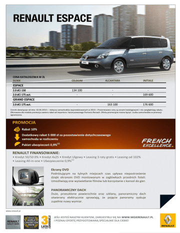 CENA KATALOGOWA W ZŁ SILNIK CELSIUM ALCANTARA INITIALE 134 100 - - 169 600 - 163 100 176 600 ESPACE 2.0 dCi 150 2.0 dCi 175 aut. GRAND ESPACE 2.0 dCi 175 aut. Cennik obowiązuje od dnia 02.06.2014 r. i dotyczy samochodów wyprodukowanych w 2014 r. Prezentowane ceny są cenami katalogowymi i nie uwzględniają rabatu. Oferowana dla modelu promocja zawiera rabat od importera i Autoryzowanego Partnera Renault. Oferty promocyjne można łączyć. Liczba samochodów w promocji ograniczona. Rabat 10% Dodatkowy rabat 5 000 zł za pozostawienie dotychczasowego samochodu w rozliczeniu Pakiet ubezpieczeń 0,9%(1) RENAULT FINANSOWANIE: • Kredyt 50/50 0% • Kredyt 4x25 • Kredyt Ulgowy • Leasing 3 raty gratis • Leasing od 102% • Leasing All-in-one • Ubezpieczenie 0,9%(1) Ekrany DVD Podróżującym na tylnych miejscach czas upływa niepostrzeżenie dzięki ekranom DVD montowanym w zagłówkach przednich foteli. Umożliwiają one wyświetlanie filmów lub korzystanie z konsol do gier. PANORAMICZNY DACH Duże, przeszklone powierzchnie oraz szklany, panoramiczny dach otwierany elektrycznie sprawiają, że pojęcie panoramy zyskuje zupełnie nowy wymiar. JEŚLI JESTEŚ NASZYM KLIENTEM, ZAREJESTRUJ SIĘ NA WWW.MOJERENAULT.PL I POZNAJ OFERTĘ PRZYGOTOWANĄ SPECJALNIE DLA CIEBIE! WYPOSAŻENIE Celsium Alcantara Initiale ● 2 500 ● ● ● 2 500 ● ● ● ● 0 ● ● ● ● ● ● - ● ● 7 650 ● ● 7 650 ● ● ● ● ● ● ● ● ● ● ● ● ● ● ● ● ● ● ● ● ● ● ● ● ● ● 1 300 / P ● ● ● ● ● ● ● 1 680 / P ● ● ● ● ● ● ● ● ● ● ● ● ● ● ● ● 1 180 / P ● ● ● ● 5 300 / P 600 / P ● 350 / P ● ● ● 1 180 / P ● ● ● ● 5 300 / P ● 350 ● ● ● ● ● ● ● ● ● ● ● ● ● ● 1 880 / P ● ● 1880 ● ● ● ● ● ● ● ● ● ● ● ● ● ● ● 1060 / P ● 250 290 ● ● ● 1060 ● 250 290 ● ● ● 1060 ● 290 WYGLĄD ZEWNĘTRZNY Zewnętrzne klamki drzwi w kolorze matowego chromu Lakier metalizowany Lakier niemetalizowany Listwy ozdobne przednich błotników w kolorze nadwozia Obudowy lusterek wstecznych oraz dolna listwa wzdluż przedniej szyby i przednich bocznych szyb w kolorze Czarna Perła Obręcze kół ze stopu metali lekkich 17˝ wzór Eptius ciemnografitowe Obręcze kół ze stopu metali lekkich 17" wzór Monterey Poprzeczki dachowe w kolorze nadwozia Elektrycznie otwierany, panoramiczny, szklany dach z regulowną przesłoną WYGLĄD WEWNĘTRZNY Klamka wewnętrzna w kolorze matowego chromu Obramowania nawiewów w desce rozdzielczej w kolorze czarnym błyszczącym Pdświetlane pokrętła nawiewów w desce rozdzielczej Obramowania głośników w drzwiach w kolorze matowego chromu Środkowa konsola w kolorze czarnym błyszczącym Środkowa konsola w kolorze czarnym błyszczącym z napisem Initiale Płaty drzwi pokryte skórą ekologiczną w kolorze ciemnografitowym z przeszyciami w kolorze beżowym Czteroramienna, skórzana kierownica z przyciskami regulatora-ogranicznika prędkości Skórzana gałka dźwigni zmiany biegów w kolorze ciemnografitowym ze wstawką w kolorze matowego chromu Mieszek osłony dźwigni zmiany biegów ze skóry ekologicznej w kolorze ciemnografitowym PROWADZENIE AUTA System wspomagania parkowania tyłem System wspomagania parkowania przodem i tyłem System wspomagania parkowania przodem i tyłem z kamerą cofania Elektroniczny klakson Układ kierowniczy ze wspomaganiem Automatyczny hamulec postojowy, elektromechaniczny Komputer pokładowy Regulator - ogranicznik prędkości Karta Renault Hands Free WIDOCZNOŚĆ Czujnik deszczu i światła Funkcja oświetlania drogi do domu Follow me home Podgrzewana tyna szyba Otwierana szyba w klapie bagażnika Atermiczna przednia szyba Przyciemniane boczne szyby Reflektory przeciwmgłowe Reflektory halogenowe ze światłami do jazdy dziennej wykonanymi w technologii LED Reflektory ksenonowe ze światłami do jazdy dziennej wykonanymi w technologii LED Spryskiwacze reflektorów Wewnętrzne lusterko wsteczne z przełącznikiem dzień / noc Fotochromatyczne wewnętrzne lusterko wsteczne Elektrycznie regulowane, składane i podgrzewane lusterka wsteczne, asferyczne po stronie kierowcy, z wbudowanym czujnikiem temperatury zewnetrznej KOMFORT I ELEMENTY WYSTROJU WNĘTRZA Automatyczna klimatyzacja z możliwością regulacji z przodu Automatyczna klimatyzacja z możliwością regulacji z przodu i z tyłu Kierownica z regulacją ustawienia w pionie i poziomie KOMFORT I ELEMENTY WYSTROJU WNĘTRZA C.D Kierownica z regulacją ustawienia w pionie i poziomie Elektryczne, impulsowe podnośniki szyb z przeodu i z tyłu, z funkcją zapobiegania przycięciu palców Osłona przeciwsłoneczna po stronie kierowcy i pasażera z lusterkiem zamykanym, przesuwaną klapką oraz dodatkowa, wysuwana środkowa osłona przeciwsłoneczna Wewnętrzny uchwyt opuszczania klapy bagażnika 3 gniazda 12V 2 żaluzje przeciwsłoneczne 4 żaluzje przeciwsłoneczne 6 żaluzji przeciwsłonecznych Dywaniki podłogowe w 1. rzędzie Dywanik podłogowe w 1. i 2. rzędzie Dywaniki podłogowe w 1., 2. i 3. rzędzie Celsium Alcantara Initiale Zdejmowane podłokietniki tylnych foteli z regulacją nachylenia Pogrzewane fotele przednie - 1 600 ● ● ● Przednie fotele regulowane manualnie ● ● - Przednie fotele regulowane elektrycznie - - ● Tylne siedzenia z wbudowanymi pasami bezpieczeństwa, składane do położenia stolika, mocowane na prowadnicach, przystosowane do mocowania fotelików dziecięcych ISOFIX ● ● ● 3 720 5 400 7 080 ● - - SIEDZENIA - TAPICERKA 2 dodatkowe tylne fotele Tapicerka materiałowa wykonana w technologii Teflon ® z elementami skóry ekologicznej w kolorze ciemnografitowym Tapicerka z alkantary z elementami skóry ekologicznej w kolorze ciemnografitowym 3 900 ● - Tapicerka skórzana z elementami skóry ekologicznej w kolorze ciemnografitowym - - ● Tapicerka skórzana z elementami skóry ekologic