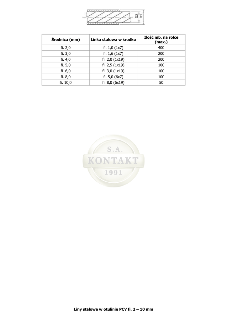 Średnica (mm) Linka stalowa w środku Ilość mb. na rolce (max.) fi. 2,0 fi. 1,0 (1x7) 400 fi. 3,0 fi. 1,6 (1x7) 200 fi. 4,0 fi. 2,0 (1x19) 200 fi. 5,0 fi. 2,5 (1x19) 100 fi. 6,0 fi. 3,0 (1x19) 100 fi. 8,0 fi. 5,0 (6x7) 100 fi. 10,0 fi. 8,0 (6x19) 50 Liny stalowe w otulinie PCV fi. 2 – 10 mm