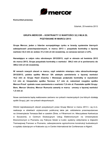 Komunikat prasowy Gdańsk, 25 kwietnia 2013 GRUPA MERCOR – KONTRAKTY O WARTOŚCI 32,3 MLN ZŁ POZYSKANE W MARCU 2013 Grupa Mercor, jeden z liderów europejskiego rynku w branży systemów biernych zabezpieczeń przeciwpożarowych, w marcu 2013 r. pozyskała kontrakty o łącznej wartości 32,3 mln zł, wobec 31,2 mln zł rok wcześniej, co oznacza wzrost o 3,5%. Narastająco w całym roku obrotowym 2012/2013, czyli w okresie od kwietnia 2012 do marca 2013, Grupa pozyskała kontrakty o wartości 394,3 mln zł w porównaniu do 389,2 mln zł rok wcześniej. W ramach nowych zleceń w marcu, czyli ostatnim miesiącu roku obrachunkowego 2012/2013, polska spółka Mercor SA zdobyła zamówienia o łącznej wartości 16,2 mln zł. Grupa Hasil (Czechy i Słowacja) podpisała kontrakty w wysokości 3,3 mln zł, hiszpańska spółka Tecresa: 3,7 mln zł, natomiast rosyjska spółka Mercor-Proof zyskała nowe zamówienia o wartości 7,6 mln zł. Pozostałe spółki Grupy: Bem, Mercor Ukraina, Mercor Rumunia zawarły w marcu umowy o łącznej wartości 1,5 mln zł. Nowe zamówienia będą realizowane zarówno na rynkach macierzystych (na których działają spółki Grupy), jak i na rynkach eksportowych. Wśród najciekawszych zleceń pozyskanych przez Grupę Mercor w marcu 2013 r. są m.in. realizacje w obiektach użyteczności publicznej takie jak: oddzielenia przeciwpożarowe na Uniwersytecie Tomasza Bati w czeskim Żlinie, w Filharmonii im. Mieczysława Karłowicza w Szczecinie, w Centrum Edukacyjnym Usług Elektronicznych na Uniwersytecie Ekonomicznym w Poznaniu czy Fabryce Sztuki w Łodzi; systemy oddymiania w Zajezdni Tramwajowej Franowo w Poznaniu; zabezpieczenia ogniochronne konstrukcji budowlanych w szpitalu dziecięcym w Krakowie czy w Centre International de Conferences w Algierii. Grupa Mercor zawarła także kontrakty na wykonanie zabezpieczeń nieruchomości komercyjnych: − w centrach handlowych, m.in. systemów oddymiania w Centrum Handlowym Felicity w Lublinie, oddzieleń przeciwpożarowych w Centrum Handlowo-Usługowym Brama Pomorza w Chojnicach; oddzieleń przeciwpożarowych i systemów oddymiania w Tesco na Słowacji; systemów oddymiania w Centrum Handlowym Leroy Merlin na Ukrainie. − w centrach biurowych, m.in. oddzieleń przeciwpożarowych w Aquarius Business House oraz biurowcu Green Day we Wrocławiu, Alchemii Office Park w Gdańsku czy Żoliborz One w Warszawie. W sektorze przemysłowym i produkcyjnym Grupa – zgodnie z nowymi kontraktami – wykona m.in. systemy oddymiania w fabryce rakiet wojennych w miejscowości Niżnyj Nowogrod w Rosji, w fabryce mebli włoskich Rimi zlokalizowanej w obwodzie moskiewskim i oraz w fabryce drutów do cięcia kryształów Terwingo również na terenie Federacji Rosyjskiej; oddzielenia przeciwpożarowe w centrum logistycznym Schenker w Czechach; systemy oddymiania w hali produkcyjnej Matador – należącej do producenta opon Continental Matador – na Słowacji oraz w zakładzie produkcyjnym Synthos w Czechach. W Polsce w sektorze przemysłowym i produkcyjnym Grupa wykona m.in. oddzielenia przeciwpożarowe i systemy wentylacji w zakładzie produkcji elementów hamulcowych Bosch we Wrocławiu czy zabezpieczenia ogniochronne w zakładzie produkcji tworzyw sztucznych Megaform w Elblągu. Marzec kończy nasz rok obrotowy 2012/2013. Jesteśmy zadowoleni z wartości pozyskanych w tym czasie zamówień. Jest ona zbliżona do poziomu ubiegłorocznego, pomimo trudniejszej sytuacji rynkowej. Podpisaliśmy wiele prestiżowych kontraktów zarówno w Polsce jak i za granicą. Przed nami kolejny pracowity rok. Naszym celem jest dalsze zdobywanie rynków eksportowych – poprzez zwiększanie sprzedaży w krajach, w których jesteśmy już obecni oraz wchodzenie na nowe rynki zbytu. Jednocześnie umacniamy naszą pozycję na rynkach macierzystych, na których zlokalizowane są nasze spółki handlowe i zakłady produkcyjne - mówi Krzysztof Krempeć, Prezes Zarządu Mercor SA. 2 Dodatkowych informacji udzielają: Beata Cioczek, M+G Aleksandra Gierjatowicz, Mercor SA Tel. (22) 416 01 02, 508 385 432 Tel. (58) 341 42 45 w.140, 609 462 186 e-mail: [email protected] e-mail: [email protected] Grupa Mercor jest jednym z liderów europejskiego rynku w branży systemów biernych zabezpieczeń przeciwpożarowych i największym podmiotem branży w Polsce. Spółka oferuje produkty i usługi we wszystkich segmentach rynku biernych zabezpieczeń przeciwpożarowych, którymi są: oddzielenia przeciwpożarowe, systemy oddymiania i odprowadzania ciepła, systemy wentylacji pożarowej i zabezpieczenia ogniochronne konstrukcji budowlanych. Grupę kapitałową Mercor tworzą: Mercor SA (Polska, podmiot dominujący), Mercor Ukraina sp. z o.o. (Ukraina), Mercor Fire Protection Systems S.R.L. (Rumunia), Hasil a.s. (Czechy) i Hasil s.r.o. (Słowacja), Tecresa Protecction Pasiva (Hiszpania), BEM sp. z o.o. (Polska) oraz Mercor Proof (Rosja). Grupa posiada 8 zakładów produkcyjnych w 7 krajach w Europie, zatrudnia ok. 1000 pracowników. Imponującą listę realizacji Grupy Mercor tworzą m.in. obiekty takie jak Giełda Papierów Wartościowych w Warszawie, Stadion Narodowy, Stadion PGE Arena, Hotel Westin, Hotel Hilton, Narodowy Bank Polski, Biblioteka Narodowa, Poznańskie Centrum Finansowe, Galeria Kazimierz w Krakowie, Złote Tarasy, Zakłady Chemiczne Puławy, Zakłady Chemiczne Dwory, Zakłady Azotowe Puławy, Rondo 1, Domoteka, PKN Orlen Płock, Canal Plus Cyfrowa. Na rynku czeskim Grupa może pochwalić się takimi realizacjami jak: Narodowy Bank Czeski, hotele Four Seasons, Hilton, Le Palais, Marriott, SAS Radisson, sieci sklepów Hypernova, Kaufland, Tesco, a na rynku hiszpańskim do klientów Tecresa Catalunya zaliczają sie m.in. Ikea, Peugeot, Coca-Cola, Whirpool, Flex, Sanitas, Opel i wiele, wiele innych. Od lipca 2007 roku akcje Mercor SA notowane są na GPW. Dodatkowe informacje dostępne także na www.mercor.com.pl 3
