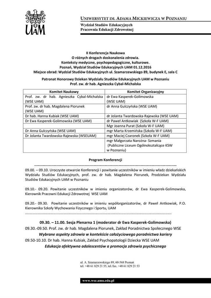 Wydział Studiów Edukacyjnych Pracownia Edukacji Zdrowotnej II Konferencja Naukowa O różnych drogach doskonalenia zdrowia. Konteksty medyczne, psychopedagogiczne, kulturowe. Poznań, Wydział Studiów Edukacyjnych UAM 01.12.2016 Miejsce obrad: Wydział Studiów Edukacyjnych ul. Szamarzewskiego 89, budynek E, sala C Patronat Honorowy Dziekan Wydziału Studiów Edukacyjnych UAM w Poznaniu Prof. zw. dr hab. Agnieszka Cybal-Michalska Komitet Naukowy Komitet Organizacyjny Prof. zw. dr hab. Agnieszka Cybal-Michalska dr Ewa Kasperek-Golimowska (WSE UAM) (WSE UAM) Prof. zw. dr hab. Magdalena Piorunek dr Anna Gulczyńska (WSE UAM) (WSE UAM) Dr hab. Hanna Kubiak (WSE UAM) dr Jolanta Twardowska-Rajewska (WSE UAM) Dr Ewa Kasperek-Golimowska (WSE UAM) dr Paweł Antkowiak (Szkoła W-F UAM) Mgr Joanna Purat (Szkoła W-F UAM) Dr Anna Gulczyńska (WSE UAM) mgr Marta Krzemińska (Szkoła W-F UAM) Dr Jolanta Twardowska-Rajewska (WSEUAM) mgr Maciej Czaronek (Szkoła W-F UAM) mgr Małgorzata Narożna- Szmania (Publiczne Liceum Ogólnokształcące KSW w Poznaniu) Program Konferencji …………………………………………………….………………………………………………………………………………… 09.00. – 09.10. Uroczyste otwarcie Konferencji i powitanie uczestników w imieniu władz dziekańskich Wydziału Studiów Edukacyjnych, prof. zw. dr hab. Magdalena Piorunek, Prodziekan Wydziału Studiów Edukacyjnych UAM w Poznaniu 09.10.- 09.20. Powitanie uczestników w imieniu organizatorów, dr Ewa Kasperek-Golimowska, Kierownik Pracowni Edukacji Zdrowotnej WSE UAM 09.20.- 09.30. Powitanie uczestników w imieniu współorganizatorów, dr Paweł Antkowiak, P.O. Kierownika Szkoły Wychowania Fizycznego i Sportu, UAM ..................................................................................................................................................... 09.30. – 11.00. Sesja Plenarna 1 (moderator dr Ewa Kasperek-Golimowska) 09.30.-09.50. Prof. zw. dr hab. Magdalena Piorunek, Zakład Poradnictwa Społecznego WSE Wybrane aspekty zdrowia w kontekście całożyciowego poradnictwa kariery 09.50-10.10. Dr hab. Hanna Kubiak, Zakład Psychopatologii Dziecka WSE UAM Edukacja afektywna adolescentów a promocja zdrowia psychicznego ul. A. Szamarzewskiego 89, 60-568 Poznań tel. +48 61 829 21 55, tel./fax. +48 61 829 21 53 www.wse.amu.edu.pl Wydział Studiów Edukacyjnych Pracownia Edukacji Zdrowotnej 10.10.-10.30. Dr Agata Woźniak, Gnieźnieńska Szkoła Wyższa Milenium w Gnieźnie, Pracownia Psychologiczno-Pedagogiczna w Poznaniu Zintegrowany model pomagania. Zastosowanie w praktyce edukacji zdrowotnej 10.30 – 10.50. Mgr Wiesław Banaś, Wydział Oświaty, Urząd Miasta Poznania Jak zdrowie łączy pokolenia 10.50.-11.00. Studenci dla zdrowia. Prezentacja prozdrowotna studentów II roku II stopnia specjalności Animacja czasu wolnego i rekreacja ruchowa ………………………………………………………………………………………………………………………………………….. 11.00.- 11.30. - Przerwa na kawę …………………………………………………………………………………………………………………………………………… 11.30.-13.30. Sesja plenarna 2 (moderator dr Jolanta Twardowska-Rajewska, mgr Marta Krzemińska) 11.30.-11.50. mgr Małgorzata Narożna-Szmania, Publiczne Liceum Ogólnokształcące KSW w Poznaniu Dobry klimat w szkole a zdrowie uczniów, nauczycieli i rodziców 11.50.-12.10. mgr Agnieszka Kaczmarczyk, mgr Beata Frankiewicz Polskie Stowarzyszenie Pedagogów i Animatorów KLANZA, Oddział w Poznaniu Jak pracować i nie zwariować – o profilaktyce wypalenia zawodowego w pracy nauczyciela 12.10.-12.30. mgr Elwira Machowiak, Fundacja „Dr Clown”, Oddział Poznań Prozdrowotne walory śmiechoterapii. Z doświadczeń działalności Fundacji „Dr Clown” 12.30.- 12.50. mgr Igor Rotberg, psycholog, terapeuta Między zdrowym dążeniem do zdrowia i szczęścia a obsesją 12.50.- 13.10. mgr Beata Witczak Ośrodek Doskonalenia Nauczycieli w Poznaniu, Zespół Szkół Licealno-Technicznych, ul. 28 Czerwca 1956 r. 352/360 w Poznaniu Szkolna edukacja zdrowotna wobec tematyki HIV/AIDS – przykłady działań 13.10.-13.20. Studenci dla zdrowia. Prezentacja prozdrowotna studentów III roku specjalności Socjoterapia i promocja zdrowia ……………………………………………………………………………………………………………………………………………… 13.30.- 14.30 przerwa na lunch ……………………………………………………………………………………………………………………………………………… ul. A. Szamarzewskiego 89, 60-568 Poznań tel. +48 61 829 21 55, tel./fax. +48 61 829 21 53 www.wse.amu.edu.pl Wydział Studiów Edukacyjnych Pracownia Edukacji Zdrowotnej 14.30.-17.30. Sesja plenarna 3 (moderator dr Anna Gulczyńska, mgr Małgorzata- Narożna-Szmania) 14.30.-14.50. mgr Alina Baturo, mgr Małgorzata Mochacz, Klinika Gastroenterologii, Dietetyki i Chorób Wewnętrznych, Uniwersytet Medyczny w Poznaniu Zdrowe żywienie – dobry styl życia 14.50.-15.10. mgr Maciej Czaronek, mgr Marta Krzemińska, Dr Fryderyk Musielak, Szkoła Wychowania Fizycznego i Sportu, UAM Promowanie aktywności ruchowej wśród studentów – przykłady nowoczesnych rozwiązań marketingowych 15.10.-15.30. dr Jakub Wieczorek, mgr Violetta Prusińska, Szkoła Wychowania Fizycznego i Sportu, UAM Motywy uczestnictwa studentów UAM w prozdrowotnych zajęciach ruchowych 15.30 – 15.50 dr Jolanta Twardowska - Rajewska Pracownia Edukacji Zdrowotnej WSE UAM Zdrowi rodzice- zdrowe dzieci – profilaktyka prenatalna 15.50 - 16.10. dr Patrycja Rąglewska Zakład Fizykoterapii i Odnowy Biologicznej AWF Poznań, dr Renata Śleboda Poznańskie Centrum Relaksacji i Terapii Ruchem GARUDA, Poznań, dr Małgorzata Woźniewicz - 