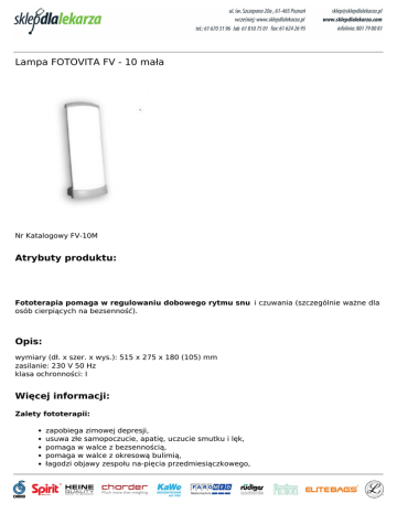 Lampa FOTOVITA FV - 10 mała Nr Katalogowy FV-10M Atrybuty produktu: Fototerapia pomaga w regulowaniu dobowego rytmu snu i czuwania (szczególnie ważne dla osób cierpiących na bezsenność). Opis: wymiary (dł. x szer. x wys.): 515 x 275 x 180 (105) mm zasilanie: 230 V 50 Hz klasa ochronności: I Więcej informacji: Zalety fototerapii: zapobiega zimowej depresji, usuwa złe samopoczucie, apatię, uczucie smutku i lęk, pomaga w walce z bezsennością, pomaga w walce z okresową bulimią, łagodzi objawy zespołu na-pięcia przedmiesiączkowego, jest tańsza od farmakoterapii, jest bezpieczna, można ją stosować nawet u kobiet w ciąży i podczas karmienia, nie powoduje skutków ubocznych. Fototerapia jest skuteczna w 80 proc. przypadków i nie powoduje skutków ubocznych. Jej efekty widać już po kilku dniach. Fototerapia jest bardzo wygodna - można ją stosować w warunkach domowych. Fototerapia pomaga w regulowaniu dobowego rytmu snu i czuwania (szczególnie ważne dla osób cierpiących na bezsenność). Ułatwia życie osobom pracującym na zmiany oraz ludziom podróżującym między kontynentami, którzy cierpią na syndrom jet lag spowodowany zmianą stref czasowych. Fototerapia nie może być stosowana jedynie u osób zażywających leki, które wywołują nadwrażliwość na światło oraz u ludzi ze schorzeniami narządu wzroku. DANE TECHNICZNE: napięcie zasilania: 230 V 50 Hz pobór mocy: 80 W sposób zasilania świetlówek: przez przetwornice wysokiej częstotliwości (HF) natężenie oświetlenia: 3 200 lx w odległości 50 cm, 1 800 lx w odległości 75 cm trwałość świetlówek: 10 000 godzin pracy klasa zabezpieczenia ppor.: 1 klasa ochronności: I wymiary: 515 x 275 x 180 (105) mm Leczenie światłem jest bezbolesne i nie niesie ze sobą niebezpieczeństwa poparzenia skóry, ponieważ lampy nie emitują promieniowania ultrafioletowego. Objawy niepożądane, jak podrażnienie oczu czy ból głowy, występują sporadycznie i dają się łatwo wyeliminować poprzez skrócenie czasu naświetlania i zwiększenie odległości od źródła światła. Naświetlanie należy rozpocząć natychmiast po zaobserwowaniu pierwszych objawów depresji sezonowej lub na tydzień przed zmianą czasu z letniego na zimowy. Fototerapię powinno stosować się dwa razy dziennie: rano i wczesnym wieczorem (co najmniej na dwie godziny przed snem). Zaleca się, aby każdy seans trwał od 30 do 60 minut. Pacjent powinien siedzieć w odległości około pół metra przed lampą i co chwila spoglądać w światło. Powered by TCPDF (www.tcpdf.org)