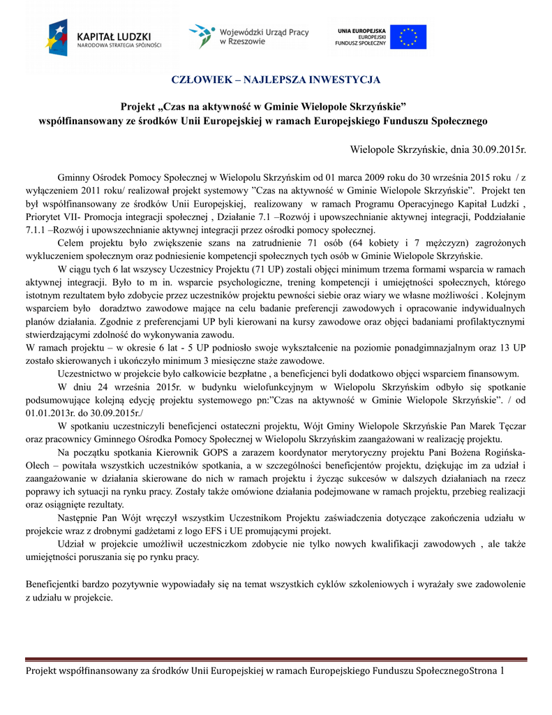 CZCZ CZŁOWIEK – NAJLEPSZA INWESTYCJA Projekt „Czas na aktywność w Gminie Wielopole Skrzyńskie” współfinansowany ze środków Unii Europejskiej w ramach Europejskiego Funduszu Społecznego Wielopole Skrzyńskie, dnia 30.09.2015r. Gminny Ośrodek Pomocy Społecznej w Wielopolu Skrzyńskim od 01 marca 2009 roku do 30 września 2015 roku / z wyłączeniem 2011 roku/ realizował projekt systemowy ”Czas na aktywność w Gminie Wielopole Skrzyńskie”. Projekt ten był współfinansowany ze środków Unii Europejskiej, realizowany w ramach Programu Operacyjnego Kapitał Ludzki , Priorytet VII- Promocja integracji społecznej , Działanie 7.1 –Rozwój i upowszechnianie aktywnej integracji, Poddziałanie 7.1.1 –Rozwój i upowszechnianie aktywnej integracji przez ośrodki pomocy społecznej. Celem projektu było zwiększenie szans na zatrudnienie 71 osób (64 kobiety i 7 mężczyzn) zagrożonych wykluczeniem społecznym oraz podniesienie kompetencji społecznych tych osób w Gminie Wielopole Skrzyńskie. W ciągu tych 6 lat wszyscy Uczestnicy Projektu (71 UP) zostali objęci minimum trzema formami wsparcia w ramach aktywnej integracji. Było to m in. wsparcie psychologiczne, trening kompetencji i umiejętności społecznych, którego istotnym rezultatem było zdobycie przez uczestników projektu pewności siebie oraz wiary we własne możliwości . Kolejnym wsparciem było doradztwo zawodowe mające na celu badanie preferencji zawodowych i opracowanie indywidualnych planów działania. Zgodnie z preferencjami UP byli kierowani na kursy zawodowe oraz objęci badaniami profilaktycznymi stwierdzającymi zdolność do wykonywania zawodu. W ramach projektu – w okresie 6 lat - 5 UP podniosło swoje wykształcenie na poziomie ponadgimnazjalnym oraz 13 UP zostało skierowanych i ukończyło minimum 3 miesięczne staże zawodowe. Uczestnictwo w projekcie było całkowicie bezpłatne , a beneficjenci byli dodatkowo objęci wsparciem finansowym. W dniu 24 września 2015r. w budynku wielofunkcyjnym w Wielopolu Skrzyńskim odbyło się spotkanie podsumowujące kolejną edycję projektu systemowego pn:”Czas na aktywność w Gminie Wielopole Skrzyńskie”. / od 01.01.2013r. do 30.09.2015r./ W spotkaniu uczestniczyli beneficjenci ostateczni projektu, Wójt Gminy Wielopole Skrzyńskie Pan Marek Tęczar oraz pracownicy Gminnego Ośrodka Pomocy Społecznej w Wielopolu Skrzyńskim zaangażowani w realizację projektu. Na początku spotkania Kierownik GOPS a zarazem koordynator merytoryczny projektu Pani Bożena RogińskaOlech – powitała wszystkich uczestników spotkania, a w szczególności beneficjentów projektu, dziękując im za udział i zaangażowanie w działania skierowane do nich w ramach projektu i życząc sukcesów w dalszych działaniach na rzecz poprawy ich sytuacji na rynku pracy. Zostały także omówione działania podejmowane w ramach projektu, przebieg realizacji oraz osiągnięte rezultaty. Następnie Pan Wójt wręczył wszystkim Uczestnikom Projektu zaświadczenia dotyczące zakończenia udziału w projekcie wraz z drobnymi gadżetami z logo EFS i UE promującymi projekt. Udział w projekcie umożliwił uczestniczkom zdobycie nie tylko nowych kwalifikacji zawodowych , ale także umiejętności poruszania się po rynku pracy. Beneficjentki bardzo pozytywnie wypowiadały się na temat wszystkich cyklów szkoleniowych i wyrażały swe zadowolenie z udziału w projekcie. Projekt wspołłfinansowany za słrodkołw Unii Europejskiej w ramach Europejskiego Funduszu SpołecznegoStrona 1