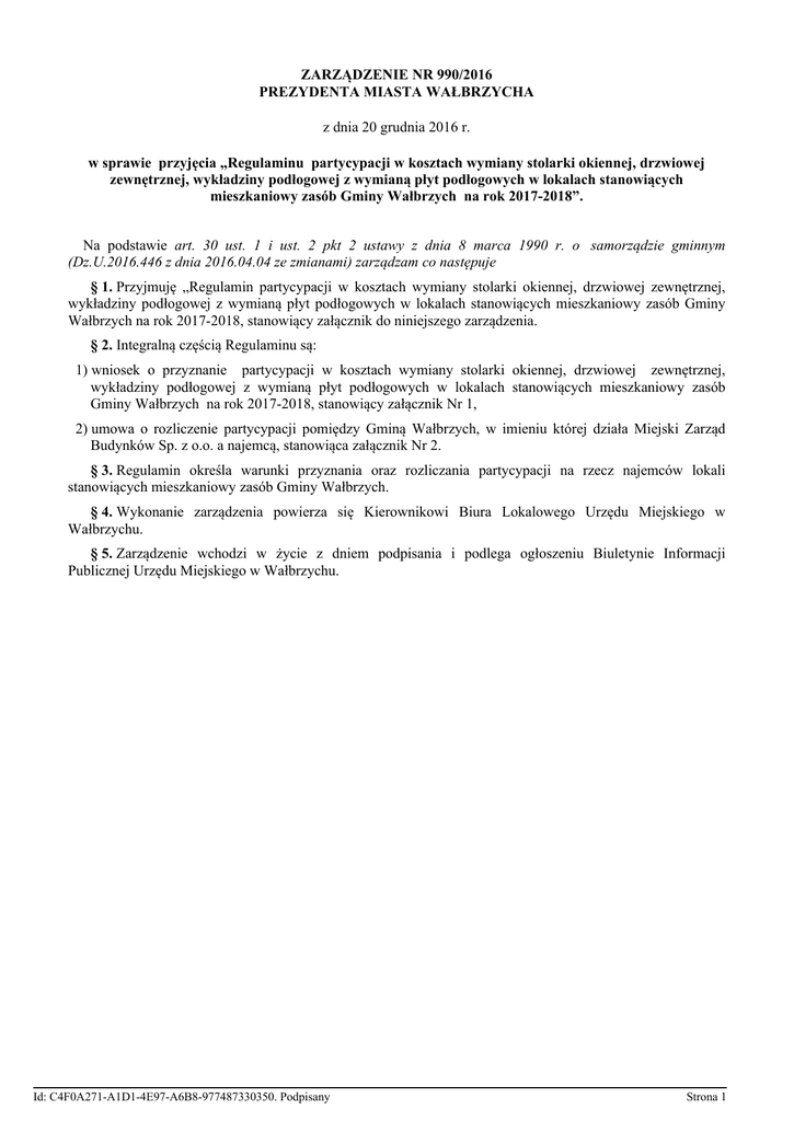 ZARZĄDZENIE NR 990/2016 PREZYDENTA MIASTA WAŁBRZYCHA z dnia 20 grudnia 2016 r. w sprawie przyjęcia „Regulaminu partycypacji w kosztach wymiany stolarki okiennej, drzwiowej zewnętrznej, wykładziny podłogowej z wymianą płyt podłogowych w lokalach stanowiących mieszkaniowy zasób Gminy Wałbrzych na rok 2017-2018”. Na podstawie art. 30 ust. 1 i ust. 2 pkt 2 ustawy z dnia 8 marca 1990 r. o samorządzie gminnym (Dz.U.2016.446 z dnia 2016.04.04 ze zmianami) zarządzam co następuje § 1. Przyjmuję „Regulamin partycypacji w kosztach wymiany stolarki okiennej, drzwiowej zewnętrznej, wykładziny podłogowej z wymianą płyt podłogowych w lokalach stanowiących mieszkaniowy zasób Gminy Wałbrzych na rok 2017-2018, stanowiący załącznik do niniejszego zarządzenia. § 2. Integralną częścią Regulaminu są: 1) wniosek o przyznanie partycypacji w kosztach wymiany stolarki okiennej, drzwiowej zewnętrznej, wykładziny podłogowej z wymianą płyt podłogowych w lokalach stanowiących mieszkaniowy zasób Gminy Wałbrzych na rok 2017-2018, stanowiący załącznik Nr 1, 2) umowa o rozliczenie partycypacji pomiędzy Gminą Wałbrzych, w imieniu której działa Miejski Zarząd Budynków Sp. z o.o. a najemcą, stanowiąca załącznik Nr 2. § 3. Regulamin określa warunki przyznania oraz rozliczania partycypacji na rzecz najemców lokali stanowiących mieszkaniowy zasób Gminy Wałbrzych. § 4. Wykonanie zarządzenia powierza się Kierownikowi Biura Lokalowego Urzędu Miejskiego w Wałbrzychu. § 5. Zarządzenie wchodzi w życie z dniem podpisania i podlega ogłoszeniu Biuletynie Informacji Publicznej Urzędu Miejskiego w Wałbrzychu. Id: C4F0A271-A1D1-4E97-A6B8-977487330350. Podpisany Strona 1 Id: C4F0A271-A1D1-4E97-A6B8-977487330350. Podpisany Strona 1 REGULAMIN PARTYCYPACJI W KOSZTACH WYMIANY STOLARKI OKIENNEJ, DRZWIOWEJ ZEWNĘTRZENEJ ( wejściowej do mieszkań), WYKŁADZINY PODŁOGOWEJ WRAZ Z WYMIANĄ PŁYT PODŁOGOWYCH NA LATA 2017-2018. I. Postanowienia ogólne. 1. Partycypacja w kosztach wymiany stolarki okiennej , stolarki drzwiowej zewnętrznej, wykładziny podłogowej wraz z wymianą płyt podłogowych w lokalach mieszkalnych, przysługuje wyłącznie najemcom lokali stanowiących zasób mieszkaniowy Gminy Wałbrzych. 2. O partycypacje w kosztach może ubiegać się najemca nie posiadający zaległości w opłatach czynszowych lub najemca, który zawarł porozumienie na spłatę zadłużenia, a w momencie przyznania partycypacji spłacił co najmniej należność główną. 3. O partycypację nie mogą ubiegać się najemcy lokali socjalnych. II. Zasady kwalifikacji stolarki okiennej, drzwi zewnętrznych, wykładziny, płyt podłogowych. 1. Podstawą wyrażenia zgody na partycypację w kosztach wymiany stolarki okiennej, drzwiowej zewnętrznej, wykładziny podłogowej wraz z wymianą płyt podłogowych jest zakwalifikowanie przez służby techniczne MZB Sp. z o.o. do wymiany okien, drzwi zewnętrznych, wykładziny i płyt podłogowych. 2. Określając warunki partycypacji, zarządca podaje parametry stolarki okiennej i drzwiowej, jaka może być zamontowana w mieszkaniu gminnym, ilość metrów wymiany wykładziny oraz płyt podłogowych. III. Zasady wymiany i podstawy udzielenia partycypacji. 1. Wymianę stolarki okiennej, drzwiowej zewnętrznej, wykładziny, płyt podłogowych najemca wykonuje we własnym zakresie po otrzymaniu zgody właściciela tj. Gminy Wałbrzych w imieniu i na rzecz której działa Miejski Zarząd Budynków Sp. z o.o. 2. W zamian za wykładzinę podłogową najemca może ułożyć panele podłogowe bądź płytki ceramiczne podłogowe, jednak wysokość partycypacji za wykonanie tych prac będzie taka jak za ułożenie wykładziny i płyt podłogowych. 3. W przypadku robót związanych z wymianą stolarki okiennej i drzwiowej w obiektach wpisanych do rejestru zabytków przed przystąpieniem do realizacji robót należy uzyskać decyzję w tym zakresie od Wojewódzkiego Konserwatora Zabytków oraz uzyskać pozwolenie na budowę z Biura Administracji Architektoniczno-Budowlanej Urzędu Miejskiego w Wałbrzychu. 4. Po wykonaniu prac najemca zgłasza fakt wymiany w MZB Sp. z o.o ( właściwy BOK ) celem dokonania odbioru wykonanych prac. Id: C4F0A271-A1D1-4E97-A6B8-977487330350. Podpisany Strona 1 5. Podstawą udzielenia partycypacji w kosztach na powyższe prace są następujące dokumenty: - zgoda na wykonanie prac ( zgoda wyrażona na wniosku o przyznanie partycypacji stanowiącym załącznik nr 1 do niniejszego regulaminu ), - podpisanie umowy na wykonanie powyższych prac, umowa według wzoru stanowiącego załącznik nr 2 do niniejszego regulaminu, - protokół odbioru prac, - oryginał faktury VAT za wykonaną usługę, - uzyskanie pozwolenia na budowę z Biura Administracji Architektoniczno-Budowlanej Urzędu Miejskiego w Wałbrzychu - w przypadku wykonywania robót związanych z wymianą stolarki okiennej i drzwiowej w obiektach wpisanych do rejestru zabytków. 6. Wysokość partycypacji na lata 2017-2018: - partycypacja w kosztach wymiany stolarki okiennej wynosi 300 zł za m2 okna przeszklonego. Kwota ta obejmuje wszelkie koszty montażu nowych okien, - partycypacja w kosztach wymiany stolarki drzwiowej zewnętrznej wraz z ościeżnicą wynosi 500 zł za sztukę. Kwota ta obejmuje wszelkie koszty montażu nowych drzwi, - partycypacja w kosztach wymiany wykładziny za 1 m2 wynosi 17 zł, - partycypacja w kosztach wymiany płyt podłogowych za 1m2 wynosi: 20 zł. 7. Partycypacja będzie zaliczona na poczet opłat bieżących w okresie: • 12 miesięcy dla prac, których wartość robót nie przekracza 800 zł ( brutto ), • 24 miesięcy dla prac, których wartość robót przekracza 800 zł ( brutto ). Realizacja partycypacji rozpocznie się miesiąc po protokolarnym odbiorze prac pod warunkiem wcześniejszego skompletowania dokumentów, o których mowa w pkt. II.2. W przypadku rozwiązania umowy najmu, zamiany/zdania lokalu, pozostała do z