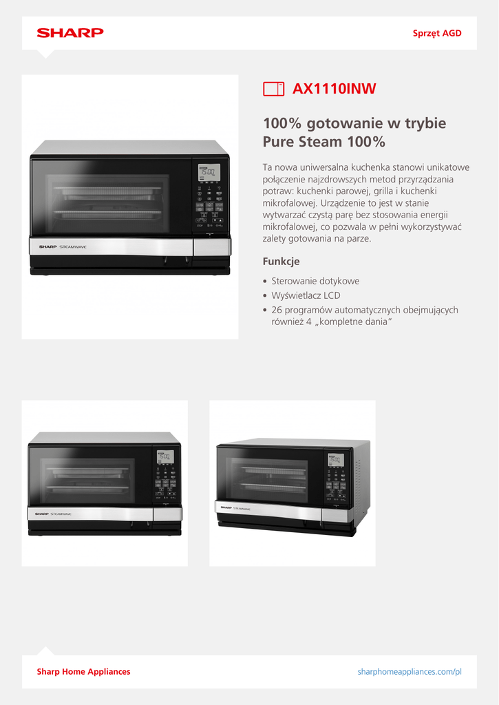 Sprzęt AGD AX1110INW 100% gotowanie w trybie Pure Steam 100% Ta nowa uniwersalna kuchenka stanowi unikatowe połączenie najzdrowszych metod przyrządzania potraw: kuchenki parowej, grilla i kuchenki mikrofalowej. Urządzenie to jest w stanie wytwarzać czystą parę bez stosowania energii mikrofalowej, co pozwala w pełni wykorzystywać zalety gotowania na parze. Funkcje Sterowanie dotykowe Wyświetlacz LCD 26 programów automatycznych obejmujących również 4 „kompletne dania” Sharp Home Appliances sharphomeappliances.com/pl Sprzęt AGD Kluczowe cechy Kolor obudowy / kolor uchwytu na drzwiach Srebrny / srebrny System rozprowadzania mikrofal System antenowy (emisja od spodu) Sterowanie: Pokrętło/przyciski dotykowe No/Yes Wydajność wytwarzania pary (cm3/min) 16 Materiał wnętrza Stal nierdzewna Pojemność komory (w litrach) 27 Przycisk "Język" Nie Funkcja "Minuta plus" (+1min) Yes Wymiary szafki do zabudowy (szer.) x (wys.) x (gł.) mm – Oświetlenie (W) 25 Gotowanie sekwencyjne Do trzech etapów Wprowadzanie czasu procesu (maks. ustawienie w minutach i sekundach) - oprócz wszystkich trybów parowych 99/50 Wprowadzanie czasu procesu dla wysokiego poziomu pary (maks. ustawienie w minutach) 35 Wprowadzanie czasu procesu dla niskiego poziomu pary (maks. ustawienie w minutach) 60 Ustawienie twardości wody (poziomy) 3 Inne wygodne funkcje Opcja gotowania z parą - 2 warstwy Yes Opcjonalny zestaw do zabudowy – Zabezpieczenie przed dziećmi Tak Przycisk "Zegar" No Korekcja ustawień (WIĘCEJ/MNIEJ) Yes Tryb demo Yes Funkcja odkamieniania/czyszczenia Yes/No System otwierania drzwi Zawiasy boczne Tryb odprowadzania skroplin Yes Tryb oszczędzania energii Tak Przycisk "Info" Tak Timer kuchenny Yes Moc wyjściowa Moc dolnego grilla (W) No Moc przegrzanej pary (W) No Moc termoobiegu (W) No Górny element grzejny grilla: podczerwień/kwarc (W) 1100 Mikrofale (W) 900 Moc pary (W) 910 Sharp Home Appliances sharphomeappliances.com/pl Sprzęt AGD Programy automatyczne Programy automatyczne gotowania lub gotowania ekspresowego Automatyczne programy pieczenia ciasta Nie Nie Automatyczne programy przygotowania pizzy Nie Programy automatyczne: grill 4 Programy sterowane czujnikami Nie Programy automatyczne: para 1 warstwa 11 Programy automatyczne: para 2 warstwy 4 Programy automatyczne: rozmrażanie parą 3 Tryb przemienny (grill i mikrofale cyklicznie) No Funkcja podgrzewania Nie Silna para (100°C) – Słaba para (zakres temperatur °C) – Odgrzewanie/podtrzymywanie ciepła parą No/No Termoobieg +para No Waga (kg) 18,1 Instrukcja dotycząca opcji przygotowywania posiłków Termoobieg (zakres temperatur °C ) – Tryb z podwójnym grillem (górna grzała + dolna grzałka) No Tryb kombinowany (termoobieg + mikrofale) No Tryb kombinowany (grill + mikrofale) Yes Grill Yes Poziomy mocy mikrofal 6 (100/70/50/30/10/0) Wymiary i waga Wymiary komory (sz.) x (wys.) x (gł.) mm 343 x 210 x 381 Wymiary zewnętrzne (szer.) x (wys.) x (gł.) mm 520 x 331 x 500 Mocy, zużycia i napięcia Napięcie (V) / częstotliwość (Hz) Sharp Home Appliances 230V / 50Hz sharphomeappliances.com/pl Sprzęt AGD Wyposażenie Forma do pieczenia No Książka kucharska W instrukcji obsługi Taca odpływowa Yes Naczynie szklane Yes Ruszt Yes Instrukcja obsługi Tak Tace parowe (szt.)/ materiał 2/ ze stali nierdzewnej; z ogranicznikiem Talerz obrotowy / materiał / rozmiar (ø) cm – Pojemność zbiornika na wodę (cm3) 430 European article number Kod EAN Sharp Home Appliances Powered by TCPDF (www.tcpdf.org) 4974019784441 sharphomeappliances.com/pl