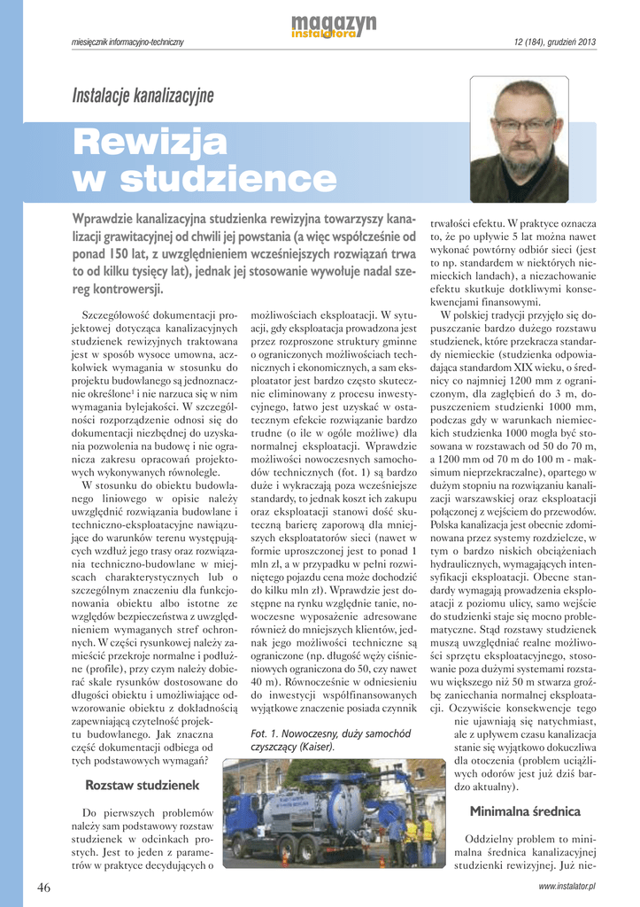 miesięcznik informacyjno-techniczny 12 (184), grudzień 2013 Instalacje kanalizacyjne Rewizja w studzience Wprawdzie kanalizacyjna studzienka rewizyjna towarzyszy kanalizacji grawitacyjnej od chwili jej powstania (a więc współcześnie od ponad 150 lat, z uwzględnieniem wcześniejszych rozwiązań trwa to od kilku tysięcy lat), jednak jej stosowanie wywołuje nadal szereg kontrowersji. Szczegółowość dokumentacji projektowej dotycząca kanalizacyjnych studzienek rewizyjnych traktowana jest w sposób wysoce umowna, aczkolwiek wymagania w stosunku do projektu budowlanego są jednoznacznie określone1 i nie narzuca się w nim wymagania bylejakości. W szczególności rozporządzenie odnosi się do dokumentacji niezbędnej do uzyskania pozwolenia na budowę i nie ogranicza zakresu opracowań projektowych wykonywanych równolegle. W stosunku do obiektu budowlanego liniowego w opisie należy uwzględnić rozwiązania budowlane i techniczno-eksploatacyjne nawiązujące do warunków terenu występujących wzdłuż jego trasy oraz rozwiązania techniczno-budowlane w miejscach charakterystycznych lub o szczególnym znaczeniu dla funkcjonowania obiektu albo istotne ze względów bezpieczeństwa z uwzględnieniem wymaganych stref ochronnych. W części rysunkowej należy zamieścić przekroje normalne i podłużne (profile), przy czym należy dobierać skale rysunków dostosowane do długości obiektu i umożliwiające odwzorowanie obiektu z dokładnością zapewniającą czytelność projektu budowlanego. Jak znaczna część dokumentacji odbiega od tych podstawowych wymagań? Rozstaw studzienek Do pierwszych problemów należy sam podstawowy rozstaw studzienek w odcinkach prostych. Jest to jeden z parametrów w praktyce decydujących o 46 możliwościach eksploatacji. W sytuacji, gdy eksploatacja prowadzona jest przez rozproszone struktury gminne o ograniczonych możliwościach technicznych i ekonomicznych, a sam eksploatator jest bardzo często skutecznie eliminowany z procesu inwestycyjnego, łatwo jest uzyskać w ostatecznym efekcie rozwiązanie bardzo trudne (o ile w ogóle możliwe) dla normalnej eksploatacji. Wprawdzie możliwości nowoczesnych samochodów technicznych (fot. 1) są bardzo duże i wykraczają poza wcześniejsze standardy, to jednak koszt ich zakupu oraz eksploatacji stanowi dość skuteczną barierę zaporową dla mniejszych eksploatatorów sieci (nawet w formie uproszczonej jest to ponad 1 mln zł, a w przypadku w pełni rozwiniętego pojazdu cena może dochodzić do kilku mln zł). Wprawdzie jest dostępne na rynku względnie tanie, nowoczesne wyposażenie adresowane również do mniejszych klientów, jednak jego możliwości techniczne są ograniczone (np. długość węży ciśnieniowych ograniczona do 50, czy nawet 40 m). Równocześnie w odniesieniu do inwestycji współfinansowanych wyjątkowe znaczenie posiada czynnik Fot. 1. Nowoczesny, duży samochód czyszczący (Kaiser). trwałości efektu. W praktyce oznacza to, że po upływie 5 lat można nawet wykonać powtórny odbiór sieci (jest to np. standardem w niektórych niemieckich landach), a niezachowanie efektu skutkuje dotkliwymi konsekwencjami finansowymi. W polskiej tradycji przyjęło się dopuszczanie bardzo dużego rozstawu studzienek, które przekracza standardy niemieckie (studzienka odpowiadająca standardom XIX wieku, o średnicy co najmniej 1200 mm z ograniczonym, dla zagłębień do 3 m, dopuszczeniem studzienki 1000 mm, podczas gdy w warunkach niemieckich studzienka 1000 mogła być stosowana w rozstawach od 50 do 70 m, a 1200 mm od 70 m do 100 m - maksimum nieprzekraczalne), opartego w dużym stopniu na rozwiązaniu kanalizacji warszawskiej oraz eksploatacji połączonej z wejściem do przewodów. Polska kanalizacja jest obecnie zdominowana przez systemy rozdzielcze, w tym o bardzo niskich obciążeniach hydraulicznych, wymagających intensyfikacji eksploatacji. Obecne standardy wymagają prowadzenia eksploatacji z poziomu ulicy, samo wejście do studzienki staje się mocno problematyczne. Stąd rozstawy studzienek muszą uwzględniać realne możliwości sprzętu eksploatacyjnego, stosowanie poza dużymi systemami rozstawu większego niż 50 m stwarza groźbę zaniechania normalnej eksploatacji. Oczywiście konsekwencje tego nie ujawniają się natychmiast, ale z upływem czasu kanalizacja stanie się wyjątkowo dokuczliwa dla otoczenia (problem uciążliwych odorów jest już dziś bardzo aktualny). Minimalna średnica Oddzielny problem to minimalna średnica kanalizacyjnej studzienki rewizyjnej. Już niewww.instalator.pl miesięcznik informacyjno-techniczny aktualna norma krajowa2, również w swojej ostatniej wersji (1999), ogranicza się tylko do ogólnej akceptacji istnienia wyrobów o różnych średnicach. Problemu średnic nie można sprowadzać tylko do „włazowości” studzienki, przyjmowane rozwiązania muszą być zdolne do normalnego działania w konkretnych warunkach lokalnych. Od średnicy studzienki zależą możliwości wprowadzania do niej odpowiedniego wyposażenia - chodzi tu zarówno o kamery (fot. 2), jak też węże do czyszczenia ciśnieniowego (rys. 1). Oczywiście istnieje wystarczająco uniwersalne wyposażenie zdolne do pracy w bardzo różnych warunkach, ale wiążą się z tym odpowiednie kosz- 12 (184), grudzień 2013 Fot. 2. Nawet fizycznie nieduża kamera z zestawu przenośnego może mieć (ze względu na rozstaw kół) problemy z wejściem do studzienki DN 400 mm. uwagą że teleskop instaluje się zwykle na głębokości do 2 m od poziomu gruntu, jednak nie ma bezpośrednich odniesień do zapisu średnicy obiektu. www.instalator.pl Znakowanie Mówiąc o studzience z tworzyw, trzeba podkreślić, że w normie PN-EN13598-2 wprowadzano zasadę znakowania przez określenie maksymalnej głębokości wód gruntowych powyżej dna kanału przelotowego studzienki H (bez deklaracji powinno to być co najmniej 2 m) oraz maksymalnej głębokości instalacji (standar