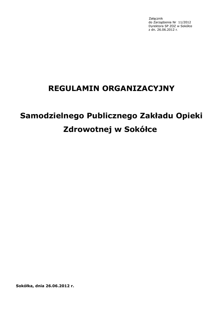 Załącznik do Zarządzenia Nr 11/2012 Dyrektora SP ZOZ w Sokółce z dn. 26.06.2012 r. REGULAMIN ORGANIZACYJNY Samodzielnego Publicznego Zakładu Opieki Zdrowotnej w Sokółce Sokółka, dnia 26.06.2012 r. SPIS TREŚCI: DZIAŁ I. POSTANOWIENIA OGÓLNE DZIAŁ II. PRZEBIEG PROCESU UDZIELANIA ŚWIADCZEŃ ZDROWOTNYCH Rozdział 1. Postanowienia ogólne Rozdział 2. Opieka stacjonarna Rozdział 3. Lecznictwo ambulatoryjne Rozdział 4. Pracownie diagnostyczne DZIAŁ III. ORGANIZACJA I ZADANIA KOMÓREK ORGANIZACYJNYCH PODMIOTU LECZNICZEGO Rozdział 1. Postanowienia ogólne Rozdział 2. Uprawnienia, obowiązki i odpowiedzialność osób pełniących funkcje kierownicze oraz pracowników Rozdział 3. Struktura organizacyjna i zakres działania komórek organizacyjnych podmiotu leczniczego DZIAŁ IV. WARUNKI WSPÓŁDZIAŁANIA Z INNYMI PODMIOTAMI WYKONUJĄCYMI DZIAŁALNOŚĆ LECZNICZĄ DZIAŁ V. Zasady udostępniania dokumentacji medycznej pacjenta DZIAŁ VI. POSTANOWIENIA KOŃCOWE DZIAŁ I POSTANOWIENIA OGÓLNE §1 Samodzielny Publiczny Zakład Opieki Zdrowotnej w Sokółce jest podmiotem leczniczym niebędącym przedsiębiorcą, działającym w formie samodzielnego publicznego zakładu opieki zdrowotnej. §2 1. Regulamin organizacyjny określa firmę, cele i zadania podmiotu leczniczego, strukturę organizacyjną oraz organizację i porządek procesu udzielania świadczeń zdrowotnych przez Samodzielny Publiczny Zakład Opieki Zdrowotnej w Sokółce, zwany dalej podmiotem. 2. Regulamin organizacyjny ustala Dyrektor Samodzielnego Publicznego Zakładu Opieki Zdrowotnej w Sokółce. §3 Niniejszy regulamin opracowano na podstawie: 1) ustawy z dnia 15 kwietnia 2011 roku o działalności leczniczej (Dz. U. Nr 112, poz. 654 z późn. zm.), 2) ustawy z dnia 27 sierpnia 2004 roku o świadczeniach opieki zdrowotnej finansowanych ze środków publicznych (Dz.U z 2008 r. Nr 164, poz. 1027 j.t. z późn. zm.), 3) ustawy z dnia 6 listopada 2008 r. o prawach pacjenta i Rzeczniku Praw Pacjenta ( Dz.U. 2012,poz. 159 j.t.), 4) statutu Samodzielnego Publicznego Zakładu Opieki Zdrowotnej w Sokółce, 5) innych przepisów prawa dotyczących funkcjonowania podmiotów wykonujących działalność leczniczą. §4 Postanowienia regulaminu obowiązują wszystkich pracowników podmiotu, a także osoby wykonujące świadczenia zdrowotne na rzecz podmiotu na podstawie umów cywilnoprawnych, pacjentów oraz osoby odwiedzające. §5 Ilekroć w regulaminie jest mowa o: 1) przedsiębiorstwie podmiotu leczniczego, rozumie się przez to przedsiębiorstwo w rozumieniu art. 2 ust. 1 pkt 8 ustawy, o której mowa w § 3 pkt 1 , tj. szpital, przychodnię specjalistyczną lub zakład opiekuńczo – leczniczy. 2) Dyrektorze, rozumie się przez to Dyrektora podmiotu leczniczego. §6 Podmiotem tworzącym Samodzielny Publiczny Zakład Opieki Zdrowotnej w Sokółce jest Powiat Sokólski. §7 1. Podmiot udziela świadczeń zdrowotnych na podstawie wpisu do rejestru podmiotów wykonujących działalność leczniczą prowadzonego przez Wojewodę Podlaskiego. 2. Podmiot posiada osobowość prawną. 3. Miejscem udzielania świadczeń jest Sokółka, ul. gen. Władysława Sikorskiego 40. 4. Udzielanie świadczeń zdrowotnych odbywa się w medycznych komórkach organizacyjnych podmiotu nieodpłatnie w ramach zawartych umów z Narodowym Funduszem Zdrowia zapewniającym finansowanie działalności leczniczej oraz odpłatnie. §8 1. Rada Społeczna jest organem inicjującym i opiniodawczym podmiotu tworzącego podmiot oraz organem doradczym Dyrektora. 2. Zasady i tryb działania Rady Społecznej określa ustawa o działalności leczniczej oraz Statut podmiotu. §9 1. Postępowanie kancelaryjne w podmiocie, obieg dokumentów, rejestrację, znakowanie pism, 2. używanie pieczęci określa Instrukcja Kancelaryjna ustalona przez Dyrektora i zatwierdzona przez Archiwum Państwowe. Wewnętrzny porządek oraz czas pracy poszczególnych grup zawodowych określa Zakładowy Układ Zbiorowy Pracy dla Pracowników oraz Regulamin Pracy ustalony przez Dyrektora, po uzgodnieniu ze Związkami Zawodowymi działającymi w podmiocie. § 10 1. Celem działania podmiotu jest prowadzenie działalności leczniczej polegającej na udzielaniu 2. świadczeń zdrowotnych oraz promocji zdrowia. Rodzajami działalności leczniczej podmiotu są: 1. stacjonarne i całodobowe szpitalne świadczenia zdrowotne, 2. stacjonarne i całodobowe inne niż szpitalne świadczenia zdrowotne, 3. ambulatoryjne specjalistyczne świadczenia zdrowotne, 4. promocja zdrowia. § 11 1. Do zadań podmiotu należy: 1) 2) 3) 4) 5) 6) 7) 8) 2. udzielanie stacjonarnych i całodobowych świadczeń zdrowotnych, udzielanie ambulatoryjnych specjalistycznych świadczeń zdrowotnych, udzielanie świadczeń zdrowotnych w zakresie diagnostyki, prowadzenie działalności z zakresu profilaktyki i promocji zdrowia, przygotowanie osób do wykonywania zawodu medycznego, kształcenie osób wykonujących zawód medyczny, podnoszenie kwalifikacji przez osoby wykonujące zawód medyczny, realizacja zadań obronnych określonych w planach przygotowań publicznej i niepublicznej służby zdrowia powiatu sokólskiego na potrzeby obronne państwa, 9) orzekanie i opiniowanie o stanie zdrowia, 10) wykonywanie innych zadań wynikających z odrębnych przepisów. Podmiot może także prowadzić inną działalność, m.in. w zakresie: 1) usług diagnostycznych, wynajmu i dzierżawy pomieszczeń i gruntów, 2) wynajmu i użyczenia aparatury i sprzętu medycznego oraz sprzętu użytkowego, 3) sterylizacji sprzętu, 4) usług kserograficznych, 5) usługi stołówkowe, pralnicze, 6) usługi szkoleniowe. DZIAŁ II. PRZEBIEG PROCESU UDZIELANIA ŚWIADCZEŃ ZDROWOTNYCH Rozdział 1. Postanowienia ogólne § 12 1. Podmiot udziela świadczeń zdrowotnych finansowanych ze środków publicznych osobom 2. 3. 4. 5. ubezpieczonym oraz innym osobom uprawnionym do tych świadczeń na podstawie odrębnych przepisów nieodpłatnie, za częściową o