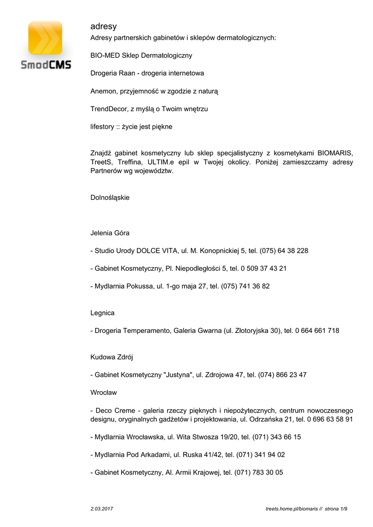 adresy Adresy partnerskich gabinetów i sklepów dermatologicznych: BIO-MED Sklep Dermatologiczny Drogeria Raan - drogeria internetowa Anemon, przyjemność w zgodzie z naturą TrendDecor, z myślą o Twoim wnętrzu lifestory :: życie jest piękne Znajdź gabinet kosmetyczny lub sklep specjalistyczny z kosmetykami BIOMARIS, TreetS, Treffina, ULTIM.e epil w Twojej okolicy. Poniżej zamieszczamy adresy Partnerów wg województw. Dolnośląskie Jelenia Góra - Studio Urody DOLCE VITA, ul. M. Konopnickiej 5, tel. (075) 64 38 228 - Gabinet Kosmetyczny, Pl. Niepodległości 5, tel. 0 509 37 43 21 - Mydlarnia Pokussa, ul. 1-go maja 27, tel. (075) 741 36 82 Legnica - Drogeria Temperamento, Galeria Gwarna (ul. Złotoryjska 30), tel. 0 664 661 718 Kudowa Zdrój - Gabinet Kosmetyczny "Justyna", ul. Zdrojowa 47, tel. (074) 866 23 47 Wrocław - Deco Creme - galeria rzeczy pięknych i niepożytecznych, centrum nowoczesnego designu, oryginalnych gadżetów i projektowania, ul. Odrzańska 21, tel. 0 696 63 58 91 - Mydlarnia Wrocławska, ul. Wita Stwosza 19/20, tel. (071) 343 66 15 - Mydlarnia Pod Arkadami, ul. Ruska 41/42, tel. (071) 341 94 02 - Gabinet Kosmetyczny, Al. Armii Krajowej, tel. (071) 783 30 05 2.03.2017 treets.home.pl/biomaris // strona 1/9 - Gabinet Kosmetyczny w D.S. Ślężak, ul. Ślężna 33, tel. (071) 368 05 24 - Studio Odnowy Biologicznej AGA Hotel Gem, ul. Baudouina de Courtenay 16, tel. (071) 372 92 13 w. 14 - Salon Kosmetyczny BIO-KOSMETYKA, ul. Śniadeckich 51/1, tel. (071) 348 33 43 Wałbrzych - Gabinet Kosmetyczny Lidia, ul. Blankowa 50C, tel. (074) 664 20 22 Zgorzelec - Gabinet Kosmetyczny "Małgosia", ul. Poniatowskiego 19, tel. (075) 775 53 73 - Gabinet Kosmetyczny, ul. Konarskiego 4c, tel. 0 503 97 08 76 Kujawsko-Pomorskie Bydgoszcz - Supermarket Piotr i Paweł, ul. Grzymały Siedleckiego20 Lubelskie Lubartów - Gabinet Kosmetyczny, ul. Lubelska 24, tel. (081) 855 60 66 Lublin - Butik "Agnes", ul. Zana 19 Lubuskie Kostrzyn - PUH Arabella, Osiedle Warniki 54, tel. 0 501 890 351 Łódzkie 2.03.2017 treets.home.pl/biomaris // strona 2/9 Drzewica - Salon Kosmetyczny, Żardki 95, tel. (048) 3758217 Pabianice - BELLIS Usługi Kosmetyczne , ul. Bracka 3/5 m. 1, tel. 0 604 567 187 Małopolskie Brzesko - F.H. Giano Mori, ul. Głowackiego 8 Kraków - ALMA Galeria Kazimierz, ul. Podgórska 34 - ALMA Supermarket, ul. Pilotów 6 - Inspiracje - studio urody, ul. Chmieleniec 2, tel. (012) 263 77 22 (kosmetyka i wizaż, Hanna Giemza) - Gabinet Kosmetyczny MS, Monika Stawarczyk-Szyszko, ul. Batorego 4, tel. (012) 623 76 01 - Nowy Wymiar salon kosmetyki profesjonalnej, os. Centrum E 19/13, tel. (012) 412 73 11 - Instytut Urody No. 1, ul. Wieniawskiego 62, 31-436, tel. (012) 411 76 51 - Gabinet Kosmetyczny, os. Dywizjonu 303 25/56 - Gabinet Kosmetyczny Blue Studio, os. Dywizjonu 303 56C/14, tel. (012) 642 69 70 - Sklep Zielarski HERBAPOL, ul. Szewska 23, tel. (012) 422 42 65 - Salon Fryzjersko-Kosmetyczny SENSJA, ul. Wiślna 5/6, tel. (012) 421 64 27 - Studio Urody i Odnowy Biologicznej (Park Wodny), ul. Dobrego Pasterza 126, tel. (012) 413 24 62 - Centrum Kosmetyki Leczniczej ODRODZENIE, ul. Pomorska 6/3, tel. (012) 631 04 85 - Gabinet Kosmetyczny NATURA, Bieńczycki Plac Targowy 15 A, tel. (012) 647 75 19 - Galeria Piękności, ul. Zachodnia 7/12, tel. (012) 262 74 34 2.03.2017 treets.home.pl/biomaris // strona 3/9 - Ośrodek Edukacyjny Zdrowie i Uroda Studio Fitness, ul. Miodowa 21, tel. 0 609 648 906 - Sklepy Kosmetyczne pp. Rycerz, ul. Racławicka 1, tel. 0 602-102-387 - Salon Urody, ul. Wyki 10/12, tel. 0 501 86 45 38 Myślenice - Salon Usług Kosmetycznych, ul. Kazimierza Wielkiego 175, tel. (012) 274 29 53 Niepołomice - Gabinet masażu i rehabilitacji, ul. Jana Korczaka 5 (budynek basenu), tel. 0 668 177 549 Skawina - Firma handlowa "AGA", ul. Popiełuszki 7, tel. 0 661 767 337 Tarnów - Salon Kosmetyczny "WELLNESS", ul. Nowodąbrowska 142, tel. (014) 625 08 34 Zakopane - Gabinet Kosmetyczny "Justyna", ul. Chałubińskiego 37, tel. (018) 206 22 27 Mazowieckie Ciechanów - Salon Kosmetyczny, ul. Pułtuska 20C, tel. (023) 672 91 68 Warszawa - Gabinet Kosmetyczny, ul. Topiel 27, tel. 0 605 65 43 23 - Gabinet Kosmetyczny, ul. Grzybowska 2/13, tel. (022) 752 29 35 - Salon Piękności Milord, ul. Waszyngtona 30/36, tel. (022) 617 73 77 - Salon Piękności Milord, ul. Jana Pawła II 12, tel. (022)850 91 19 - Salon Fryzjersko-Kosmetyczny, ul. Marszałkowska 111a, tel. (022) 633 00 09 - Studio Odnowy Biologicznej ABI, ul Bracka 23 lok. 24, tel. (022) 827 65 70 - Perfumeria "CZAR WARSZAWY", ul. Krucza 41/43, tel. (022) 629 39 74 2.03.2017 treets.home.pl/biomaris // strona 4/9 - Gabinet Kosmetyczny, COIFFURE EN VOGUE, Izabella Boguszewska, ul. Zawiszy 1 - Hotel Jan III Sobieski, tel. (022) 579 10 36 - Salon Fryzjersko-Kosmetyczny, ul. Wspólna 41, tel. (022) 629 93 21 - Salon Kosmetyczny Meriz, ul. Puzaka 1, tel. (022) 662 70 62 - Gabinet Kosmetyczny, ul. Skwer Wyszyńskiego 5/8, tel. 0 504 471 520 - Salon Fryzjersko-Kosmetyczny Ela, ul. Rakietników 18, tel. (022) 667 02 98 - Saloniq, ul. Jana Pawła II 64, tel. (022) 636 11 75 - Wizaż i Stylizacja, ul. Nowolipie 9/11/20, tel. 0 509 200 139 Ząbki - P.P.H.U. KONEKA Drogeria raan.com.pl, ul. Gajowa 4, tel. 0 604 227 508 Opolskie Brzeg - Julia Cosmetics, ul. Wolności 3, tel. (077) 41 11 751 Izbicko - Gabinet Kosmetyczny, ul. Powstancow Slaskich 16, tel. (077) 461 72 95 Kędzierzyn Koźle - Gabinet Kosmetyczny, ul. Bolesława Śmiałego 3 kl. E m. 8, tel. 0 602 63 92 37 Krapkowice - Salon Kosmetyczny, ul. Opolska 2/5, tel. (077) 466 45 20 Opole - Gabinet Kosmetyczny NELA, ul. Niemodlińska 21, tel. 0 609 50 49 35 Strzelce Opolskie - Salon Kosmetyczny GRACJA, ul. Dąbrowskiego 24, tel. (077) 461 32 99 Podkarpackie 2.03.2017 treets.home.pl/biomaris // strona 5/9 Solina - Handel Artykułami Odzieżowymi i Przemysłowymi, Solina 91, tel. 0 501 068 386 Podlaskie Białystok - Gabinet Rehabilitacyjny dzieci i niemowląt, ul. Berlinga 21/32, tel. 0 5