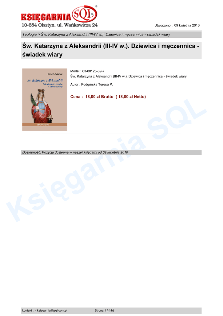 Utworzono : 09 kwietnia 2010 Teologia > Św. Katarzyna z Aleksandrii (III-IV w.). Dziewica i męczennica - świadek wiary Św. Katarzyna z Aleksandrii (III-IV w.). Dziewica i męczennica świadek wiary Model : 83-88125-39-7 Św. Katarzyna z Aleksandrii (III-IV w.). Dziewica i męczennica - świadek wiary Autor : Podgórska Teresa P. L Q S a Cena : 18,00 zł Brutto ( 18,00 zł Netto) i n r Dostępność: Pozycja dostępna w naszej księgarni od 09 kwietnia 2010 ę i s a g K kontakt : - [email protected] Strona 1 / {nb}