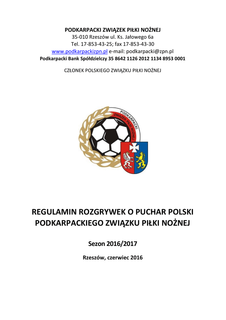 PODKARPACKI ZWIĄZEK PIŁKI NOŻNEJ 35-010 Rzeszów ul. Ks. Jałowego 6a Tel. 17-853-43-25; fax 17-853-43-30 www.podkarpackizpn.pl e-mail: [email protected] Podkarpacki Bank Spółdzielczy 35 8642 1126 2012 1134 8953 0001 CZŁONEK POLSKIEGO ZWIĄZKU PIŁKI NOŻNEJ REGULAMIN ROZGRYWEK O PUCHAR POLSKI PODKARPACKIEGO ZWIĄZKU PIŁKI NOŻNEJ Sezon 2016/2017 Rzeszów, czerwiec 2016 Rozgrywki o Puchar Polski pod patronatem Prezydenta Rzeczypospolitej Polskiej są masową imprezą piłkarską, mającą na celu wyłonienie najlepszych spośród wszystkich polskich drużyn piłkarskich, ubiegających się o to trofeum. Drużyna, która zwycięży w finale Pucharu Polski na szczeblu Podkarpackiego Związku Piłki Nożnej uzyskuje prawo uczestnictwa w rozgrywkach o Puchar Polski na szczeblu centralnym w sezonie 2017/2018. W rozgrywkach o Puchar Polski uczestniczą obowiązkowo drużyny III i IV ligi oraz Ligi Okręgowej. Pozostałe drużyny tj. klasy A, B i C oraz drużyny niezrzeszone biorą udział na zasadzie dobrowolności. Drużyny klasy okręgowej mogą wycofać się z rozgrywek Pucharu Polski najpóźniej 14 dni przed planowanym rozpoczęciem. Drużyny niezrzeszone, przystępując do rozgrywek Pucharu Polski, przedstawiają pisemne oświadczenie w którym: a. zobowiązują się do zapoznania się i przestrzegania powyższych przepisów, b. wyznaczają osobę / osoby, które będą bezpośrednio odpowiedzialne: finansowo i cywilnie za wszelkie kary orzeczone w pierwszym etapie przez poszczególne Wydziały/Komisje Dyscypliny, a w drugim etapie przez Wydział Dyscypliny Podkarpackiego Związku Piłki Nożnej. §1 Cykl rozgrywek na szczeblu wojewódzkiego związku piłki nożnej na sezon 2016/2017 kończy się do 30 czerwca 2017 roku i ma wyłonić zwycięzcę, który weźmie udział w rozgrywkach na szczeblu centralnym w sezonie 2017/2018. Cykl rozgrywek w sezonie 2016/2017 na szczeblu centralnym rozpoczyna się 01 lipca 2016 roku a kończy nie później niż 01 czerwca 2017 roku §2 Rozgrywki zostaną przeprowadzone systemem pucharowym tzn. drużyna przegrywająca odpada z dalszych rozgrywek. §3 1. W pierwszym etapie rozgrywki prowadzone będą w Okręgowych Związkach Piłki Nożnej w Jarosławiu i Krośnie oraz w Podokręgach Rzeszów-Dębica oraz Stalowa Wola . Zakończenie pierwszego etapu rozgrywek musi nastąpić do 15 maja 2017 roku. 2. W drugim etapie udział wezmą zwycięzcy rozgrywek z pierwszego etapu z każdego OZPN-u tj. Jarosławia i Krosna oraz zwycięzcy rozgrywek Podokręgu RzeszówDębica oraz Stalowa Wola. 3. Zestawienie par w drugim etapie będzie losowane przez Wydział Gier Podkarpackiego Związku Piłki Nożnej. §4 1. Czas trwania zawodów wynosi 2x45 minut. 2. W pierwszym etapie rozgrywek, w przypadku wyniku remisowego w normalnym czasie gry zarządza się dogrywkę 2x15 minut. Jeżeli po dogrywce nadal będzie remis sędzia zawodów zarządza wykonywanie rzutów karnych – według obowiązujących przepisów. 3. Wszystkie rzuty karne muszą być wykonywane do tej samej bramki. O wyborze bramki decyduje sędzia główny zawodów. Uznanie gola może nastąpić tylko z rzutu bezpośredniego. Zdobyte gole z tzw. „dobitki” są nieważne. §5 1. Zawody o Puchar Polski będą rozgrywane według obowiązujących przepisów gry w piłkę nożną oraz zgodnie z zasadami określonymi w przepisach Uchwały nr IX/140 z dnia 3 i 7 lipca 2008 roku Zarządu PZPN – Przepisy o organizacji rozgrywek w piłkę nożną (z późniejszymi zmianami) oraz Regulaminem Dyscyplinarnym PZPN. 2. Orzecznictwo dyscyplinarne zawodników, działaczy i klubów w odniesieniu do wszystkich drużyn biorących udział w rozgrywkach pucharowych I etapu na szczeblu związków piłki nożnej należy do Wydziałów/Komisji Dyscypliny Okręgów/Podokręgów, natomiast w drugim etapie do Wydziału Dyscypliny Podkarpackiego ZPN. §6 Zawody organizuje klub będący gospodarzem (w terminarzu podany na pierwszym miejscu) pokrywa koszty związane z organizacją zawodów. Każda drużyna jedzie na zawody na koszt własny. §7 1. W rozgrywkach mogą uczestniczyć wyłącznie zawodnicy uprawnieni do gry w systemie extranet. Uprawnienie zawodników do rozgrywek ligowych oznacza jednocześnie uprawnienie do udziału w rozgrywkach pucharowych. 2. W przypadku wystawienia przez Klub do rozgrywek więcej niż jednej drużyny, mają zastosowanie następującej zasady: a) Zawodnicy, którzy brali udział w jednej drużynie, nie mogą brać udziału w innej drużynie tego samego klubu w następnym terminie, jeżeli obie drużyny awansują dalej. Jeżeli jedna z tych drużyn została wyeliminowana z rozgrywek, wówczas maksimum trzech zawodników drużyny wyeliminowanej może grać w poszczególnym meczu w tej drużynie swego klubu, która zakwalifikowała się do dalszych rozgrywek. b) Oznaczenie drużyny tego samego klubu ustala się na podstawie klas rozgrywkowych, w których one aktualnie występują – I drużynę reprezentuje zespół występujący w najwyższej klasie rozgrywkowej, itd. §8 W czasie zawodów dopuszczalna jest wymiana 5 zawodników przez cały okres trwania zawodów, bez prawa ponownego ich powrotu na boisko. W rozgrywkach Pucharu Polski nie mają obowiązku grać zawodnicy-młodzieżowcy. §9 1. Żółte kartki otrzymane w meczach Pucharu Polski klub ewidencjonuje oddzielnie tylko z rozgrywek pucharowych danej edycji rozgrywek. 2. Zawodnik, który w czasie zawodów pucharowych otrzyma napomnienie (żółtą kartkę) zostaje automatycznie ukarany: a. przy drugim napomnieniu - karą dyskwalifikacji w wymiarze jednego meczu b. przy czwartym napomnieniu - karą dyskwalifikacji w wymiarze dwóch meczów c. przy siódmym i każdym kolejnym napomnieniu – karą dyskwalifikacji w wymiarze dwóch meczów oraz karą pieniężną w wysokości 100 PLN Zawodnik ukarany karą pieniężną nie może występować w spotkaniach pucharowych do czasu wpłacenia orzeczonej kwoty pieniężnej na konto organu prowad