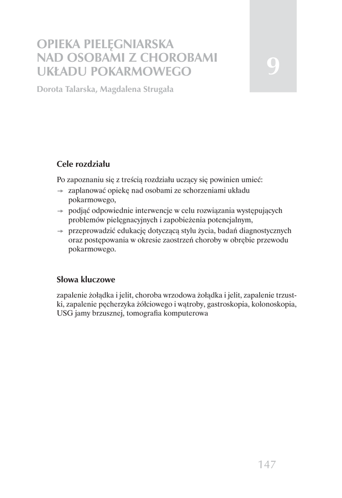 OPIEKA PIELĘGNIARSKA NAD OSOBAMI Z CHOROBAMI UKŁADU POKARMOWEGO 9 Dorota Talarska, Magdalena Strugała Cele rozdziału Po zapoznaniu się z treścią rozdziału uczący się powinien umieć: zaplanować opiekę nad osobami ze schorzeniami układu pokarmowego, podjąć odpowiednie interwencje w celu rozwiązania występujących problemów pielęgnacyjnych i zapobieżenia potencjalnym, przeprowadzić edukację dotyczącą stylu życia, badań diagnostycznych oraz postępowania w okresie zaostrzeń choroby w obrębie przewodu pokarmowego. Słowa kluczowe zapalenie żołądka i jelit, choroba wrzodowa żołądka i jelit, zapalenie trzustki, zapalenie pęcherzyka żółciowego i wątroby, gastroskopia, kolonoskopia, USG jamy brzusznej, tomografia komputerowa 147 9.1. Pielęgnowanie chorych z zapaleniem i chorobą wrzodową żołądka i dwunastnicy Obraz kliniczny Zapalenie żołądka Zapalenie błony śluzowej żołądka jest konsekwencją zaburzenia równowagi między czynnikami agresywnymi a mechanizmami zapewniającymi ochronę i integralność błony śluzowej żołądka. Podział zapaleń na ostre i przewlekłe oparty jest głównie na nasileniu objawów klinicznych i długości ich występowania. Do najczęstszych czynników wywołujących ostre zapalenie żołądka zalicza się: spożycie alkoholu, leki, np. kwas acetylosalicylowy, niesteroidowe leki przeciwzapalne (NLPZ), czynniki infekcyjne (bakterie – zwłaszcza Helicobacter pylori, grzyby i wirusy), zatrucia pokarmowe (paciorkowce, gronkowce, Proteus, Escherichia coli), zaburzenia neurogenne i endokrynne, kwasicę oddechową i metaboliczną, oparzenia, napromieniowanie, stres. Zapalenie może mieć przebieg od łagodnego, z tendencją do szybkiego przemijania, do zapalenia krwotocznego i nadżerkowego. Objawy zależą od nasilenia choroby. Zazwyczaj są to: bóle i ucisk w dołku podsercowym, wymioty, przy współwystępującym zapaleniu jelit – biegunka prowadząca do odwodnienia. W ostrym krwotocznym zapaleniu żołądka może dojść do zapaści z powodu znacznej utraty krwi. Postępowanie terapeutyczne zależy od nasilenia objawów. Najczęstszą przyczyną przewlekłego zapalenia żołądka są: infekcja Helicobacter pylori, mechanizmy autoimmunologiczne oraz drażniące działanie leków i żółci. Wyróżnia się dwa systemy klasyfikacji przewlekłego zapalenia żołądka: klasyfikację ABC – opartą na kryteriach etiologicznych i histologicznych, oraz klasyfikację z Sydney. Objawy choroby są niecharakterystyczne, np. uczucie pełności i bóle w nadbrzuszu, wzdęcia, utrata łaknienia. Wtórnie mogą się dołączyć: nadpobudliwość, zaburzenia snu, niedokrwistość. Dolegliwości często nasilają się po spożyciu tłustych, pikantnych potraw oraz w wyniku przemęczenia i zdenerwowania. Leczenie ukierunkowane jest na czynnik przyczynowy oraz zależy od nasilenia wydzielania kwasu żołądkowego. Wrzód żołądka i dwunastnicy Wrzód trawienny to ograniczony ubytek błony śluzowej sięgający poza blaszkę mięśniową z naciekiem zapalnym i martwicą. Może mieć charakter ostry lub nawracający. Powstaje tylko w tych odcinkach przewodu pokarmowego, w których dochodzi do kontaktu z kwasem solnym i z pepsyną – najczęściej w żołądku i dwunastnicy. Czynnikiem etiologicznym u 90–95% pacjentów z wrzodem dwunastnicy i 70–80% z wrzodem żołądka jest Helicobacter pylori. Pozostałymi czynnikami są: sytuacje stresowe (oparzenie, uraz wielonarządowy, uraz czaszkowo-mózgowy, zatrucie egzo- i endogenne, utrata 148 bliskiej osoby), leki, zwłaszcza niesteroidowe leki przeciwzapalne, palenie tytoniu, alkohol, czynnik genetyczny w chorobie wrzodowej dwunastnicy oraz osoby z grupą krwi 0, obecność innych chorób (np. marskość wątroby, przewlekła niewydolność nerek, choroby płuc). Do objawów wrzodu trawiennego zalicza się przede wszystkim ból umiejscowiony w zależności od lokalizacji zmian. We wrzodzie żołądka występuje najczęściej w nadbrzuszu, w dołku podsercowym, do 1–2 godzin po posiłku. Towarzyszą mu zgaga i odbijania. We wrzodzie dwunastnicy pojawiają się bóle głodowe: w nocy, w dużych odstępach między posiłkami – łagodnieją po spożyciu posiłku i ponownie nasilają się po upływie 2–3 godzin. Zlokalizowane są zazwyczaj na prawo od pępka. Dodatkowo mogą się pojawić utrata apetytu oraz nieregularne wypróżnienia. Wrzód trawienny może przebiegać także bezobjawowo lub w postaci nasilonych dolegliwości występujących podczas powikłań, takich jak: perforacja, krwawienie, zwężenie odźwiernika i penetracja wrzodu. Leczenie wrzodu żołądka i dwunastnicy ma na celu zniesienie dolegliwości bólowych, gojenie się owrzodzenia oraz zapobieganie nawrotom i powikłaniom. Najczęściej jest to leczenie eradykacyjne, połączone ze stosowaniem leków neutralizujących kwas żołądkowy, leków osłonowych, zmianą diety i eliminacją używek. Problemy pielęgnacyjne chorych i interwencje pielęgniarskie Zapalenie żołądka Problem pielęgnacyjny: uczucie pobolewania w nadbrzuszu spowodowane procesem zapalnym błony śluzowej żołądka. Cel opieki: zmniejszenie dolegliwości bólowych, eliminowanie czynnika drażniącego błonę śluzową żołądka. Działania pielęgniarskie: ustalenie czynnika wywołującego dolegliwości bólowe, zapoznanie pacjenta ze sposobem odżywiania, uwzględniającym nasilenie dolegliwości ze strony przewodu pokarmowego (patrz: Wskazówki edukacyjne dla pacjentów ze schorzeniami układu pokarmowego), podawanie choremu leków zgodnie ze zleceniem lekarskim (w zależności od etiologii stanu zapalnego: przy zakażeniu Helicobacter pylori lub inną bakterią – antybiotyki, przy nadkwaśności – leki zobojętniające lub hamujące wydzielanie kwasu żołądkowego), odstawienie leków (na zlecenie lekarza), używek oraz pokarmów działających drażniąco na błonę śluzową żołądka, przygotowanie pacjenta do gastrosko