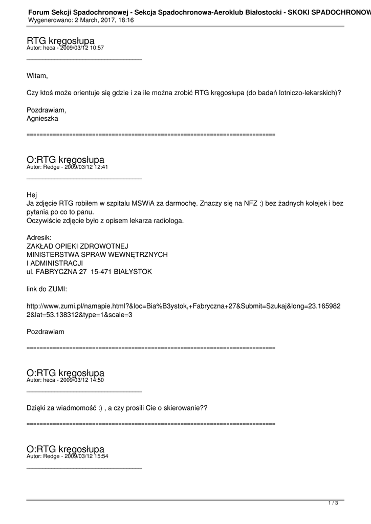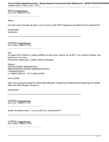 Forum Sekcji Spadochronowej - Sekcja Spadochronowa-Aeroklub Białostocki - SKOKI SPADOCHRONOW Wygenerowano: 2 March, 2017, 18:16 RTG kręgosłupa Autor: heca - 2009/03/12 10:57 _____________________________________ Witam, Czy ktoś może orientuje się gdzie i za ile można zrobić RTG kręgosłupa (do badań lotniczo-lekarskich)? Pozdrawiam, Agnieszka ============================================================================ O:RTG kręgosłupa Autor: Redge - 2009/03/12 12:41 _____________________________________ Hej Ja zdjęcie RTG robiłem w szpitalu MSWiA za darmochę. Znaczy się na NFZ :) bez żadnych kolejek i bez pytania po co to panu. Oczywiście zdjęcie było z opisem lekarza radiologa. Adresik: ZAKŁAD OPIEKI ZDROWOTNEJ MINISTERSTWA SPRAW WEWNĘTRZNYCH I ADMINISTRACJI ul. FABRYCZNA 27 15-471 BIAŁYSTOK link do ZUMI: http://www.zumi.pl/namapie.html?&loc=Bia%B3ystok,+Fabryczna+27&Submit=Szukaj&long=23.165982 2&lat=53.138312&type=1&scale=3 Pozdrawiam ============================================================================ O:RTG kręgosłupa Autor: heca - 2009/03/12 14:50 _____________________________________ Dzięki za wiadmomość :) , a czy prosili Cie o skierowanie?? ============================================================================ O:RTG kręgosłupa Autor: Redge - 2009/03/12 15:54 _____________________________________ 1/3 Forum Sekcji Spadochronowej - Sekcja Spadochronowa-Aeroklub Białostocki - SKOKI SPADOCHRONOW Wygenerowano: 2 March, 2017, 18:16 Byłem u lekarza rodzinnego po skierowanie, ale go nie dostałem, bo powiedział że nie jest ono wymagana aby zrobić RTG. Ale to było rok temu, tak więc aby dwa razy nie chodzić, proponuję zadzwonić do Twego lekarza i zapytać. Niema za co :) ============================================================================ O:RTG kręgosłupa Autor: tomek - 2009/03/12 18:36 _____________________________________ Robiłem RTG w zeszłym roku w czerwcu i z tego co się wtedy dowiedziałem to skierowanie jest potrzebne ============================================================================ O:RTG kręgosłupa Autor: plonek58 - 2009/03/13 00:42 _____________________________________ Bezproblemowo choć odpłatnie robią na ul.Krakowskiej.Skierowanie potrzebne jest jeśli ktoś chce zrobić za friko. pozdr ============================================================================ O:RTG kręgosłupa Autor: heca - 2009/03/13 18:42 _____________________________________ A możecie napisać ile to z grubsza kosztuje ?? (nie wiem czy dostane tak łatwo skierowanie ;) ============================================================================ O:RTG kręgosłupa Autor: tomek - 2009/03/13 22:48 _____________________________________ już nie pamiętam dokładnie, ale chyba około 40 PLN, ja robiłem na Słodowskiej tam obok stacji krwiodawstwa, ale tam mi też mówili że mimo wszystko skierowanie musi być ============================================================================ O:RTG kręgosłupa Autor: Skydotka - 2009/03/14 20:17 _____________________________________ Jesli chcesz zrobić RTG za darmo, to niestety skierowanie jest potrzebne, jak ja robiłam badania to na Fabrycznej odesłali mnie z kwitkiem, ale poszłam do swojego rodzinnego i powiedziałam że nie wyjdę z 2/3 Forum Sekcji Spadochronowej - Sekcja Spadochronowa-Aeroklub Białostocki - SKOKI SPADOCHRONOW Wygenerowano: 2 March, 2017, 18:16 gabinetu bez skierowania (wersja dla bardziej upartych i mających więcej czasu- moja dr uległa po kwadransie:P) Z tego co wiem, to tak jak pisał Jurek na Krakowskiej mozna zrobić to odpłatnie, koszt jakies 40-50 zł (noo chyba że na skutek wszechogarniającego kryzysu służba zdrowia podwyższyła cenę) pozdrawiam ============================================================================ O:RTG kręgosłupa Autor: Redge - 2009/03/14 22:22 _____________________________________ Osobiście do kłamstwa nie namawiam... Ale można przyjść do lekarza wyprostowanym jakby się połknęło kołek, i nawciskać mu, że akurat po porannej gimnastyce napiernicza nas kręgosłup ;) (dodając fachowo, odcinek krzyżowo lędźwiowy). Biedny doktor zleci na 100% badanie RTG, a my zaoszczędzimy parę zł w poczuciu, że i tak rozejdą się one na najbliższej imprezce. wersja dla desperatów pozdrawiamB) ============================================================================ O:RTG kręgosłupa Autor: heca - 2009/03/16 08:15 _____________________________________ Pomysle.... B) Dzieki wszystkim za wskazowki! Pozdrawiam, Agnieszka ============================================================================ 3/3