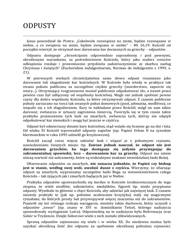 ODPUSTY Jezus powiedział do Piotra: „Cokolwiek rozwiążesz na ziemi, będzie rozwiązane w niebie, a co zwiążesz na ziemi, będzie związane w niebie” – Mt 16,19. Kościół od początku wierzył, że otrzymał moc darowania kar doczesnych za grzechy - odpustów. Odpustu dostępuje „chrześcijanin odpowiednio usposobiony i pod pewnymi, określonymi warunkami, za pośrednictwem Kościoła, który jako szafarz owoców odkupienia rozdaje i prawomocnie przydziela zadośćuczynienie ze skarbca zasług Chrystusa i świętych” (Encheridion indulgentiarum, Normae de indulgentiis z 1999, s. 21). W pierwszych wiekach chrześcijaństwa samo słowo odpust rozumiano jako darowanie lub złagodzenie kar kościelnych. W Kościele była wtedy w praktyce tak zwana pokuta publiczna za szczególnie ciężkie grzechy (morderstwo, zaparcie się wiary...). Otrzymujący rozgrzeszenie musiał publicznie odpokutować zło, a nawet przez pewien czas był odłączony od wspólnoty kościelnej. Mogli oni jednak spełniać pewne czyny dla dobra wspólnoty Kościoła, za które otrzymywali odpust. Z czasem publiczne pokuty zarzucano na rzecz tak zwanych pokut domowych (post, jałmużna, modlitwa), co wiązało się z ich złagodzeniem. Kary te nakładane przez Kościół, mógł on sam także darować, zwłaszcza w sytuacji zagrożenia śmiercią. Tworzyła się w tym czasie także praktyka przenoszenia tych łask na zmarłych, zwłaszcza tych, którzy nie zdążyli odpokutować kar ziemskich i mogą być jeszcze w czyśćcu. Odpust był odmierzany dniami kary kościelnej, stąd wzięło się liczenie go na dni i lata. Od wieku XI Kościół wprowadził odpusty zupełne (np. Papież Urban II na synodzie klermonckim w roku 1095 udzielił go krzyżowcom). Kościół zaczął coraz więcej udzielać łask i wiązać je z pobożnymi czynami, nawiedzeniami świętych miejsc itp. Zawsze jednak nauczał, że odpust nie jest darowaniem grzechów, bo tego dostępuje się jedynie przystępując do sakramentalnej spowiedzi, lecz – darowaniem kar za grzechy. Odpust ma zatem niższą wartość niż sakramenty, które są widzialnymi znakami niewidzialnej łaski Bożej. Ofiarowanie odpustów za zmarłych, nie oznacza jednakże, że Papież czy biskup jest w stanie, według swej woli, uwolnić dusze z czyśćca. Wierzymy, że ofiarując odpust za zmarłych, wypraszamy szczególne łaski Boga za wstawiennictwem całego Kościoła – tak żyjących jak i zmarłych będących już w Niebie. Praktyka odpustów upowszechniła się bardzo w Kościele średniowiecznym do tego stopnia, że wiele modlitw, nabożeństw, medalików, figurek itp. miało przypisane odpusty. Wynikało to głównie z chęci Kościoła, aby udzielać jak najwięcej łask. Z czasem niestety praktyki te (jak np. pobożne ucałowanie krzyżyka) stały się magicznymi rytuałami, do których prosty lud przywiązywał więcej znaczenia niż do sakramentów. Pojawili się też różnego rodzaju naciągacze, niestety także duchowni, który uczynili z odpustów „towar” (np. znany w XVI w. dominikanin Tetzel, którego nadużycia spowodowały wystąpienie Lutra). Odpowiedzią na te nadużycia była Reformacja oraz Sobór w Trydencie. Dzięki Soborowi wiele z nich zostało zlikwidowanych. Sprawą odpustów zajmowano się wiele i w wieku XX. Do niedawna można było uzyskać określoną ilość dni odpustu za spełnienie określonej pobożnej czynności. Zmienił to Papież Paweł VI konstytucją apostolską Indulgentiarum Doctrina z 1 stycznia 1967 r. W miejsce przeliczania odpustu na dni, wprowadził on rozróżnienie na odpusty zupełne i cząstkowe. W konstytucji tej umieścił ściśle określone warunki zyskania odpustu. Obecnie w Kościele obowiązuje nowy wykaz odpustów Enchiridion Indulgentiarum z 16 lipca 1999 r., ogłoszony przez Stolicę Apostolską. Wylicza on możliwości otrzymania odpustów zupełnych i niezbędne to tego warunki, takie jak na przykład poświęcenie się rodziny Najświętszemu Sercu Pana Jezusa; odbycie trzydniowych rekolekcji; pobożne przyjęcie błogosławieństwa Urbi et orbi, nawet jeśli ma to miejsce przez radio czy TV. Nowością jest odpust za „publiczne świadectwo wierze w określonych sytuacjach codziennego życia, jak częste przystępowanie do sakramentów, włączenie do form życia wspólnotowego przejawów wiary i apostolatu, przepowiadaniem słowem i uczynkiem chrześcijańskiego zbawienia osobom oddalonym od wiary”. Może to wyrazić się np. poprzez modlitwę przed posiłkiem w publicznej jadłodajni, czy uczynienie znaku krzyża, kiedy przechodzi się obok kościoła itp. OGÓLNE UWAGI O ODPUSTACH Kodeks Prawa Kanonicznego (kan. 992) i Katechizm Kościoła Katolickiego (n. 1471) definiują odpust następująco: «Odpust jest to darowanie przed Bogiem kary doczesnej za grzechy, zgładzone już co do winy. Dostępuje go chrześcijanin odpowiednio usposobiony i pod pewnymi, określonymi warunkami, za pośrednictwem Kościoła, który jako szafarz owoców odkupienia rozdaje i prawomocnie przydziela zadośćuczynienie ze skarbca zasług Chrystusa i świętych». Ogólnie rzecz biorąc, uzyskanie odpustów wymaga spełnienia określonych warunków i wykonania określonych dzieł. Aby uzyskać odpust zupełny lub częściowy, przynajmniej przed wykonaniem ostatnich czynności odpustowym – w stanie łaski uświęcającej. wierny powinien być – związanych z dziełem Odpust zupełny można uzyskać tylko jeden raz dziennie. Aby go jednak otrzymać, wierny musi być w stanie łaski uświęcającej, a ponadto powinien: • • • • wzbudzić w sobie wewnętrzną postawę całkowitego oderwania od grzechu, także powszedniego; wyznać grzechy, przystępując do spowiedzi sakramentalnej; przyjąć Komunię św. (oczywiście lepiej jest uczynić to uczestnicząc we Mszy św.; jednakże dla uzyskania odpustu, wymagane jest tylko przyjęcie Komunii św.); pomodlić się zgodnie z intencjami Ojca Święt