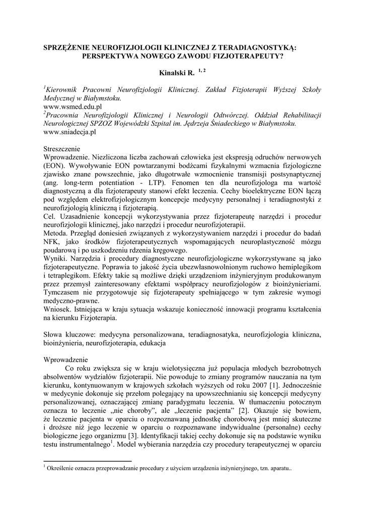 SPRZĘŻENIE NEUROFIZJOLOGII KLINICZNEJ Z TERADIAGNOSTYKĄ: PERSPEKTYWA NOWEGO ZAWODU FIZJOTERAPEUTY? Kinalski R. 1, 2 1 Kierownik Pracowni Neurofizjologii Klinicznej. Zakład Fizjoterapii Wyższej Szkoły Medycznej w Białymstoku. www.wsmed.edu.pl 2 Pracownia Neurofizjologii Klinicznej i Neurologii Odtwórczej. Oddział Rehabilitacji Neurologicznej SPZOZ Wojewódzki Szpital im. Jędrzeja Śniadeckiego w Białymstoku. www.sniadecja.pl Streszczenie Wprowadzenie. Niezliczona liczba zachowań człowieka jest ekspresją odruchów nerwowych (EON). Wywoływanie EON powtarzanymi bodźcami fizykalnymi wzmacnia fizjologiczne zjawisko znane powszechnie, jako długotrwałe wzmocnienie transmisji postsynaptycznej (ang. long-term potentiation - LTP). Fenomen ten dla neurofizjologa ma wartość diagnostyczną a dla fizjoterapeuty stanowi efekt leczenia. Cechy bioelektryczne EON łączą pod względem elektrofizjologicznym koncepcje medycyny personalnej i teradiagnostyki z neurofizjologią kliniczną i fizjoterapią. Cel. Uzasadnienie koncepcji wykorzystywania przez fizjoterapeutę narzędzi i procedur neurofizjologii klinicznej, jako narzędzi i procedur neurofizjoterapii. Metoda. Przegląd doniesień związanych z wykorzystywaniem narzędzi i procedur do badań NFK, jako środków fizjoterapeutycznych wspomagających neuroplastyczność mózgu poudarową i po uszkodzeniu rdzenia kręgowego. Wyniki. Narzędzia i procedury diagnostyczne neurofizjologiczne wykorzystywane są jako fizjoterapeutyczne. Poprawia to jakość życia ubezwłasnowolnionym ruchowo hemiplegikom i tetraplegikom. Efekty takie są możliwe dzięki urządzeniom inżynieryjnym produkowanym przez przemysł zainteresowany efektami współpracy neurofizjologów z bioinżynieriami. Tymczasem nie przygotowuje się fizjoterapeuty spełniającego w tym zakresie wymogi medyczno-prawne. Wniosek. Istniejąca w kraju sytuacja wskazuje konieczność innowacji programu kształcenia na kierunku Fizjoterapia. Słowa kluczowe: medycyna personalizowana, teradiagnosatyka, neurofizjologia kliniczna, bioinżynieria, neurofizjoterapia, edukacja Wprowadzenie Co roku zwiększa się w kraju wielotysięczna już populacja młodych bezrobotnych absolwentów wydziałów fizjoterapii. Nie powoduje to zmiany programów nauczania na tym kierunku, kontynuowanym w krajowych szkołach wyższych od roku 2007 [1]. Jednocześnie w medycynie dokonuje się przełom polegający na upowszechnianiu się koncepcji medycyny personalizowanej, oznaczającej zmianę paradygmatu leczenia. W tłumaczeniu potocznym oznacza to leczenie „nie choroby”, ale „leczenie pacjenta” [2]. Okazuje się bowiem, że leczenie pacjenta w oparciu o rozpoznawaną jednostkę chorobową jest mniej skuteczne i droższe niż jego leczenie w oparciu o rozpoznawane indywidualne (personalne) cechy biologiczne jego organizmu [3]. Identyfikacji takiej cechy dokonuje się na podstawie wyniku testu instrumentalnego1. Model wybierania narzędzia czy procedury terapeutycznej w oparciu 1 Określenie oznacza przeprowadzanie procedury z użyciem urządzenia inżynieryjnego, tzn. aparatu.. o wynik testu instrumentalnego, został nazwany terapią diagnostyczną (teradiagnostyką) [4]. To nowe pojęcie, znane i rozumiane w środowisku np. onkologów, w środowisku fizjoterapeutów nie jest jeszcze upowszechnione. Tymczasem koszty związane z leczeniem chorób i następstw urazów ośrodkowego układu nerwowego (OUN) obciążają podatników. Uzasadnia to oczekiwanie świadczeniobiorcy na dostępność do wysokiej jakości usługi świadczeniodawcy. Zgłaszająca się lub skierowana do fizjoterapeuty osoba z zaburzoną mózgową kontrolą zachowań ruchowych, powstałą po doznanym uszkodzeniu OUN, pragnie odzyskać jak najszybciej i w możliwie największym zakresie zdolność do samodzielnego funkcjonowania. Dążenie do tego wymaga wspomagania toczących się samoistnie w OUN reaktywnych procesów neuroregeneracji i neuroplastyczności, bądź ich prowokowania zewnętrzną interwencją czynnikami fizykalnymi2. Procesy neuroplastyczności OUN, będące od lat Dekady Mózgu (1990-2000) przedmiotem przedklinicznych instrumentalnych badań naukowych, stały się szybko celem klinicznych instrumentalnych badań zarówno naukowych jak i usługowych. Dzięki rozwojowi nowych technologii, diagnostyczne dotychczas narzędzia i procedury wykorzystywane są jako narzędzia i procedury wspomagające procesy neuroplastyczności. Przykładem takiego przełomu jest neurofizjologia kliniczna (NFK) [5]. Badania NFK należą do kategorii elektrofizjologicznych badań instrumentalnych przeprowadzanych u pacjentów z uszkodzeniem OUN. Wyniki tych badań obiektywizują i kwantyfikują w jednostkach SI3 ekspresję odruchów nerwowych wywoływanych bodźcami fizykalnymi. Odruch nerwowy może być wywoływany pojedynczym lub wielokrotnie powtarzanym bodźcem fizykalnym. Częstotliwość (w Hz) wywoływania odruchowej odpowiedzi OUN jest ściśle związana z częstotliwością aktywacji neuronów i/lub sieci neuronowych OUN. Wywoływanie odruchów nerwowych bodźcami fizykalnymi powtarzanymi z wybraną częstotliwością, może prowadzić do utrwalenia się w mikrostrukturach OUN fizjologicznego zjawiska t.j. długotrwałego wzmocnienia transmisji postsynaptycznej (ang. long-term potentiation-LTP) [6]. W przypadku instrumentalnego wywoływania zjawiska LTP bodźcami fizykalnymi, a takie są podstawowymi czynnikami fizjoterapeutycznymi jak i instrumentalnie oddziaływają na OUN, zjawisko LTP powinno być rozumiane nie tylko jako zobiektywizowany wynik badania , ale także jako zobiektywizowany wynik leczenia. Wywoływanie instrumentalne u hemiplegika czy tetraplegika zjawiska LTP może mieć zatem, w zależności od celu postępowania medycznego, znaczenie dwojakie. Dla neurofizjologa klinicznego LTP ma wartość wyniku diagnostycznego natomiast dla neurofizjoterapeuty LTP ma wartość efektu terapeutycznego. Zestawiane w tym świetl