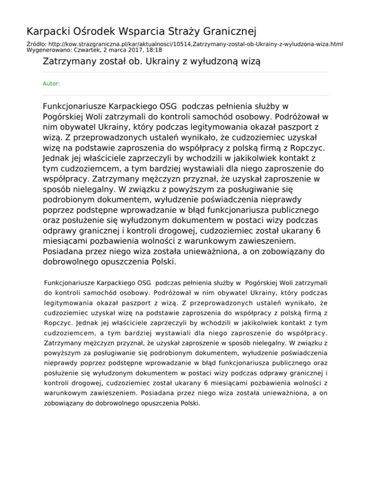 Karpacki Ośrodek Wsparcia Straży Granicznej Źródło: http://kow.strazgraniczna.pl/kar/aktualnosci/10514,Zatrzymany-zostal-ob-Ukrainy-z-wyludzona-wiza.html Wygenerowano: Czwartek, 2 marca 2017, 18:18 Zatrzymany został ob. Ukrainy z wyłudzoną wizą Autor: Funkcjonariusze Karpackiego OSG podczas pełnienia służby w Pogórskiej Woli zatrzymali do kontroli samochód osobowy. Podróżował w nim obywatel Ukrainy, który podczas legitymowania okazał paszport z wizą. Z przeprowadzonych ustaleń wynikało, że cudzoziemiec uzyskał wizę na podstawie zaproszenia do współpracy z polską firmą z Ropczyc. Jednak jej właściciele zaprzeczyli by wchodzili w jakikolwiek kontakt z tym cudzoziemcem, a tym bardziej wystawiali dla niego zaproszenie do współpracy. Zatrzymany mężczyzn przyznał, że uzyskał zaproszenie w sposób nielegalny. W związku z powyższym za posługiwanie się podrobionym dokumentem, wyłudzenie poświadczenia nieprawdy poprzez podstępne wprowadzanie w błąd funkcjonariusza publicznego oraz posłużenie się wyłudzonym dokumentem w postaci wizy podczas odprawy granicznej i kontroli drogowej, cudzoziemiec został ukarany 6 miesiącami pozbawienia wolności z warunkowym zawieszeniem. Posiadana przez niego wiza została unieważniona, a on zobowiązany do dobrowolnego opuszczenia Polski. Funkcjonariusze Karpackiego OSG podczas pełnienia służby w Pogórskiej Woli zatrzymali do kontroli samochód osobowy. Podróżował w nim obywatel Ukrainy, który podczas legitymowania okazał paszport z wizą. Z przeprowadzonych ustaleń wynikało, że cudzoziemiec uzyskał wizę na podstawie zaproszenia do współpracy z polską firmą z Ropczyc. Jednak jej właściciele zaprzeczyli by wchodzili w jakikolwiek kontakt z tym cudzoziemcem, a tym bardziej wystawiali dla niego zaproszenie do współpracy. Zatrzymany mężczyzn przyznał, że uzyskał zaproszenie w sposób nielegalny. W związku z powyższym za posługiwanie się podrobionym dokumentem, wyłudzenie poświadczenia nieprawdy poprzez podstępne wprowadzanie w błąd funkcjonariusza publicznego oraz posłużenie się wyłudzonym dokumentem w postaci wizy podczas odprawy granicznej i kontroli drogowej, cudzoziemiec został ukarany 6 miesiącami pozbawienia wolności z warunkowym zawieszeniem. Posiadana przez niego wiza została unieważniona, a on zobowiązany do dobrowolnego opuszczenia Polski.
