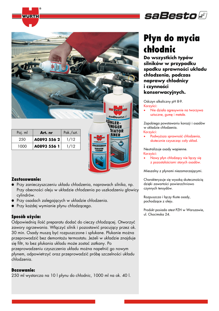 Płyn do mycia chłodnic Do wszystkich typów silników w przypadku spadku sprawności układu chłodzenia, podczas naprawy chłodnicy i czynności konserwacyjnych. Odczyn alkaliczny pH 8-9. Korzyści: Nie działa agresywnie na tworzywa sztuczne, gumę i metale. Poj. ml Art. nr Pak./szt. 250 A0893 556 2 1/12 1000 A0893 556 1 1/12 Zapobiega powstawaniu korozji i osadów w układzie chłodzenia. Korzyści: Podwyższa sprawność chłodzenia, skutecznie czyszcząc cały układ. Neutralizuje osady wapienne. Korzyści: Nowy płyn chłodzący nie łączy się z pozostałościami starych osadów. Mieszalny z płynami niezamarzającymi. Zastosowanie: Przy zanieczyszczeniu układu chłodzenia, naprawach silnika, np. Przy obecności oleju w układzie chłodzenia po uszkodzeniu głowicy cylindrów. ● Przy osadach zalegających w układzie chłodzenia. ● Przy każdej wymianie płynu chłodzącego. ● Sposób użycia: Odpowiednią ilość preparatu dodać do cieczy chłodzącej. Otworzyć zawory ogrzewania. Włączyć silnik i pozostawić pracujący przez ok. 30 min. Osady muszą być rozpuszczone i spłukane. Płukanie można przeprowadzić bez demontażu termostatu. Jeżeli w układzie znajduje się filtr, to bez płukania układu może zostać zatkany. Po przeprowadzeniu czyszczenia układu można napełnić go nowym płynem, odpowietrzyć oraz przeprowadzić próbę szczelności układu chłodzenia. Dozowanie: 250 ml wystarcza na 10 l płynu do chłodnic, 1000 ml na ok. 40 l. Charakteryzuje się wysoką skutecznością dzięki zawartości powierzchniowo czynnych tensydów. Rozpuszcza i łączy tłuste osady, pochodzące z oleju. Produkt posiada atest PZH w Warszawie, ul. Chocimska 24.