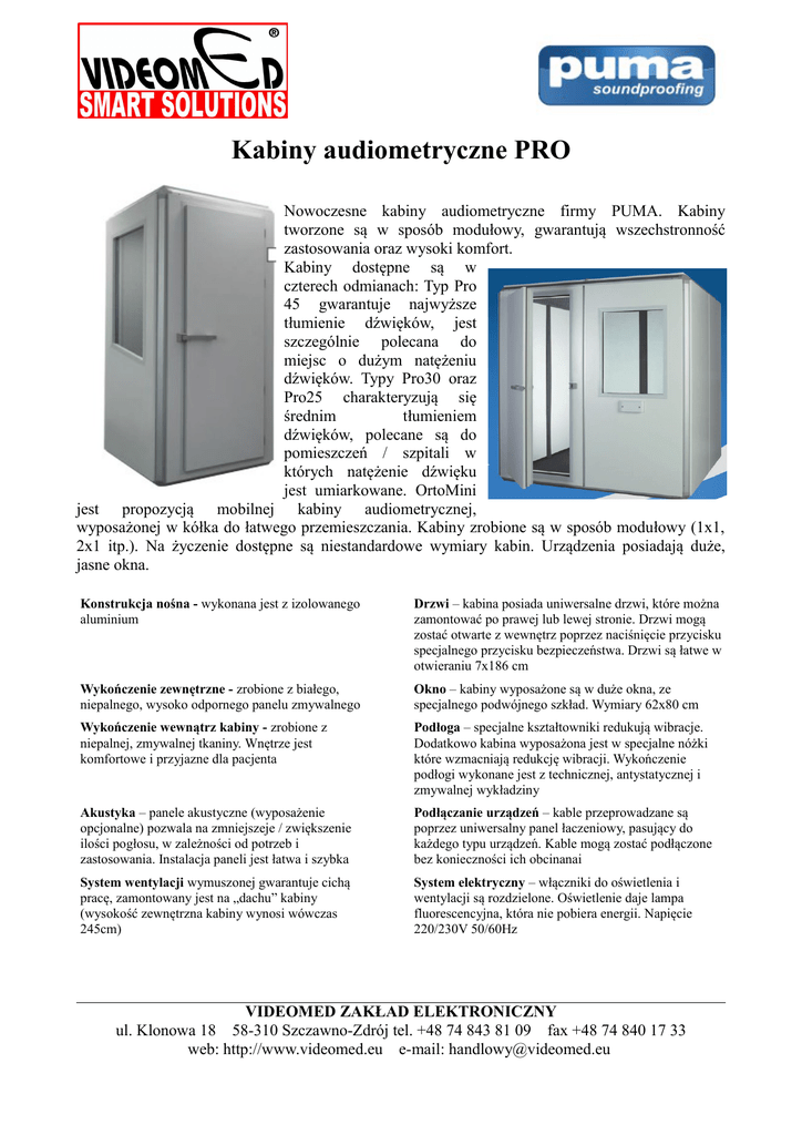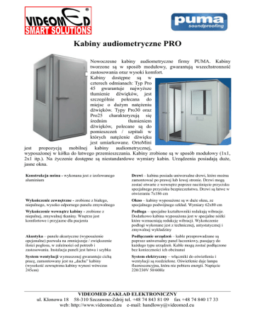 Kabiny audiometryczne PRO Nowoczesne kabiny audiometryczne firmy PUMA. Kabiny tworzone są w sposób modułowy, gwarantują wszechstronność zastosowania oraz wysoki komfort. Kabiny dostępne są w czterech odmianach: Typ Pro 45 gwarantuje najwyższe tłumienie dźwięków, jest szczególnie polecana do miejsc o dużym natężeniu dźwięków. Typy Pro30 oraz Pro25 charakteryzują się średnim tłumieniem dźwięków, polecane są do pomieszczeń / szpitali w których natężenie dźwięku jest umiarkowane. OrtoMini jest propozycją mobilnej kabiny audiometrycznej, wyposażonej w kółka do łatwego przemieszczania. Kabiny zrobione są w sposób modułowy (1x1, 2x1 itp.). Na życzenie dostępne są niestandardowe wymiary kabin. Urządzenia posiadają duże, jasne okna. Konstrukcja nośna - wykonana jest z izolowanego aluminium Drzwi – kabina posiada uniwersalne drzwi, które można zamontować po prawej lub lewej stronie. Drzwi mogą zostać otwarte z wewnętrz poprzez naciśnięcie przycisku specjalnego przycisku bezpieczeństwa. Drzwi są łatwe w otwieraniu 7x186 cm Wykończenie zewnętrzne - zrobione z białego, niepalnego, wysoko odpornego panelu zmywalnego Okno – kabiny wyposażone są w duże okna, ze specjalnego podwójnego szkład. Wymiary 62x80 cm Wykończenie wewnątrz kabiny - zrobione z niepalnej, zmywalnej tkaniny. Wnętrze jest komfortowe i przyjazne dla pacjenta Podłoga – specjalne kształtowniki redukują wibracje. Dodatkowo kabina wyposażona jest w specjalne nóżki które wzmacniają redukcję wibracji. Wykończenie podłogi wykonane jest z technicznej, antystatycznej i zmywalnej wykładziny Akustyka – panele akustyczne (wyposażenie opcjonalne) pozwala na zmniejszeje / zwiększenie ilości pogłosu, w zależności od potrzeb i zastosowania. Instalacja paneli jest łatwa i szybka Podłączanie urządzeń – kable przeprowadzane są poprzez uniwersalny panel łaczeniowy, pasujący do każdego typu urządzeń. Kable mogą zostać podłączone bez konieczności ich obcinanai System wentylacji wymuszonej gwarantuje cichą pracę, zamontowany jest na „dachu” kabiny (wysokość zewnętrzna kabiny wynosi wówczas 245cm) System elektryczny – włączniki do oświetlenia i wentylacji są rozdzielone. Oświetlenie daje lampa fluorescencyjna, która nie pobiera energii. Napięcie 220/230V 50/60Hz VIDEOMED ZAKŁAD ELEKTRONICZNY ul. Klonowa 18 58-310 Szczawno-Zdrój tel. +48 74 843 81 09 fax +48 74 840 17 33 web: http://www.videomed.eu e-mail: [email protected] Mobilna kabina audiometryczna OtroMini Typ Wymiary zewnętrzne Wymiary wewnętrzne Opis Wyposażenie Otro Mini 101x82x203 80x60x168 do badań przesiewowych kabina, oswietlenie, wieszak na słuchawki, uniwersalny panel łączeniowy, zewnętrzny składany stolik, kółka Mini kabina audiometryczna Pro25 (umiarkowane tłumienie dźwięków) Typ Wymiary zewnętrzne Wymiary wewnętrzne Opis Wyposażenie Pro 25 97x97x192 83x83x180 do badań przesiewowych kabina, oswietlenie, wieszak na słuchawki, uniwersalny panel łączeniowy, zewnętrzny składany stolik (dla tego modelu nie jest dostepna dodatkowa wentylacja powietrzna) Kabina z serii Pro 30 (umiarkowane tłumienie dźwięków) Typ Wymiary zewnętrzne Wymiary wewnętrzne Opis Wyposażenie Pro 30 mini 200x70x170 85x55x155 do badań przesiewowych kabina, oswietlenie, wieszak na słuchawki, uniwersalny panel łączeniowy Pro 30 1x1 106x106x218 (245 91x91x202 z wentylacją powietrzną) do badań przesiewowych kabina, oswietlenie, wieszak na słuchawki, uniwersalny panel łączeniowy Pro 30 maxi 132x132x218 (245 117x117x202 w wentylacją powietrzną) do badań w wolnym polu kabina, oswietlenie, uniwersalny paenel łączeniowy, zewnętrzny składany stolik, wewnętrzne gniazdo zasilania, wieszak na słuchawki oraz stojak na głośnik Pro 30 2x1 209x209x218 (245 194x91x202 w wentylacją powietrzną) do badań w wolnym polu kabina, oswietlenie, wieszak na słuchawki, uniwersalny panel łączeniowy Pro 30 2x2 209x209x218 (245 194x194x202 w wentylacją powietrzną) do badań w wolnym polu kabina, oswietlenie, wieszak na słuchawki, uniwersalny panel łączeniowy Dostępne akcesoria: wentylacja powietrzna mała, wentylacja poweitrzna duża, zewnętrzny składany stolik specjalne wymiary na żądanie, podjazd dla wózków, światło alarmowe, wewnętrzne gniazdo zasilania Kabiny z serii Pro 45 (bardzo wysokie tłumienie dźwięków) Typ Wymiary zewnętrzne Wymiary wewnętrzne Opis Wyposażenie 100x100x200 do badań przesiewowych kabina, oswietlenie, wieszak na słuchawki, uniwersalny panel łączeniowy Pro 45S maxi (1 air) 132x132x220 (245 z 118x118x200 wentylacjąpowietrzną ) do badań w wolnym polu kabina, oswietlenie, wieszak na słuchawki, uniwersalny panel łączeniowy, wentylacja powietrzna Pro 45S 2x1 (1 Air) 216x114x220 (245 z wentylacją powietrzną) 202x100x200 do badań w wolnym polu kabina, oswietlenie, wieszak na słuchawki, uniwersalny panel łączeniowy, wentylacja powietrzna Pro 45S 2x2 (1 Air) 216x216x220 (245 z wentylacją powietrzną) 202x202x200 do badań w wolnym polu kabina, oswietlenie, wieszak na słuchawki, uniwersalny panel łączeniowy, wentylacja powietrzna Pro 45s 114x114x220 (245 z 1x1 (1 air) wentylacją powietrzną) Akcesoria: Panel akustyczny (6szt, wewnętrzny), zewnętrzny składany stolik, specjalne wymiary na żądanie, Łatwe otwieranie drzwi, światło alarmowe, wewnętrzne gniazdo zasilania VIDEOMED ZAKŁAD ELEKTRONICZNY ul. Klonowa 18 58-310 Szczawno-Zdrój tel. +48 74 843 81 09 fax +48 74 840 17 33 web: http://www.videomed.eu e-mail: [email protected] Pro 30 Wymiary Długość zew/ wew Szerokość zew/wew Wysokość zew/wew powierzchnia waga Nacisk kg/mkw System wentylacji 1x1 mini 100/85 70/55 170/155 0,7 144 - Nie dostępny 1x1 106/91 106/91 205 1 mały 132/117 132/117 300 173 2x1 209/194 106/91 218/202 * (245 z 1,12 systemem 1,74 wentylacji) 2,22 230 1x1 maxi 364 164 2x2 209/194 209/194 4,37 540 124 3x2 311/296 209/194 6,5 71