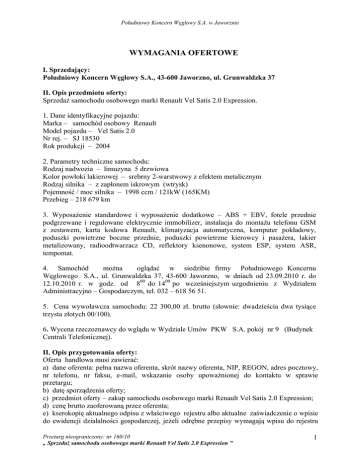 Południowy Koncern Węglowy S.A. w Jaworznie WYMAGANIA OFERTOWE I. Sprzedający: Południowy Koncern Węglowy S.A., 43-600 Jaworzno, ul. Grunwaldzka 37 II. Opis przedmiotu oferty: Sprzedaż samochodu osobowego marki Renault Vel Satis 2.0 Expression. 1. Dane identyfikacyjne pojazdu: Marka – samochód osobowy Renault Model pojazdu – Vel Satis 2.0 Nr rej. – SJ 18530 Rok produkcji – 2004 2. Parametry techniczne samochodu: Rodzaj nadwozia – limuzyna 5 drzwiowa Kolor powłoki lakierowej – srebrny 2-warstwowy z efektem metalicznym Rodzaj silnika – z zapłonem iskrowym (wtrysk) Pojemność / moc silnika – 1998 ccm / 121kW (165KM) Przebieg – 218 679 km 3. Wyposażenie standardowe i wyposażenie dodatkowe – ABS + EBV, fotele przednie podgrzewane i regulowane elektrycznie immobilizer, instalacja do montażu telefonu GSM z zestawem, karta kodowa Renault, klimatyzacja automatyczna, komputer pokładowy, poduszki powietrzne boczne przednie, poduszki powietrzne kierowcy i pasażera, lakier metalizowany, radioodtwarzacz CD, reflektory ksenonowe, system ESP, system ASR, tempomat. 4. Samochód można oglądać w siedzibie firmy Południowego Koncernu Węglowego S.A., ul. Grunwaldzka 37, 43-600 Jaworzno, w dniach od 23.09.2010 r. do 12.10.2010 r. w godz. od 800 do 1400 po wcześniejszym uzgodnieniu z Wydziałem Administracyjno – Gospodarczym, tel. 032 – 618 56 51. 5. Cena wywoławcza samochodu: 22 300,00 zł. brutto (słownie: dwadzieścia dwa tysiące trzysta złotych 00/100). 6. Wycena rzeczoznawcy do wglądu w Wydziale Umów PKW S.A. pokój nr 9 (Budynek Centrali Telefonicznej). II. Opis przygotowania oferty: Oferta handlowa musi zawierać: a) dane oferenta: pełna nazwa oferenta, skrót nazwy oferenta, NIP, REGON, adres pocztowy, nr telefonu, nr faksu, e-mail, wskazanie osoby upoważnionej do kontaktu w sprawie przetargu; b) datę sporządzenia oferty; c) przedmiot oferty – zakup samochodu osobowego marki Renault Vel Satis 2.0 Expression; d) cenę brutto zaoferowaną przez oferenta; e) kserokopię aktualnego odpisu z właściwego rejestru albo aktualne zaświadczenie o wpisie do ewidencji działalności gospodarczej, jeżeli odrębne przepisy wymagają wpisu do rejestru Przetarg nieograniczony: nr 160/10 „ Sprzedaż samochodu osobowego marki Renault Vel Satis 2.0 Expression ” 1 Południowy Koncern Węglowy S.A. w Jaworznie lub zgłoszenia do ewidencji działalności gospodarczej, wystawione nie wcześniej niż 6 miesięcy przed upływem terminu składania ofert (dotyczy osób prawnych); f) dowód wpłacenia wadium; g) warunki płatności; Za datę zapłaty przyjmuje się dzień uznania rachunku bankowego lub dzień wpłaty w kasie Sprzedającego. h) forma płatności – przelew lub wpłata w kasie; i) kserokopia dokumentów REGON i NIP (dotyczy osób prawnych); j) nr dowodu osobistego, PESEL, NIP (dotyczy osób fizycznych); k) termin związania z ofertą – 30 dni, przy czym bieg tego terminu rozpoczyna się wraz z upływem terminu składania ofert ( dzień, w którym upływa termin składania ofert jest pierwszym dniem terminu związania ofertą); l) oświadczenie, że oferent znajduje się w sytuacji ekonomicznej i finansowej zapewniającej nabycie przedmiotu przetargu; ł) oświadczenie, że oferent zapoznał się z wymaganiami ofertowymi i przyjmuje je bez zastrzeżeń. m) oświadczenie, że oferent wyraża zgodę na podpisanie umowy zgodnie z załączonym wzorem. III. Termin i miejsce składania ofert 1. Ofertę należy złożyć w jednym, nieprzejrzystym, zaklejonym opakowaniu w: Południowy Koncern Węglowy S.A. w Jaworznie, ul. Grunwaldzka 37, Kancelaria Główna (Budynek Zarządu – parter), pokój nr 5 do dnia 13.10.2010 r. godz. 14.00. Na opakowaniu oferty należy umieścić: a) Nazwę i siedzibę oferenta b) Nazwę i siedzibę Zamawiającego c) Napis: „Nr przetargu:…(wpisać numer).... Przetarg na: „Sprzedaż samochodu osobowego marki Renault Vel Satis 2.0 Expression” IV. Wadium 1. Przystępujący do przetargu winien wnieść wadium w wysokości 2 230,00 zł. (słownie: dwa tysiące dwieście trzydzieści złotych 00/100) w terminie do dnia poprzedzającego komisyjne otwarcie ofert. 2. Wpłaty wadium należy dokonać na konto: Południowy Koncern Węglowy S.A. Bank Pekao SA nr rachunku 54 1240 1356 1111 0010 0672 4309, z wpisaniem na dowodzie wpłaty hasła: „Wadium na przetarg – sprzedaż samochodu osobowego marki Renault Vel Satis 2.0 Expression” lub w kasie PKW S.A. czynnej: poniedziałek, wtorek, czwartek, piątek w godz. 1100 – 1400, środa w godz. 700 – 1000 i 1200 – 1400. V. Zwrot wadium 1. Zwrot wadium oferentom, których oferty nie zostały wybrane w wyniku przetargu, powinien nastąpić niezwłocznie po zakończeniu przetargu, nie później jednak niż w ciągu 7 dni po terminie rozstrzygnięcia przetargu. 2.Wadium złożone przez oferenta, którego ofertę wybrano, zalicza się na poczet ceny nabycia. Przetarg nieograniczony: nr 160/10 „ Sprzedaż samochodu osobowego marki Renault Vel Satis 2.0 Expression ” 2 Południowy Koncern Węglowy S.A. w Jaworznie 3. Wadium będzie zwracane w tej samej formie w jakiej zostało wniesione o ile nie zostało zaliczone na poczet ceny kupna. 4. Sprzedający jest uprawniony do zatrzymania wadium, jeżeli Oferent, którego oferta została wybrana: a) odmówił podpisania umowy na warunkach określonych w ofercie, b) zawarcie umowy stało się niemożliwe z przyczyn leżących po stronie Oferenta. 5. Zwrotu wadium oferentom, których oferty wpłynęły po terminie i zostały odrzucone w części jawnej przetargu, Sprzedający dokona niezwłocznie po zakończeniu części jawnej przetargu. VI. Przewidywany termin realizacji przedmiotu przetargu: IV kwartał 2010 roku. VII. Projekt umowy Przy określaniu warunków oferty oferent powinien zapoznać się z projektem umowy Sprzedającego. VIII. Tryb udzielania wyjaśnień Wszelkich wyjaśnień dotyczących przetargu udzielają: a) w sprawach tech