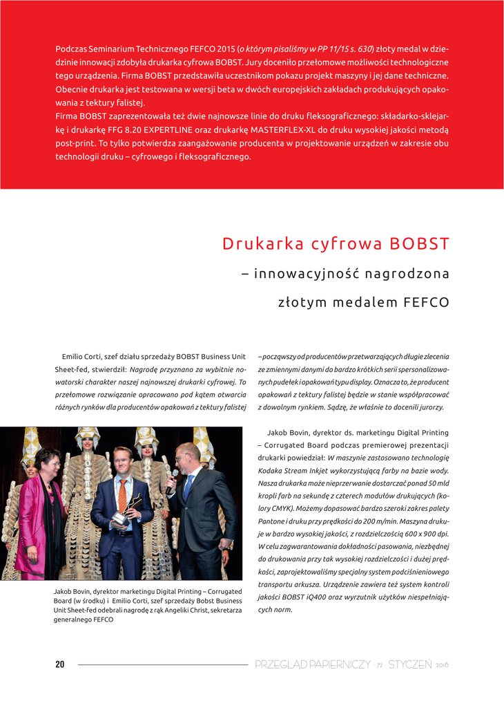 Podczas Seminarium Technicznego FEFCO 2015 (o którym pisaliśmy w PP 11/15 s. 630) złoty medal w dzieOPAKOWANIA PAPIEROWE dzinie innowacji zdobyła drukarka cyfrowa BOBST. Jury doceniło przełomowe możliwości technologiczne tego urządzenia. Firma BOBST przedstawiła uczestnikom pokazu projekt maszyny i jej dane techniczne. Obecnie drukarka jest testowana w wersji beta w dwóch europejskich zakładach produkujących opakowania z tektury falistej. Firma BOBST zaprezentowała też dwie najnowsze linie do druku fleksograficznego: składarko-sklejarkę i drukarkę FFG 8.20 EXPERTLINE oraz drukarkę MASTERFLEX-XL do druku wysokiej jakości metodą post-print. To tylko potwierdza zaangażowanie producenta w projektowanie urządzeń w zakresie obu technologii druku – cyfrowego i fleksograficznego. Drukarka c yfrowa BOBST – i nnowa c y j no ść na g r o d zo n a z ł o ty m med a l em F EFCO Emilio Corti, szef działu sprzedaży BOBST Business Unit – począwszy od producentów przetwarzających długie zlecenia Sheet-fed, stwierdził: Nagrodę przyznano za wybitnie no- ze zmiennymi danymi do bardzo krótkich serii spersonalizowa- watorski charakter naszej najnowszej drukarki cyfrowej. To nych pudełek i opakowań typu display. Oznacza to, że producent przełomowe rozwiązanie opracowano pod kątem otwarcia opakowań z tektury falistej będzie w stanie współpracować różnych rynków dla producentów opakowań z tektury falistej z dowolnym rynkiem. Sądzę, że właśnie to docenili jurorzy. Jakob Bovin, dyrektor ds. marketingu Digital Printing – Corrugated Board podczas premierowej prezentacji drukarki powiedział: W maszynie zastosowano technologię Kodaka Stream Inkjet wykorzystującą farby na bazie wody. Nasza drukarka może nieprzerwanie dostarczać ponad 50 mld kropli farb na sekundę z czterech modułów drukujących (kolory CMYK). Możemy dopasować bardzo szeroki zakres palety Pantone i druku przy prędkości do 200 m/min. Maszyna drukuje w bardzo wysokiej jakości, z rozdzielczością 600 x 900 dpi. W celu zagwarantowania dokładności pasowania, niezbędnej do drukowania przy tak wysokiej rozdzielczości i dużej prędkości, zaprojektowaliśmy specjalny system podciśnieniowego Jakob Bovin, dyrektor marketingu Digital Printing – Corrugated Board (w środku) i Emilio Corti, szef sprzedaży Bobst Business Unit Sheet-fed odebrali nagrodę z rąk Angeliki Christ, sekretarza generalnego FEFCO 20 transportu arkusza. Urządzenie zawiera też system kontroli jakości BOBST iQ400 oraz wyrzutnik użytków niespełniających norm. PRZEGLĄD PAPIERNICZY · 72 · STYCZEŃ 2016