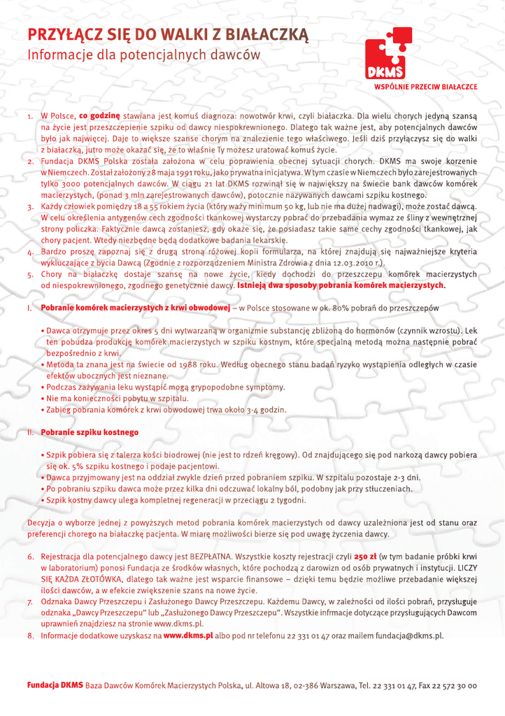 Przyłącz się do walki z białaczką Informacje dla potencjalnych dawców 1.W Polsce, co godzinę stawiana jest komuś diagnoza: nowotwór krwi, czyli białaczka. Dla wielu chorych jedyną szansą na życie jest przeszczepienie szpiku od dawcy niespokrewnionego. Dlatego tak ważne jest, aby potencjalnych dawców było jak najwięcej. Daje to większe szanse chorym na znalezienie tego właściwego. Jeśli dziś przyłączysz się do walki z białaczką, jutro może okazać się, że to właśnie Ty możesz uratować komuś życie. 2. Fundacja DKMS Polska została założona w celu poprawienia obecnej sytuacji chorych. DKMS ma swoje korzenie w Niemczech. Został założony 28 maja 1991 roku, jako prywatna inicjatywa. W tym czasie w Niemczech było zarejestrowanych tylko 3000 potencjalnych dawców. W ciągu 21 lat DKMS rozwinął się w największy na świecie bank dawców komórek macierzystych, (ponad 3 mln zarejestrowanych dawców), potocznie nazywanych dawcami szpiku kostnego. 3.Każdy człowiek pomiędzy 18 a 55 rokiem życia (który waży minimum 50 kg, lub nie ma dużej nadwagi), może zostać dawcą. W celu określenia antygenów cech zgodności tkankowej wystarczy pobrać do przebadania wymaz ze śliny z wewnętrznej strony policzka. Faktycznie dawcą zostaniesz, gdy okaże się, że posiadasz takie same cechy zgodności tkankowej, jak chory pacjent. Wtedy niezbędne będą dodatkowe badania lekarskie. 4.Bardzo proszę zapoznaj się z drugą stroną różowej kopii formularza, na której znajdują się najważniejsze kryteria wykluczające z bycia Dawcą (Zgodnie z rozporządzeniem Ministra Zdrowia z dnia 12.03.2010 r.). 5. Chory na białaczkę dostaje szansę na nowe życie, kiedy dochodzi do przeszczepu komórek macierzystych od niespokrewnionego, zgodnego genetycznie dawcy. Istnieją dwa sposoby pobrania komórek macierzystych. I. Pobranie komórek macierzystych z krwi obwodowej – w Polsce stosowane w ok. 80% pobrań do przeszczepów • Dawca otrzymuje przez okres 5 dni wytwarzaną w organizmie substancję zbliżoną do hormonów (czynnik wzrostu). Lek ten pobudza produkcję komórek macierzystych w szpiku kostnym, które specjalną metodą można następnie pobrać bezpośrednio z krwi. • Metoda ta znana jest na świecie od 1988 roku. Według obecnego stanu badań ryzyko wystąpienia odległych w czasie efektów ubocznych jest nieznane. • Podczas zażywania leku wystąpić mogą grypopodobne symptomy. • Nie ma konieczności pobytu w szpitalu. • Zabieg pobrania komórek z krwi obwodowej trwa około 3-4 godzin. II. Pobranie szpiku kostnego • Szpik pobiera się z talerza kości biodrowej (nie jest to rdzeń kręgowy). Od znajdującego się pod narkozą dawcy pobiera • Dawca przyjmowany jest na oddział zwykle dzień przed pobraniem szpiku. W szpitalu pozostaje 2-3 dni. się ok. 5% szpiku kostnego i podaje pacjentowi. • Po pobraniu szpiku dawca może przez kilka dni odczuwać lokalny ból, podobny jak przy stłuczeniach. • Szpik kostny dawcy ulega kompletnej regeneracji w przeciągu 2 tygodni. Decyzja o wyborze jednej z powyższych metod pobrania komórek macierzystych od dawcy uzależniona jest od stanu oraz preferencji chorego na białaczkę pacjenta. W miarę możliwości bierze się pod uwagę życzenia dawcy. 6.Rejestracja dla potencjalnego dawcy jest BEZPŁATNA. Wszystkie koszty rejestracji czyli 250 zł (w tym badanie próbki krwi w laboratorium) ponosi Fundacja ze środków własnych, które pochodzą z darowizn od osób prywatnych i instytucji. LICZY SIĘ KAŻDA ZŁOTÓWKA, dlatego tak ważne jest wsparcie finansowe – dzięki temu będzie możliwe przebadanie większej ilości dawców, a w efekcie zwiększenie szans na nowe życie. 7.Odznaka Dawcy Przeszczepu i Zasłużonego Dawcy Przeszczepu. Każdemu Dawcy, w zależności od ilości pobrań, przysługuje odznaka „Dawcy Przeszczepu” lub „Zasłużonego Dawcy Przeszczepu”. Wszystkie infrmacje dotyczące przysługujących Dawcom uprawnień znajdziesz na stronie www.dkms.pl. 8. Informacje dodatkowe uzyskasz na www.dkms.pl albo pod nr telefonu 22 331 01 47 oraz mailem [email protected]. Fundacja DKMS Baza Dawców Komórek Macierzystych Polska, ul. Altowa 18, 02-386 Warszawa, Tel. 22 331 01 47, Fax 22 572 30 00