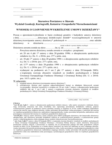 …………………………. ................................................... miejscowość, data (imię i nazwisko) ...………………………………. .................................................... (adres zamieszkania ) Starostwo Powiatowe w Sławnie Wydział Geodezji, Kartografii, Katastru i Gospodarki Nieruchomościami WNIOSEK O UJAWNIENIE/WYKREŚLENIE UMOWY DZIERŻAWY* Proszę o ujawnienie/wykreślenie w bazie ewidencji gruntów i budynków umowy dzierżawy z dnia……………………..dotyczącej działek/części działek* wyszczególnionych w umowie dzierżawy/rozwiązania umowy dzierżawy* położonych w …………………………oraz udziału dzierżawcy w dzierżawie…..………………………………………………………………. (podać wielkość w postaci ułamka zwykłego) Dzierżawa zawarta została na okres …………lat, tj. od……………… do …………………… Powyższa umowa dzierżawy została zawarta w związku z przepisami: art. 28 ust. 4 pkt 1* ustawy z dnia 20 grudnia 1990r. o ubezpieczeniu społecznym rolników (t.j. Dz. U. z 2016r. poz. 277 z późn. zm), art. 38 pkt 1* ustawy z dnia 20 grudnia 1990 r. o ubezpieczeniu społecznym rolników (t.j. Dz. U. z 2016r. poz. 277 z późn. zm), art. 117* ustawy z dnia 20 grudnia 1990 r. o ubezpieczeniu społecznym rolników (t.j. Dz. U. z 2016r. poz. 277 z późn. zm.), wydanymi na podstawie art. 3 ust. 2 pkt 1* ustawy z dnia 28 listopada 2003r. o wspieraniu rozwoju obszarów wiejskich ze środków pochodzących z Sekcji Gwarancji Europejskiego Funduszu Orientacji i Gwarancji Rolnej (Dz. U. z 2014r. poz. 1613 z późn. zm.). W załączeniu: 1. oryginał umowy dzierżawy/rozwiązania umowy dzierżawy*, 2. oświadczenie złożone pod rygorem odpowiedzialności karnej za składanie fałszywych zeznań (w przypadku dzierżaw zawartych w związku art. 28 ust. 4 pkt 1 ustawy o ubezpieczeniu społecznym rolników lub art. 3 ust. 2 pkt 1 ustawy o wspieraniu rozwoju obszarów wiejskich ze środków pochodzących z Sekcji Gwarancji Europejskiego Funduszu Orientacji i Gwarancji Rolnej). ….………………………… czytelny podpis – imię i nazwisko UWAGA *Art. 28 ust. 4 pkt 1 - ustawy o ubezpieczeniu społecznym rolników dotyczy tylko umów zawartych z rolnikami, którzy mają zawieszoną emeryturę lub rentę inwalidzką oraz zaprzestają prowadzenia działalności rolniczej, poprzez wydzierżawienie gruntów na podstawie umowy pisemnej zawartej co najmniej na 10 lat: osobie niebędącej małżonkiem emeryta lub rencisty, jego zstępnym (dziecka, wnuka, prawnuka) lub pasierbem, osobą pozostającą z emerytem lub rencistą we wspólnym gospodarstwie domowym, małżonkiem zstępnego(dziecka, wnuka, prawnuka) lub pasierba, małżonkiem osoby pozostającej z emerytem lub rencistą we wspólnym gospodarstwie domowym. *Art.38 pkt 1 dotyczy umów dzierżawy celem ustalenia przez KRUS podlegania dzierżawcy lub domownika dzierżawcy ubezpieczeniu, gdy dzierżawca prowadzi działalność rolniczą na wydzierżawionych gruntach, a wydzierżawione grunty weszły w skład gospodarstwa, które obejmuje obszar użytków rolnych powyżej 1ha przeliczeniowego. * Art. 3 ust. 2 pkt 1* ustawy z dnia 28 listopada 2003r. o wspieraniu rozwoju obszarów wiejskich ze środków pochodzących z Sekcji Gwarancji Europejskiego Funduszu Orientacji i Gwarancji Rolnej dotyczy: umów dzierżawy dotyczących przekazania użytków rolnych o powierzchni co najmniej 1ha na powiększenie jednego lub kilku gospodarstw rolnych zawartej na okres 10 lat. Przekazanie to w formie umowy dzierżawy nie może być dokonane na rzecz zstępnego (dziecka, wnuka, prawnuka) lub pasierba przekazującego gospodarstwo rolne, osoby pozostającej z przekazującym gospodarstwo rolne we wspólnym gospodarstwie domowym, małżonkiem zstępnego (dziecka, wnuka, prawnuka) lub pasierba przekazującego gospodarstwo rolne oraz małżonkiem osoby pozostającej z przekazującym gospodarstwo rolne we wspólnym gospodarstwie domowym. * właściwe zaznaczyć