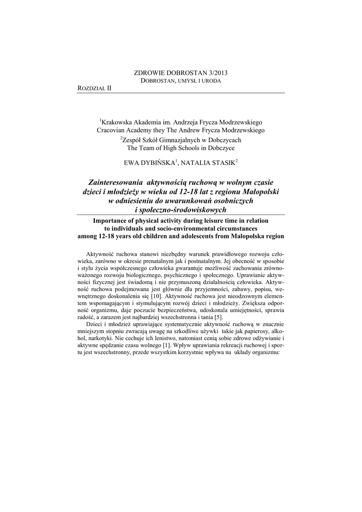 ZDROWIE DOBROSTAN 3/2013 DOBROSTAN, UMYSŁ I URODA ROZDZIAŁ II 1 Krakowska Akademia im. Andrzeja Frycza Modrzewskiego Cracovian Academy they The Andrew Frycza Modrzewskiego Zespół Szkół Gimnazjalnych w Dobczycach The Team of High Schools in Dobczyce 2 EWA DYBIŃSKA1, NATALIA STASIK2 Zainteresowania aktywnością ruchową w wolnym czasie dzieci i młodzieży w wieku od 12-18 lat z regionu Małopolski w odniesieniu do uwarunkowań osobniczych i społeczno-środowiskowych Importance of physical activity during leisure time in relation to individuals and socio-environmental circumstances among 12-18 years old children and adolescents from Malopolska region Aktywność ruchowa stanowi niezbędny warunek prawidłowego rozwoju człowieka, zarówno w okresie prenatalnym jak i postnatalnym. Jej obecność w sposobie i stylu życia współczesnego człowieka gwarantuje możliwość zachowania zrównoważonego rozwoju biologicznego, psychicznego i społecznego. Uprawianie aktywności fizycznej jest świadomą i nie przymuszoną działalnością człowieka. Aktywność ruchowa podejmowana jest głównie dla przyjemności, zabawy, popisu, wewnętrznego doskonalenia się [10]. Aktywność ruchowa jest nieodzownym elementem wspomagającym i stymulującym rozwój dzieci i młodzieży. Zwiększa odporność organizmu, daje poczucie bezpieczeństwa, udoskonala umiejętności, sprawia radość, a zarazem jest najbardziej wszechstronna i tania [5]. Dzieci i młodzież uprawiające systematycznie aktywność ruchową w znacznie mniejszym stopniu zwracają uwagę na szkodliwe używki takie jak papierosy, alkohol, narkotyki. Nie cechuje ich lenistwo, natomiast cenią sobie zdrowe odżywianie i aktywne spędzanie czasu wolnego [1]. Wpływ uprawiania rekreacji ruchowej i sportu jest wszechstronny, przede wszystkim korzystnie wpływa na układy organizmu: ZDROWIE I DOBROSTAN NR 3/2013 Dobrostan, umysł i uroda mięśniowy, krwionośny, sercowo-naczyniowy, oddechowy, jak i przyczynia się do wzrostu odporności. Aktywność ruchowa wspomaga również rozwój innych cech o charakterze społeczno- wychowawczym. Uczy systematyczności, kształci określone umiejętności i nawyki, pomaga w pokonywaniu trudności, niebezpieczeństw, pomaga w zdobywaniu sukcesów, kształtowania wytrzymałości, hartu i odwagi, kształci silną wolę i przyczynia się do wykształcenia wielu innych pozytywnych cech charakteru. Uprawiając sport w organizmie zachodzi wiele pozytywnych zmian, ważne jest jednak by ćwiczenia były systematyczne. Wykształcenie w młodym człowieku chęci do uczestniczenia regularnie w sporcie zależy od procesów nauczania i wychowania, dlatego tak ważne jest by szkoła, rodzice i środowisko pozarodzinne miało takie samo zdanie na temat uprawiania aktywności ruchowej [1]. Ważnym czynnikiem jest zainteresowanie rodziców sportem i zachęcanie dzieci do uprawiania aktywności ruchowej. Wychowanie fizyczne i sport w najbardziej widoczny sposób wpływają na sprawność dzieci i młodzieży oraz stają się głównym czynnikiem ich rozwoju motorycznego. Niestety dzieci i młodzież coraz mniej czasu poświęcają na uprawianie sportu, co doprowadza do gorszego zdrowia i bardzo niskiej sprawności fizycznej. Dzieci, które zbyt mało ćwiczą częściej mają gorsze samopoczucie, a także popadają w depresję Najlepsze rezultaty przynosi wspólne uprawianie sportu rodziców wraz z dziećmi w wieku szkolnym np. piesze wycieczki, wędrówki po górach, jazda na rowerze itp. Rodzice pokazują na własnym przykładzie, że warto się zainteresować aktywnością fizyczną. Bardzo ważnym elementem jest uświadamianie dzieciom korzyści jakie niesie ze sobą uprawianie aktywności, jest to dla nich bardzo motywujące. Zatem przedstawiając listę pozytywnych skutków z uprawiania sportu takich jak: poprawa samopoczucia, zmniejszenie stresu i napięcia, utrata masy ciała, zwiększenie sprawności i wydolności organizmu, wzrost energii życiowej i zapobieganie wielu chorobom powinno skutkować zwiększoną motywacją dzieci. Zarazem przedstawić listę negatywnych skutków, które powoduje siedzący tryb życia np. otyłość, choroby serca, osteoporoza, nadciśnienie tętnicze, depresja, brak koncentracji, ospałość i wiele innych. Systematyczne ćwiczenia ruchowe wpływają na podniesienie rozwoju somatycznego. Świadczą o tym liczne polskie i zagraniczne eksperymenty, które dowodzą, że grupy młodzieży uprawiającej sport osiągają znaczną przewagę nad rówieśnikami nie trenującymi w takich cechach wzrastania jak: wysokość, masa ciała, obwód klatki piersiowej i obwody kończyn. Realizowanie zdrowego stylu życia ma ogromne znaczenie w prawidłowym funkcjonowaniu i rozwoju organizmu szczególnie dziecięcego. Ruch oraz aktywność fizyczna są sprawą priorytetową. Są jakby fundamentem i podstawą zdrowia, najważniejszym elementem strategii w jego promocji. Przeświadczenie o potrzebie wychowania do rekreacji fizycznej we współczesnym społeczeństwie staje się coraz powszechniejsze; równocześnie można dostrzec ogromne zapotrzebowanie na badania naukowe nad wychowaniem społeczeństwa do spędzania czasu wolnego. Nie ulega wątpliwości, że rola rodziców w wy30 Ewa Dybińska, Natalia Stasik Zainteresowania aktywnością ruchową w wolnym czasie dzieci i młodzieży w wieku od 12-18 lat z regionu Małopolski w odniesieniu do uwarunkowań osobniczych i społeczno-środowiskowych chowaniu do rekreacji jest podstawowa i nie może być zastąpiona przez żadną inną placówkę wychowawczą. Warunkiem sukcesu rodziców w wychowaniu dziecka do rekreacji fizycznej będzie wygospodarowanie w ciągu dnia czasu na organizowanie zajęć ruchowych dziecka, dających także rodzicom okazję do wspólnego z nim przeżywania chwil aktywnego wypoczynku. Jednakże, jak w każdej działalności wychowawczej, tak i tutaj dużą rolę odgrywa aktywność samych dzieci. Trzeba ją tak ukierunko