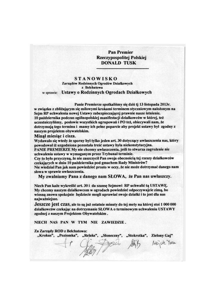 Pan Premier Rzeczypospolitej Polskiej DONALD TUSK STANOWISKO Zarządów Rodzinnych Ogrodów Działkowych z Bełchatowa w sprawie: Ustawy o Rodzinnych Ogrodach Działkowych Panie Premierze spotkaliśmy się dziś tj 13 listopada 2013r. w związku z zbliżającym się milowymi krokami terminem styczniowym nałożonym na Sejm RP uchwalenia nowej Ustawy zabezpieczającej prawnie nasze istnienie. 10 października podczas ogólnopolskiej manifestacji działkowców w której, też uczestniczyliśmy, posłowie wszystkich ugrupowań i PO też, obiecywali nam, że dotrzymają tego terminu i mamy ich pełne poparcie aby projekt ustawy był zgodny z naszym projektem obywatelskim. Minął miesiąc i cisza. Wydawało się wtedy że sporny był tylko jeden art. 30 dotyczący uwłaszczenia nas, który powodował iż uzgodniona pozostała treść ustawy była niekonstytucyjna. PANIE PREMIERZE My nie chcemy uwłaszczenia, jeśli to stwarza zagrożenie nie uchwalenia ustawy w wymaganym przez Trybunał terminie. Czy to było przyczyną, że nie zaszczycił Pan swoja obecnością tej rzeszy działkowców czekających w dniu 10 października pod gmachem Rady Ministrów? Nie wiedział Pan jak nam powiedzieć prosto w oczy, że nie może dotrzymać danego nam słowa w sprawie uwłaszczenia. My zwalniamy Pana z danego nam SŁOWA, że Pan nas uwłaszczy. Niech Pan każe wykreślić art 30 i da szansę Sejmowi RP uchwalić tą USTAWĘ. My chcemy naszym działkowcom w ogrodach powiedzieć odpoczywajcie zimą, bo wiosną znowu spokojnie będziecie mogli uprawiać swoje działki i to jest dla nas najważniejsze. Jeszcze jest czas, ale to są już ostatnie minuty do tej mety na której stoi 1 000 000 działkowców czekając na dotrzymanie SŁOWA o terminowym uchwaleniu USTAWY zgodnej z naszym Projektem Obywatelskim. NIECH NAS PAN W TYM NIE ZAWIEDZIE. Za Zarządy ROD z Bełchatowa: ,Krokus", „Poziomka", „Relaks", „Słoneczny", i / f V „Stokrotka", d Zielony Gaj"