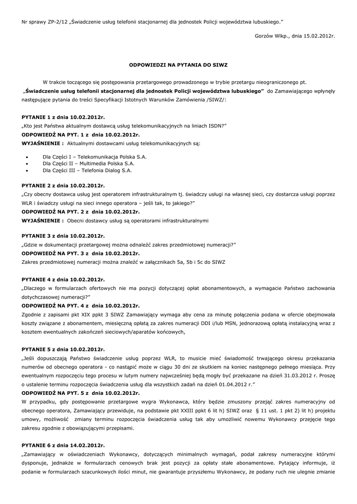 Nr sprawy ZP-2/12 „Świadczenie usług telefonii stacjonarnej dla jednostek Policji województwa lubuskiego.” Gorzów Wlkp., dnia 15.02.2012r. ODPOWIEDZI NA PYTANIA DO SIWZ W trakcie toczącego się postępowania przetargowego prowadzonego w trybie przetargu nieograniczonego pt. „Świadczenie usług telefonii stacjonarnej dla jednostek Policji województwa lubuskiego” do Zamawiającego wpłynęły następujące pytania do treści Specyfikacji Istotnych Warunków Zamówienia /SIWZ/: PYTANIE 1 z dnia 10.02.2012r. „Kto jest Państwa aktualnym dostawcą usług telekomunikacyjnych na liniach ISDN?” ODPOWIEDŹ NA PYT. 1 z dnia 10.02.2012r. WYJAŚNIENIE : Aktualnymi dostawcami usług telekomunikacyjnych są: Dla Części I – Telekomunikacja Polska S.A. Dla Części II – Multimedia Polska S.A. Dla Części III – Telefonia Dialog S.A. PYTANIE 2 z dnia 10.02.2012r. „Czy obecny dostawca usług jest operatorem infrastrukturalnym tj. świadczy usługi na własnej sieci, czy dostarcza usługi poprzez WLR i świadczy usługi na sieci innego operatora – jeśli tak, to jakiego?” ODPOWIEDŹ NA PYT. 2 z dnia 10.02.2012r. WYJAŚNIENIE : Obecni dostawcy usług są operatorami infrastrukturalnymi PYTANIE 3 z dnia 10.02.2012r. „Gdzie w dokumentacji przetargowej można odnaleźć zakres przedmiotowej numeracji?” ODPOWIEDŹ NA PYT. 3 z dnia 10.02.2012r. Zakres przedmiotowej numeracji można znaleźć w załącznikach 5a, 5b i 5c do SIWZ PYTANIE 4 z dnia 10.02.2012r. „Dlaczego w formularzach ofertowych nie ma pozycji dotyczącej opłat abonamentowych, a wymagacie Państwo zachowania dotychczasowej numeracji?” ODPOWIEDŹ NA PYT. 4 z dnia 10.02.2012r. Zgodnie z zapisami pkt XIX ppkt 3 SIWZ Zamawiający wymaga aby cena za minutę połączenia podana w ofercie obejmowała koszty związane z abonamentem, miesięczną opłatą za zakres numeracji DDI i/lub MSN, jednorazową opłatą instalacyjną wraz z kosztem ewentualnych zakończeń sieciowych/aparatów końcowych, PYTANIE 5 z dnia 10.02.2012r. „Jeśli dopuszczają Państwo świadczenie usług poprzez WLR, to musicie mieć świadomość trwającego okresu przekazania numerów od obecnego operatora - co nastąpić może w ciągu 30 dni ze skutkiem na koniec następnego pełnego miesiąca. Przy ewentualnym rozpoczęciu tego procesu w lutym numery najwcześniej będą mogły być przekazane na dzień 31.03.2012 r. Proszę o ustalenie terminu rozpoczęcia świadczenia usług dla wszystkich zadań na dzień 01.04.2012 r.” ODPOWIEDŹ NA PYT. 5 z dnia 10.02.2012r. W przypadku, gdy postępowanie przetargowe wygra Wykonawca, który będzie zmuszony przejąć zakres numeracyjny od obecnego operatora, Zamawiający przewiduje, na podstawie pkt XXIII ppkt 6 lit h) SIWZ oraz § 11 ust. 1 pkt 2) lit h) projektu umowy, możliwość zmiany terminu rozpoczęcia świadczenia usług tak aby umożliwić nowemu Wykonawcy przejęcie tego zakresu zgodnie z obowiązującymi przepisami. PYTANIE 6 z dnia 14.02.2012r. „Zamawiający w oświadczeniach Wykonawcy, dotyczących minimalnych wymagań, podał zakresy numeracyjne którymi dysponuje, jednakże w formularzach cenowych brak jest pozycji za opłaty stałe abonamentowe. Pytający informuje, iż podanie w formularzach szacunkowych ilości minut, nie gwarantuje przyszłemu Wykonawcy, że podany ruch nie ulegnie zmianie Nr sprawy ZP-2/12 „Świadczenie usług telefonii stacjonarnej dla jednostek Policji województwa lubuskiego.” w trakcie trwania umowy, ma to ogromne znaczenie ponieważ w momencie przejęcia numeracji Zamawiającego, Wykonawca będzie ponosił miesięczne opłaty które są opłatami stałymi, a których nie sposób wkalkulować w ofertę ponieważ jak zaznaczono na wstępie podany ruch jest ruchem szacunkowym. Wniosek z tego, że nie podanie w formularzu ofertowym pozycji za opłaty stałe abonamentowe, może skutkować szkodą na rzecz Wykonawcy, co jest niezgodne i narusza przepisy Ustawy Zamówień Publicznych.” ODPOWIEDŹ NA PYT. 6 z dnia 14.02.2012r. Zgodna z odpowiedzią na pyt. 4 z dnia 10.02.2012r. PYTANIE 7 z dnia 14.02.2012r. „Pytający prosi o podanie operatora macierzystego i aktualnego Zamawiającego oraz o podanie sposobu w jaki aktualnie są świadczone usługi (infrastruktura własna, WLR, MPM)?” ODPOWIEDŹ NA PYT. 7 z dnia 14.02.2012r. Zgodna z odpowiedzią na pyt. 1 i 2 z dnia 10.02.2012r. PYTANIE 8 z dnia 14.02.2012r. „Pytający informuje, iż w przypadku umów bezterminowych wypowiedzenie liczy się ze skutkiem na koniec miesiąca kalendarzowego, natomiast przy umowach terminowych , jeśli przejęcie numeracji odbywać się będzie poprzez zamówienia WLR to jest to 14 dni roboczych od momentu przekazania zamówień do TP S.A.. Natomiast jeżeli przejęcie odbywać się będzie od innego operatora niż TP S.A., to jest to minimum 21 dni roboczych od czasu dostarczenia zamówień, do odpowiednie go operatora. Tak więc, terminy które Zamawiający podał w SIWZ mogą być nie do zrealizowania przez jakiegokolwiek operatora poza aktualnym, co w sposób znaczny ogranicza konkurencyjność i narusza przepisy Ustawy Zamówień Publicznych mówiące o zasadach uczciwej konkurencji dla wszystkich Wykonawców. Pytający sugeruje zmianę terminów rozpoczęcia świadczenia usług na terminy możliwe do zrealizowania przez więcej niż jednego operatora.” ODPOWIEDŹ NA PYT. 8 z dnia 14.02.2012r. Zgodna z odpowiedzią na pyt. 5 z dnia 10.02.2012r. SKŁADAJĄC OFERTĘ WYKONAWCA MUSI UWZGLĘDNIĆ POWYŻSZE ODPOWIEDZI NA PYTANIA Z A M A W I A J Ą C Y