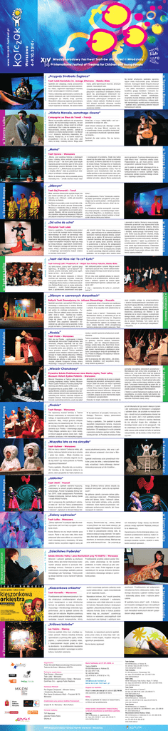 p on i e dz i a łe k , 4 .1 0 .2 01 0 r. Spektakl jest adaptacją znanej powszechnie baśni Bolesława Leśmiana o perskim podróżniku z Basry, żaglowcem opływającym nieznany świat i przeżywającym mnóstwo przygód. Twórcy widowiska zaadresowali je zarówno do widzów młodszych, jak i tych trochę starszych, szukających już własnej drogi życiowej. Wszystkich zafascynuje zapewne opowiedziana za pomocą lalek, masek i innych form plastycznych wyprawa w nieznane, nie zawsze realne Marcel na początku właściwie nie przypomina clowna. Nie ma kolorowego kostiumu, nie jest wesoły ani zabawny, nikogo nawet nie próbuje rozśmieszać. Stoi i czeka nie wiadomo na co… Rozczarowany, smutny, samotny. Jednak na widowni co chwila słychać śmiech – bo Marcel j e s t śmieszny: bezbronny, nieporadny, dziwaczny. Wydaje się, że na scenie znalazł się przypadkowo i nie wie, co dalej robić. Jest zdany na łaskę i niełaskę widzów. Mogą nadal Spektakl dla całej rodziny. Nie ma bariery językowej. „Momo” Teatr Syrena – Warszawa „Momo, czyli osobliwa historia o złodziejach czasu i dziecku, które zwróciło ludziom skradziony im czas” – tak brzmi pełny tytuł książki napisanej ponad trzydzieści pięć lat temu przez niemieckiego pisarza Michaela Ende. Autor znany jest m.in. z „Niekończacej się opowieści”, a książka „Momo” stała się prawdziwym dziecięcym przebojem swojego gatunku. i rozwiązywać ich problemy. Dzięki niej ludzie stawali się dla siebie lepsi, a dzieci przestawały się nudzić, bo Momo zabierała ich na wyprawy do świata fantazji. Pewnego dnia w miasteczku zjawili się Szarzy Panowie, którzy, okazali się agentami Kasy Oszczędności Czasu. Pod ich wpływem życie mieszkańców stało się jedną wielką gonitwą w celu oszczędzania czasu i gromadzenia dóbr materialnych. Ludzie zaczęli się oddalać od siebie. Jedynie Momo postanowiła Jest to jeden ze spektakli skłaniających do refleksji nad wyborem modelu życia, sposobu funkcjonowania w świecie, spektakl mądry, pozbawiony jednak moralizatorskiego charakteru i zbędnego dydaktyzmu. Teatr Baj Pomorski – Toruń Mała, samotna dziewczynka spotyka kogoś, kto jest równie samotny jak ona. Tyle, że ona jest malutka, a on – Olbrzym – wielki, jak wszystkie olbrzymy na świecie. W przedstawieniu Piotra Tomaszuka urealnia się bajka opowiadana początkowo przez pojawiające się na scenie postaci: z chwilą zjawienia się Olbrzyma wszystko zaczyna „dziać się naprawdę”. Eva Farkašová, autorka scenografii, wyprowadza swoje pomysły z surrealistycznego malarstwa René Magritte’a, co dodatkowo stwarza szansę wprowadzenia młodych widzów w świat sztuki obecnej także poza teatrem. w t o re k , 5. 10 . 20 10r . Spotkanie na początku wcale nie jest takie miłe, bo Olbrzym po prostu porywa dziewczynkę. Wszyscy w miasteczku chcą ją ratować, a ona tymczasem… zaprzyjaźnia się ze swoim porywaczem. Niestety, nikt nie rozumie tej przyjaźni: dla członków ratowniczej ekspedycji Olbrzym jest jedynie straszliwym stworem porywającym dzieci… „Od ucha do ucha” „Teatr nie! Kino nie! To co? Cyrk!” Olsztyński Teatr Lalek Autorzy o spektaklu: „To przedstawienie mieści się w nurcie tak zwanego teatru inicjacyjnego, skierowanego do dzieci od pierwszego roku życia. Niewiele polskich teatrów ma w swoim repertuarze taką propozycję, chociaż w wielu krajach europejskich inicjatywy tego typu mają już swoją tradycję i zagorzałych zwolenników. Teatr inicjacyjny wymaga od twórców wrażliwości, wiedzy z dziedziny psychologii dziecka i umiejętnego wprowadzania małych widzów w nieznany świat sztuki.” Jak twierdzi reżyser tego innowacyjnego projektu, „jego realizacja ma za zadanie pobudzenie wyobraźni i twórczej ekspresji dziecka, uwrażliwienie go na piękno. W pierwszym spotkaniu z teatrem bezcenna jest obecność dorosłych. To pod ich opieką dzieci powinny wkraczać w uczestnictwo w kulturze. By wstępowanie w nową rzeczywistość przebiegało w sposób łagodny, a dzieci czuły się bezpiecznie, światła na scenie pozostają włączone podczas całego spektaklu. Już na wstępie aktor usadza dzieci i opowiada o teatrze, tłumaczy nową sytuację. Kameralna przestrzeń oraz ograniczona liczba widzów sprzyja komfortowi odbioru. Aktorzy budują opowieść sceniczną za pomocą ruchu i dźwięku, wykorzystując instrumenty muzyczne. Dzieci uczą się patrzeć i słuchać, etiudy bazują bowiem na zmysłowym poznaniu świata. Zgromadzone na scenie instrumenty: akordeon, talerze, saksofon i bęben są pretekstem do przedstawienia ciała ludzkiego i ukazania dzieciom zasad jego funkcjonowania. Ciekawskie oczy, podsłuchujące uszy, kichający nos i najedzony brzuch, to po prostu zdrowe ciało, które tworzy zgraną orkiestrę.” Teatr Animacji Lalki i Przedmiotu eF – Miejski Dom Kultury Hałcnów, Bielsko-Biała Już sama nazwa „czarny teatr” pachnie jakąś tajemnicą… W dodatku – cyrk w teatrze?! Tresowane, groźne zwierzęta, skoki przez ogień, taniec na linie… Jak to możliwe? takl, zdobywali podziw i uznanie. Mają w swoim repertuarze jeszcze inne, równie ciekawe dokonania (więcej informacji na ten temat na stronie internetowej). Otóż teatr jest właśnie miejscem, w którym możliwe jest naprawdę wszystko. Uwierzyła w to grupa młodych ludzi z Teatru Animacji eF z Miejskiego Domu Kultury w Hałcnowie (dzielnica Bielska-Białej) wraz ze swoją opiekunką. Uwierzyli i… zrobili. Zostali obsypani nagrodami, a gdziekolwiek prezentowali swój spek- W tym roku swój spektakl pokażą na naszym Festiwalu, a po przedstawieniu, podczas spotkania z widzami, zgodzili się uchylić rąbka swoich teatralnych tajemnic i pokazać nam „jak się to robi”. „Pinokio ” Bałtycki Teatr Dramatyczny im. Juliusza Słowackiego – Koszalin Spektakl opowiada o perypetiach Olbrzyma zakochanego w dziewczynce o imieniu Mirella. Dla pośl