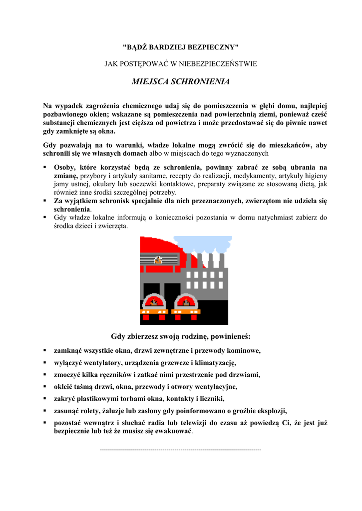 "BĄDŹ BARDZIEJ BEZPIECZNY" JAK POSTĘPOWAĆ W NIEBEZPIECZEŃSTWIE MIEJSCA SCHRONIENIA Na wypadek zagrożenia chemicznego udaj się do pomieszczenia w głębi domu, najlepiej pozbawionego okien; wskazane są pomieszczenia nad powierzchnią ziemi, ponieważ cześć substancji chemicznych jest cięższa od powietrza i może przedostawać się do piwnic nawet gdy zamknięte są okna. Gdy pozwalają na to warunki, władze lokalne mogą zwrócić się do mieszkańców, aby schronili się we własnych domach albo w miejscach do tego wyznaczonych Osoby, które korzystać będą ze schronienia, powinny zabrać ze sobą ubrania na zmianę, przybory i artykuły sanitarne, recepty do realizacji, medykamenty, artykuły higieny jamy ustnej, okulary lub soczewki kontaktowe, preparaty związane ze stosowaną dietą, jak również inne środki szczególnej potrzeby. Za wyjątkiem schronisk specjalnie dla nich przeznaczonych, zwierzętom nie udziela się schronienia. Gdy władze lokalne informują o konieczności pozostania w domu natychmiast zabierz do środka dzieci i zwierzęta. Gdy zbierzesz swoją rodzinę, powinieneś: zamknąć wszystkie okna, drzwi zewnętrzne i przewody kominowe, wyłączyć wentylatory, urządzenia grzewcze i klimatyzację, zmoczyć kilka ręczników i zatkać nimi przestrzenie pod drzwiami, okleić taśmą drzwi, okna, przewody i otwory wentylacyjne, zakryć plastikowymi torbami okna, kontakty i liczniki, zasunąć rolety, żaluzje lub zasłony gdy poinformowano o groźbie eksplozji, pozostać wewnątrz i słuchać radia lub telewizji do czasu aż powiedzą Ci, że jest już bezpiecznie lub też że musisz się ewakuować. --------------------------------------------------------------------------------
