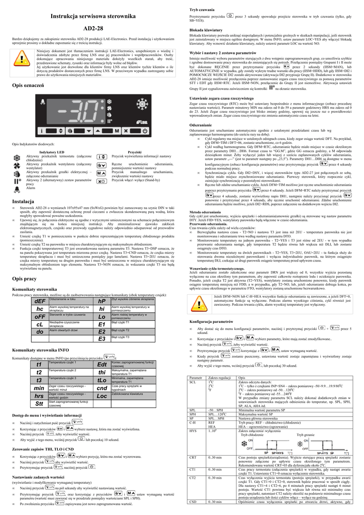 Tryb czuwania Instrukcja serwisowa sterownika AD2-28 Przytrzymanie przycisku SB=YES). przez 3 sekundy spowoduje przejście sterownika w tryb czuwania (tylko, gdy Blokada klawiatury Bardzo dziękujemy za zakupienie sterownika AD2-28 produkcji LAE-Electronics. Przed instalacją i użytkowaniem uprzejmie prosimy o dokładne zapoznanie się z treścią instrukcji. Niniejszy dokument jest tłumaczeniem instrukcji LAE-Electronics, uzupełnionym o wiedzę i doświadczenia zdobyte przez firmę LNS oraz jej pracowników i współpracowników. Osoby dokonujące opracowania niniejszego materiału dołożyły wszelkich starań, aby treść, przedstawione schematy, rysunki oraz informacje były wolne od błędów. Jej użytkowanie jest dozwolone dla klientów firmy LNS oraz klientów tychże klientów o ile dotyczą produktów dostarczonych przez firmę LNS. W przeciwnym wypadku zastrzegamy sobie prawo do użytkowania niniejszych materiałów. Opis oznaczeń Blokada klawiatury pozwala uniknąć niepożądanych i potencjalnie groźnych w skutkach manipulacji, jeśli sterownik jest zainstalowany w miejscu ogólnie dostępnym. W menu INFO, ustaw parametr LOC=YES aby włączyć blokadę klawiatury. Aby wznowić działanie klawiatury, należy ustawić parametr LOC na wartość NO. Wybór i nastawy 2 zestawu parametrów Istnieje możliwość wyboru parametrów sterujących z dwu wstępnie zaprogramowanych grup, co umożliwia szybkie i zgrubne dostosowanie pracy sterownika do zmieniających się potrzeb. Przełączenie pomiędzy Grupami I i II może być dokonane RĘCZNIE przez przytrzymanie przycisku przez 2 sekundy (IISM=MAN), lub AUTOMATYCZNIE w wypadku, gdy zostały wykryte trudne warunki dla pracy (IISM=HDD), lub gdy IISM=DI2 i POMOCNICZE WEJŚCIE DI2 zostało aktywowane (aktywacja DI2 przypisuje Grupę II). Dodatkowo w sterowniku AD2-28 istnieje możliwość przełączenia poprzez zastosowanie zegara czasu rzeczywistego za pomocą parametrów STT i EDT gdy IISM=RTC. Jeżeli IISM=NON, przełączenie do Grupy II jest niemożliwe. Aktywacja ustawień Grupy II jest sygnalizowana zaświeceniem się kontrolki na ekranie sterownika. Ustawienie zegara czasu rzeczywistego Zegar czasu rzeczywistego (RTC) może być ustawiany bezpośrednio z menu informacyjnego (zobacz procedurę nastawiania wartości). Parametr minutowy MIN ma zakres od 0 do 59 a parametr godzinowy HRS ma zakres od 0 do 23. Jeżeli Zegar czasu rzeczywistego jest blisko zmiany godziny, upewnij się jeszcze raz o prawidłowości wprowadzonych zmian. Zegar czasu rzeczywistego nie zmienia automatycznie czasu na letni. Odszranianie Opis Indykatorów diodowych: Indykatory LED Aktywny przekaźnik termostatu (załączone chłodzenie) Aktywny przekaźnik wentylatora (załączony wentylator) Aktywny przekaźnik grzałki elektrycznej – załączone odszranianie Aktywny 2 (alternatywny) zestaw parametrów pracy Alarm Przyciski Przycisk wyświetlenia informacji\ nastawy Odszranianie jest uruchamiane automatycznie zgodnie z ustalonymi przedziałami czasu lub wg zaplanowanego harmonogramu (do sześciu razy na dobę). • Cykl regularny ma miejsce w ustalonych odstępach czasu, kiedy zegar osiąga wartość DFT. Na przykład, gdy DFM=TIM i DFT=06, zostanie uruchomione, co 6 godzin. • Cykl według harmonogramu. Gdy DFM=RTC, odszranianie będzie miało miejsce w czasie określonym przez parametry DH1…DH6. Format czasu to “GG.M”, gdzie GG oznacza godziny, a M odpowiada dziesiątkom minut. Żeby wyłączyć jeden lub więcej z sześciu zaplanowanych cyklów odszraniania, ustaw parametr „---” (jest to parametr następny po „23,5”). Parametry DH1…DH6 są dostępne w menu Ręczne uruchomienie odszraniania, pomniejszenie wartości nastawy Przycisk manualnego uruchamiania, zwiększenie wartości nastawy Przycisk włącz\ wyłącz (Stand-by) • • • • • • przez 4 sekundy. Jeżeli DFM=RTC należy przytrzymać przycisk poprzez przytrzymanie przycisku przez 4 sekundy, zostanie wyświetlony napis DH1, następnie należy przycisnąć przycisk ponownie i przytrzymać przez 4 sekundy, aby ręcznie uruchomić odszranianie. Zdalne uruchomienie odszraniania będzie możliwe, jeżeli DI2=RDS, poprzez załączenie na dodatkowym wejściu DI2. Instalacja • konfiguracyjnym (zobacz konfiguracja parametrów) oraz przytrzymując przycisk przez 4 sekundy podczas normalnej pracy. Synchronizacja cyklu. Gdy DI2=DSY, i więcej sterowników typu AD2-27 jest połączonych ze sobą, będzie miało miejsce zsynchronizowane odszranianie. Pierwszy sterownik, który rozpocznie cykl, zainicjuje synchronizację z pozostałymi sterownikami. Ręczne lub zdalne uruchamianie cyklu. Jeżeli DFM=TIM możliwe jest ręczne uruchomienie odszraniania Sterownik AD2-28 o wymiarach 107x95x47 mm (SxWxG) powinien być zamocowany na szynie DIN w taki sposób, aby zapewnić dostateczną ochronę przed cieczami a zwłaszcza skondensowaną parą wodną, która mogłyby spowodować poważne uszkodzenia. Upewnij się, że połączenia elektryczne są zgodne z wytycznymi umieszczonymi na schemacie połączeniowym znajdującym się na końcu niniejszej instrukcji. Aby zminimalizować zjawisko zakłóceń elektromagnetycznych, czujniki oraz przewody sygnałowe należy odpowiednio odseparować od przewodów zasilania. Umieść czujkę T1 w pomieszczeniu w punkcie dobrze reprezentującym temperaturę chłodzonego produktu (pomieszczenia). Umieść czujkę T2 na parowniku w miejscu charakteryzującym się maksymalnym oblodzeniem. Funkcja czujki temperaturowej T3 jest uwarunkowana nastawą parametru T3. Nastawa T3=DSP oznacza, że na panelu pokazywana jest temperatura mierzona przez czujkę. Nastawa T3=CND oznacza, że czujka mierzy temperaturę skraplacza i musi być umieszczona pomiędzy jego lamelami. Nastawa T3=2EU oznacza, że czujka mierzy temperaturę na drugim parowniku i musi być umieszczona w miejscu charakteryzującym się maksymalnym oblodzeniem tego elementu. Nastawa T3=NON oznacza, 