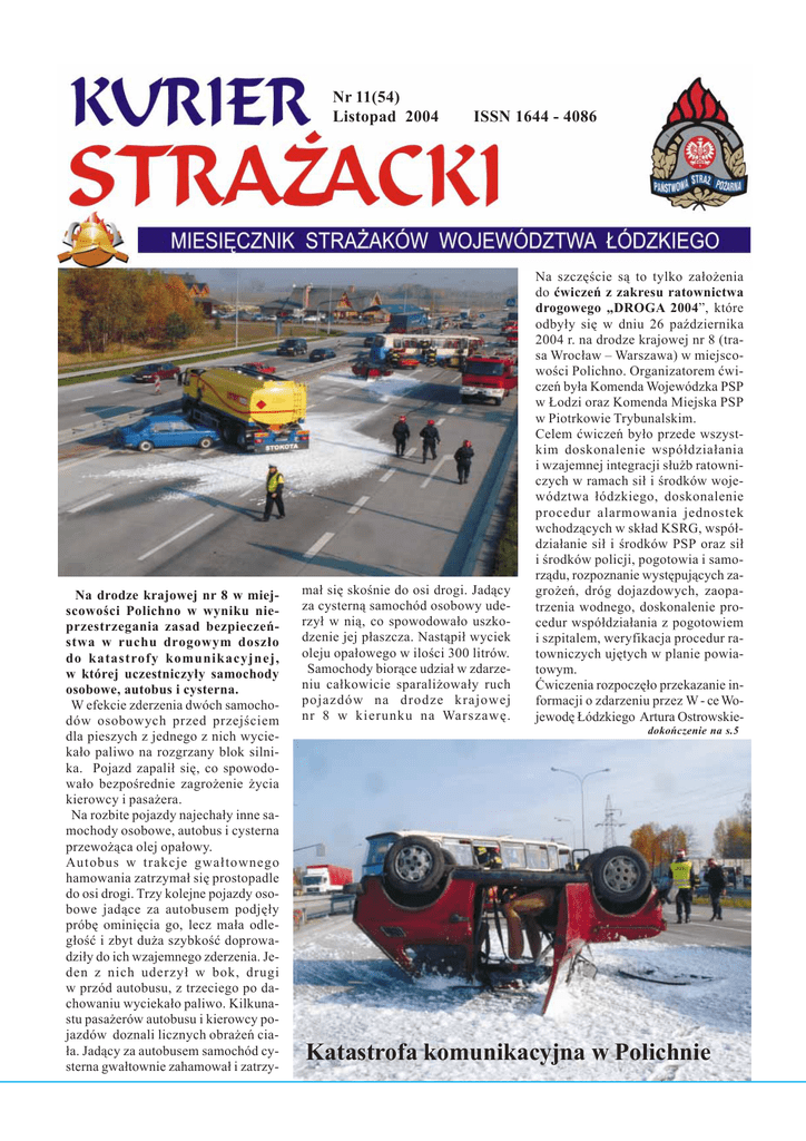 Nr 11(54) Listopad 2004 Na drodze krajowej nr 8 w miejscowoœci Polichno w wyniku nieprzestrzegania zasad bezpieczeñstwa w ruchu drogowym dosz³o do katastrofy komunikacyjnej, w której uczestniczy³y samochody osobowe, autobus i cysterna. W efekcie zderzenia dwóch samochodów osobowych przed przejœciem dla pieszych z jednego z nich wycieka³o paliwo na rozgrzany blok silnika. Pojazd zapali³ siê, co spowodowa³o bezpoœrednie zagro¿enie ¿ycia kierowcy i pasa¿era. Na rozbite pojazdy najecha³y inne samochody osobowe, autobus i cysterna przewo¿¹ca olej opa³owy. Autobus w trakcje gwa³townego hamowania zatrzyma³ siê prostopadle do osi drogi. Trzy kolejne pojazdy osobowe jad¹ce za autobusem podjê³y próbê ominiêcia go, lecz ma³a odleg³oœæ i zbyt du¿a szybkoœæ doprowadzi³y do ich wzajemnego zderzenia. Jeden z nich uderzy³ w bok, drugi w przód autobusu, z trzeciego po dachowaniu wycieka³o paliwo. Kilkunastu pasa¿erów autobusu i kierowcy pojazdów doznali licznych obra¿eñ cia³a. Jad¹cy za autobusem samochód cysterna gwa³townie zahamowa³ i zatrzy- ISSN 1644 - 4086 ma³ siê skoœnie do osi drogi. Jad¹cy za cystern¹ samochód osobowy uderzy³ w ni¹, co spowodowa³o uszkodzenie jej p³aszcza. Nast¹pi³ wyciek oleju opa³owego w iloœci 300 litrów. Samochody bior¹ce udzia³ w zdarzeniu ca³kowicie sparali¿owa³y ruch pojazdów na drodze krajowej nr 8 w kierunku na Warszawê. Na szczêœcie s¹ to tylko za³o¿enia do æwiczeñ z zakresu ratownictwa drogowego „DROGA 2004”, które odby³y siê w dniu 26 paŸdziernika 2004 r. na drodze krajowej nr 8 (trasa Wroc³aw – Warszawa) w miejscowoœci Polichno. Organizatorem æwiczeñ by³a Komenda Wojewódzka PSP w £odzi oraz Komenda Miejska PSP w Piotrkowie Trybunalskim. Celem æwiczeñ by³o przede wszystkim doskonalenie wspó³dzia³ania i wzajemnej integracji s³u¿b ratowniczych w ramach si³ i œrodków województwa ³ódzkiego, doskonalenie procedur alarmowania jednostek wchodz¹cych w sk³ad KSRG, wspó³dzia³anie si³ i œrodków PSP oraz si³ i œrodków policji, pogotowia i samorz¹du, rozpoznanie wystêpuj¹cych zagro¿eñ, dróg dojazdowych, zaopatrzenia wodnego, doskonalenie procedur wspó³dzia³ania z pogotowiem i szpitalem, weryfikacja procedur ratowniczych ujêtych w planie powiatowym. Æwiczenia rozpoczê³o przekazanie informacji o zdarzeniu przez W - ce Wojewodê £ódzkiego Artura Ostrowskiedokoñczenie na s.5 Katastrofa komunikacyjna w Polichnie 2 Prezentacja JRG Poddêbice Kim jesteœmy W Jednostce Ratowniczo - Gaœniczej w Poddêbicach s³u¿bê pe³ni 33 stra¿aków, w tym Dowódca asp. sztab. Andrzej Przespolewski i Zastêpca Dowódcy asp. sztab. Tomasz WoŸniak. Za³oga jednostki sk³ada siê z ludzi m³odych (œrednia wieku 33 lata), a zarazem posiadaj¹cych du¿e predyspozycje i przygotowanie zawodowe. Na co dzieñ JRG zabezpiecza teren o powierzchni 881 km 2 obejmuj¹cy swym zasiêgiem szeœæ gmin (Poddêbice, Uniejów, Dalików, Pêczniew, Wartkowice i Zadzim), które zamieszkuje 45 tyœ. mieszkañców. Specyfikacja naszych zadañ Wskutek szybkiego rozwoju regionu z roku na rok przybywa zadañ, liczba interwencji naszej JRG jest co rok wiêksza (rok 2003 zamknêliœmy liczb¹ 479 interwencji). Mo¿e jest to iloœæ ma³o imponuj¹ca w porównaniu z innymi jednostkami, lecz w przeliczeniu wyjazdowoœci na jednego stra¿aka stawia nas w czo³ówce województwa ³ódzkiego. Dysponujemy dwoma samochodami gaœniczymi: GBA 2/16 na podwoziu Renault i GCBA 5/37,5 na podwoziu Mercedesa oraz dwoma samochodami specjalnymi SCH - 30 na podwoziu Volvo oraz SRT Volkswagen. W naszym wyposa¿eniu jest równie¿ sprzêt ratownictwa wodnego, który sprawdzi³ siê podczas prowadzonych dzia³añ na zbiorniku retencyjnym Jeziorsko i rzece Warcie. Jednak¿e, pomimo posiadania takiego wyposa¿enia wystêpuje wiele potrzeb m.in. konieczna jest wymiana samochodu ratownictwa drogowego, który ma ju¿ 11 lat oraz 13 - letniego samochodu operacyjnego. Wyposa¿enie samochodów po¿arniczych, które posiadamy nie jest najgorsze, ale powinno byæ sukcesywnie doposa¿ane w sprzêt niezbêdny do prowadzenie skutecznych dzia³añ ratowniczo – gaœniczych. Nasze sukcesy Pisz¹c o Jednostce Ratowniczo Gaœniczej w Poddêbicach nie sposób pomin¹æ sukcesów sportowych, osi¹ganych przez stra¿aków. Od 2000 r. zajmujemy III miejsce w województwie ³ódzkim w sporcie po¿arniczym. Rok 2004 by³ jeszcze lepszy, Mistrzostwa Sportowo - Po¿arnicze ukoñczyliœmy na II miejscu, ustêpuj¹c tylko stra¿akom z £odzi. Lekkoatletyka, w której od 1999 r. praktycznie bierze udzia³ 50% stanu naszej za³ogi, przynosi nam podobne sukcesy: rok 1999 – III miejsce, rok 2000 – II miejsce, rok 2001 - II miejsce, rok 2002 – II miejsce, rok 2003 - spe³nienie marzeñ I miejsce. W roku 2004 przygotowani byliœmy jeszcze lepiej ni¿ w innych latach, bo przeczuwaliœmy, ¿e poziom innych zawodników jest coraz lepszy. Na Mistrzostwach nasza dru¿yna pobi³a rekordy Komendy w sztafecie 4x100 m, 100 m, pchniêciu kul¹, lecz niestety skok w dal zaprzepaœci³ szansê na mo¿liwoœæ staniêcia na najwy¿szym podium i cieszenia siê kolejnym pucharem. Pi³ka halowa od zawsze nie nale¿a³a do naszych koronnych dyscyplin. Jednak¿e intensywne i wyczerpuj¹ce treningi, w jakich uczestniczyliœmy jesieni¹ 2003 r. oraz wiosn¹ 2004 r. przynios³y efekty. Zajêliœmy III miejsce w VI Mistrzostwach Województwa £ódzkiego Stra¿aków w Pi³ce No¿nej. Piêæ lat dzia³alnoœci JRG Poddêbice w nowych strukturach powiatowych to okres wzajemnego zrozumienia i ciê¿kiej pracy, niejednokrotnie ponad ludzkie mo¿liwoœci. Da³ nam on jednak wymierne wyniki nie tylko na tle sportowym, ale równie¿ odbi³ siê na ogólnym wizerunku Komendy. Zdobyte puchary zadziwiaj¹ nie jednego goœcia tutejszej Komendy, ale równie¿ samych stra¿aków, którzy do nich siê przyczynili. Puchary, które wype³niaj¹ dwie du¿e gabloty s¹ ozdob¹ 