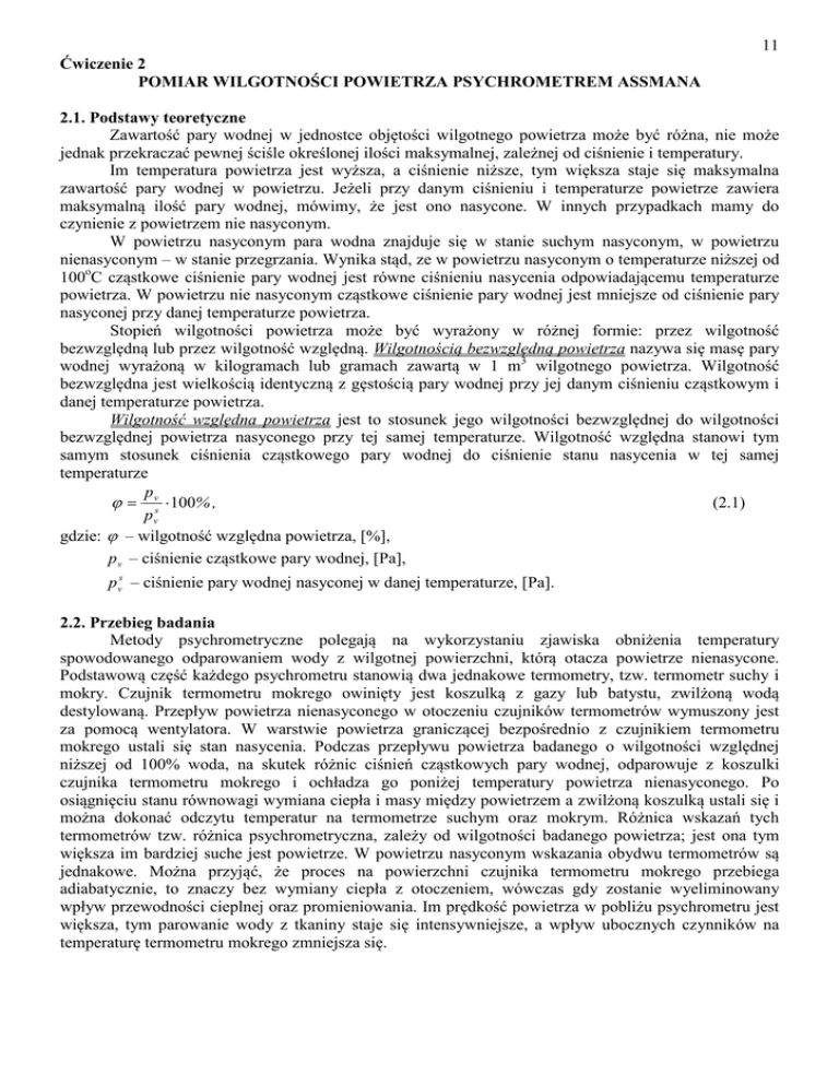 11 Ćwiczenie 2 POMIAR WILGOTNOŚCI POWIETRZA PSYCHROMETREM ASSMANA 2.1. Podstawy teoretyczne Zawartość pary wodnej w jednostce objętości wilgotnego powietrza może być różna, nie może jednak przekraczać pewnej ściśle określonej ilości maksymalnej, zależnej od ciśnienie i temperatury. Im temperatura powietrza jest wyższa, a ciśnienie niższe, tym większa staje się maksymalna zawartość pary wodnej w powietrzu. Jeżeli przy danym ciśnieniu i temperaturze powietrze zawiera maksymalną ilość pary wodnej, mówimy, że jest ono nasycone. W innych przypadkach mamy do czynienie z powietrzem nie nasyconym. W powietrzu nasyconym para wodna znajduje się w stanie suchym nasyconym, w powietrzu nienasyconym – w stanie przegrzania. Wynika stąd, ze w powietrzu nasyconym o temperaturze niższej od 100oC cząstkowe ciśnienie pary wodnej jest równe ciśnieniu nasycenia odpowiadającemu temperaturze powietrza. W powietrzu nie nasyconym cząstkowe ciśnienie pary wodnej jest mniejsze od ciśnienie pary nasyconej przy danej temperaturze powietrza. Stopień wilgotności powietrza może być wyrażony w różnej formie: przez wilgotność bezwzględną lub przez wilgotność względną. Wilgotnością bezwzględną powietrza nazywa się masę pary wodnej wyrażoną w kilogramach lub gramach zawartą w 1 m3 wilgotnego powietrza. Wilgotność bezwzględna jest wielkością identyczną z gęstością pary wodnej przy jej danym ciśnieniu cząstkowym i danej temperaturze powietrza. Wilgotność względna powietrza jest to stosunek jego wilgotności bezwzględnej do wilgotności bezwzględnej powietrza nasyconego przy tej samej temperaturze. Wilgotność względna stanowi tym samym stosunek ciśnienia cząstkowego pary wodnej do ciśnienie stanu nasycenia w tej samej temperaturze p ϕ = vs ⋅ 100% , (2.1) pv gdzie: ϕ – wilgotność względna powietrza, [%], p v – ciśnienie cząstkowe pary wodnej, [Pa], p vs – ciśnienie pary wodnej nasyconej w danej temperaturze, [Pa]. 2.2. Przebieg badania Metody psychrometryczne polegają na wykorzystaniu zjawiska obniżenia temperatury spowodowanego odparowaniem wody z wilgotnej powierzchni, którą otacza powietrze nienasycone. Podstawową część każdego psychrometru stanowią dwa jednakowe termometry, tzw. termometr suchy i mokry. Czujnik termometru mokrego owinięty jest koszulką z gazy lub batystu, zwilżoną wodą destylowaną. Przepływ powietrza nienasyconego w otoczeniu czujników termometrów wymuszony jest za pomocą wentylatora. W warstwie powietrza graniczącej bezpośrednio z czujnikiem termometru mokrego ustali się stan nasycenia. Podczas przepływu powietrza badanego o wilgotności względnej niższej od 100% woda, na skutek różnic ciśnień cząstkowych pary wodnej, odparowuje z koszulki czujnika termometru mokrego i ochładza go poniżej temperatury powietrza nienasyconego. Po osiągnięciu stanu równowagi wymiana ciepła i masy między powietrzem a zwilżoną koszulką ustali się i można dokonać odczytu temperatur na termometrze suchym oraz mokrym. Różnica wskazań tych termometrów tzw. różnica psychrometryczna, zależy od wilgotności badanego powietrza; jest ona tym większa im bardziej suche jest powietrze. W powietrzu nasyconym wskazania obydwu termometrów są jednakowe. Można przyjąć, że proces na powierzchni czujnika termometru mokrego przebiega adiabatycznie, to znaczy bez wymiany ciepła z otoczeniem, wówczas gdy zostanie wyeliminowany wpływ przewodności cieplnej oraz promieniowania. Im prędkość powietrza w pobliżu psychrometru jest większa, tym parowanie wody z tkaniny staje się intensywniejsze, a wpływ ubocznych czynników na temperaturę termometru mokrego zmniejsza się. 12 Rys. 2.1. Psychrometr Assmana. Wilgotność powietrza można mierzyć między innymi psychrometrem Assmana. Składa się on z dwóch dokładnie atestowanych termometrów: • suchego wskazującego temperaturę badanego powietrza, • mokrego wskazującego temperaturę niższą wskutek odparowywania wilgoci z jego powierzchni. Czujniki obu termometrów mają kształt cylindryczny o średnicy 4-4,5 mm i długości 8-12 mm. Termometry osadzone są w obudowie psychrometru w taki sposób, aby czujniki mogły być umieszczone w podwójnych osłonach metalowych obustronnie niklowanych. Powietrze przepływające wokół czujników w kanałach zasysane jest przez wentylator ze stałą prędkością 2-2,5 m/s. Koszulkę termometru mokrego należy każdorazowo przed pomiarem nawilżyć wodą destylowaną (gdy powietrze jest suche, czynność tę powtarza się kilkakrotnie w czasie pomiaru). 2.3. Opracowanie wyników Na podstawie odczytanych wartości termometru mokrego i suchego można ustalić wilgotność względną powietrza posługując się wykresami przedstawionymi na rysunku 2.2. Za pomocą psychrometrów można mierzyć wilgotność względną powietrza w zakresie 5-100% przy zmianach temperatury powietrza 0-50oC. Dokładność pomiaru wynosi ± 3%. W przypadku pomiarów wilgotności powietrza w temperaturach niższych od 0oC (ale niezbyt niskich) koszulkę termometru mokrego można zwilżać 3% roztworem wodnym formaldehydu. Zamiast termometrów cieczowych rozszerzalnościowych w psychrometrach można zastosować termometry manometryczne, elektryczne oporowe lub termopary. Wskazania suchego termometru, oC Wskazania wilgotnego termometru, oC 13 Wilgotność względna, % Rys. 2.2. Wykresy dla psychrometru Assmana (przy v = 2,5 m/s).