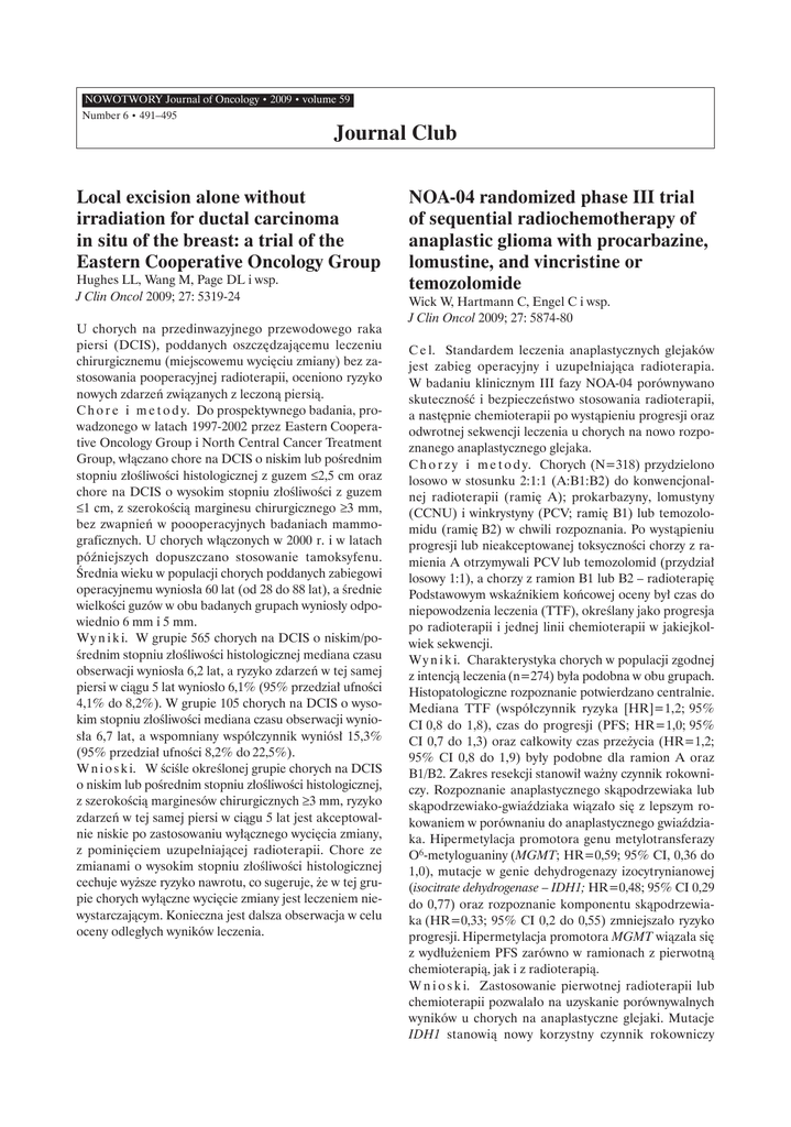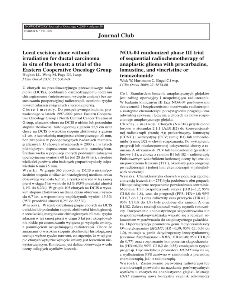 NOWOTWORY Journal of Oncology • 2009 • volume 59 Number 6 • 491–495 Journal Club Local excision alone without irradiation for ductal carcinoma in situ of the breast: a trial of the Eastern Cooperative Oncology Group Hughes LL, Wang M, Page DL i wsp. J Clin Oncol 2009; 27: 5319-24 U chorych na przedinwazyjnego przewodowego raka piersi (DCIS), poddanych oszczędzającemu leczeniu chirurgicznemu (miejscowemu wycięciu zmiany) bez zastosowania pooperacyjnej radioterapii, oceniono ryzyko nowych zdarzeń związanych z leczoną piersią. C h o r e i m e t o d y. Do prospektywnego badania, prowadzonego w latach 1997-2002 przez Eastern Cooperative Oncology Group i North Central Cancer Treatment Group, włączano chore na DCIS o niskim lub pośrednim stopniu złośliwości histologicznej z guzem ≤2,5 cm oraz chore na DCIS o wysokim stopniu złośliwości z guzem ≤1 cm, z szerokością marginesu chirurgicznego ≥3 mm, bez zwapnień w poooperacyjnych badaniach mammograficznych. U chorych włączonych w 2000 r. i w latach późniejszych dopuszczano stosowanie tamoksyfenu. Średnia wieku w populacji chorych poddanych zabiegowi operacyjnemu wyniosła 60 lat (od 28 do 88 lat), a średnie wielkości guzów w obu badanych grupach wyniosły odpowiednio 6 mm i 5 mm. W y n i k i. W grupie 565 chorych na DCIS o niskim/pośrednim stopniu złośliwości histologicznej mediana czasu obserwacji wyniosła 6,2 lat, a ryzyko zdarzeń w tej samej piersi w ciągu 5 lat wyniosło 6,1% (95% przedział ufności 4,1% do 8,2%). W grupie 105 chorych na DCIS o wysokim stopniu złośliwości mediana czasu obserwacji wyniosła 6,7 lat, a wspomniany współczynnik wyniósł 15,3% (95% przedział ufności 8,2% do 22,5%). W n i o s k i. W ściśle określonej grupie chorych na DCIS o niskim lub pośrednim stopniu złośliwości histologicznej, z szerokością marginesów chirurgicznych ≥3 mm, ryzyko zdarzeń w tej samej piersi w ciągu 5 lat jest akceptowalnie niskie po zastosowaniu wyłącznego wycięcia zmiany, z pominięciem uzupełniającej radioterapii. Chore ze zmianami o wysokim stopniu złośliwości histologicznej cechuje wyższe ryzyko nawrotu, co sugeruje, że w tej grupie chorych wyłączne wycięcie zmiany jest leczeniem niewystarczającym. Konieczna jest dalsza obserwacja w celu oceny odległych wyników leczenia. NOA-04 randomized phase III trial of sequential radiochemotherapy of anaplastic glioma with procarbazine, lomustine, and vincristine or temozolomide Wick W, Hartmann C, Engel C i wsp. J Clin Oncol 2009; 27: 5874-80 C e l. Standardem leczenia anaplastycznych glejaków jest zabieg operacyjny i uzupełniająca radioterapia. W badaniu klinicznym III fazy NOA-04 porównywano skuteczność i bezpieczeństwo stosowania radioterapii, a następnie chemioterapii po wystąpieniu progresji oraz odwrotnej sekwencji leczenia u chorych na nowo rozpoznanego anaplastycznego glejaka. C h o r z y i m e t o d y. Chorych (N=318) przydzielono losowo w stosunku 2:1:1 (A:B1:B2) do konwencjonalnej radioterapii (ramię A); prokarbazyny, lomustyny (CCNU) i winkrystyny (PCV; ramię B1) lub temozolomidu (ramię B2) w chwili rozpoznania. Po wystąpieniu progresji lub nieakceptowanej toksyczności chorzy z ramienia A otrzymywali PCV lub temozolomid (przydział losowy 1:1), a chorzy z ramion B1 lub B2 – radioterapię Podstawowym wskaźnikiem końcowej oceny był czas do niepowodzenia leczenia (TTF), określany jako progresja po radioterapii i jednej linii chemioterapii w jakiejkolwiek sekwencji. W y n i k i. Charakterystyka chorych w populacji zgodnej z intencją leczenia (n=274) była podobna w obu grupach. Histopatologiczne rozpoznanie potwierdzano centralnie. Mediana TTF (współczynnik ryzyka [HR]=1,2; 95% CI 0,8 do 1,8), czas do progresji (PFS; HR=1,0; 95% CI 0,7 do 1,3) oraz całkowity czas przeżycia (HR=1,2; 95% CI 0,8 do 1,9) były podobne dla ramion A oraz B1/B2. Zakres resekcji stanowił ważny czynnik rokowniczy. Rozpoznanie anaplastycznego skąpodrzewiaka lub skąpodrzewiako-gwiaździaka wiązało się z lepszym rokowaniem w porównaniu do anaplastycznego gwiaździaka. Hipermetylacja promotora genu metylotransferazy O6-metyloguaniny (MGMT; HR=0,59; 95% CI, 0,36 do 1,0), mutacje w genie dehydrogenazy izocytrynianowej (isocitrate dehydrogenase – IDH1; HR=0,48; 95% CI 0,29 do 0,77) oraz rozpoznanie komponentu skąpodrzewiaka (HR=0,33; 95% CI 0,2 do 0,55) zmniejszało ryzyko progresji. Hipermetylacja promotora MGMT wiązała się z wydłużeniem PFS zarówno w ramionach z pierwotną chemioterapią, jak i z radioterapią. W n i o s k i. Zastosowanie pierwotnej radioterapii lub chemioterapii pozwalało na uzyskanie porównywalnych wyników u chorych na anaplastyczne glejaki. Mutacje IDH1 stanowią nowy korzystny czynnik rokowniczy 492 u chorych na anaplastyczne glejaki, a jego wpływ na rokowanie jest większy niż delecji 1p/19q lub metylacji promotora MGMT. Age-specific evaluation of primary human papillomavirus screening vs conventional cytology in a randomized setting Leinonen M, Nieminen P, Kotaniemi-Talonen L i wsp. J Natl Cancer Inst 2009; 101: 1612-23 Test na obecność DNA wirusa ludzkiego brodawczaka (human papillomavirus – HPV) jest w wykrywaniu zmian szyjki macicy czulszy niż badanie cytologiczne, ale nie jest jasne, czy wyższa czułość jest związana z wiekiem kobiet poddawanych badaniu przesiewowemu. W ramach populacyjnego programu badań przesiewowych w kierunku wykrywania raka szyjki macicy w Finlandii porównano badania przesiewowe na obecność DNA HPV z konwencjonalnym cytologicznym badaniem przesiewowym, uwzględniając wiek jego uczestniczek. M e t o d y. Od 1.01.2003 r. do 31.12.2005 r. do kobiet w wieku 25-65 lat wysyłano na podstawie losowego doboru zaproszenia na rutynowe badanie przesiewowe w kierunku wykrywania raka szyjki macicy. Uczestniczkom programu wykonywano konwencjonalne przesiewowe badanie cytologiczne (n=54.218) lub badanie na obecność DNA onkogennych typów HPV (n=5