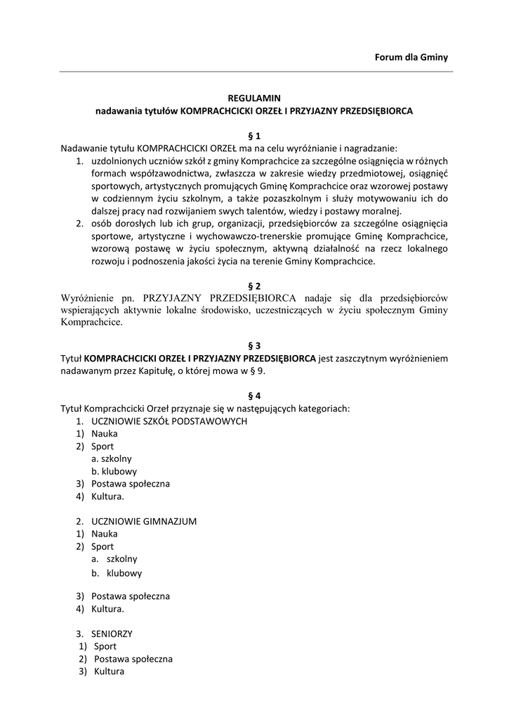 Forum dla Gminy REGULAMIN nadawania tytułów KOMPRACHCICKI ORZEŁ I PRZYJAZNY PRZEDSIĘBIORCA §1 Nadawanie tytułu KOMPRACHCICKI ORZEŁ ma na celu wyróżnianie i nagradzanie: 1. uzdolnionych uczniów szkół z gminy Komprachcice za szczególne osiągnięcia w różnych formach współzawodnictwa, zwłaszcza w zakresie wiedzy przedmiotowej, osiągnięć sportowych, artystycznych promujących Gminę Komprachcice oraz wzorowej postawy w codziennym życiu szkolnym, a także pozaszkolnym i służy motywowaniu ich do dalszej pracy nad rozwijaniem swych talentów, wiedzy i postawy moralnej. 2. osób dorosłych lub ich grup, organizacji, przedsiębiorców za szczególne osiągnięcia sportowe, artystyczne i wychowawczo-trenerskie promujące Gminę Komprachcice, wzorową postawę w życiu społecznym, aktywną działalność na rzecz lokalnego rozwoju i podnoszenia jakości życia na terenie Gminy Komprachcice. §2 Wyróżnienie pn. PRZYJAZNY PRZEDSIĘBIORCA nadaje się dla przedsiębiorców wspierających aktywnie lokalne środowisko, uczestniczących w życiu społecznym Gminy Komprachcice. §3 Tytuł KOMPRACHCICKI ORZEŁ I PRZYJAZNY PRZEDSIĘBIORCA jest zaszczytnym wyróżnieniem nadawanym przez Kapitułę, o której mowa w § 9. §4 Tytuł Komprachcicki Orzeł przyznaje się w następujących kategoriach: 1. UCZNIOWIE SZKÓŁ PODSTAWOWYCH 1) Nauka 2) Sport a. szkolny b. klubowy 3) Postawa społeczna 4) Kultura. 2. UCZNIOWIE GIMNAZJUM 1) Nauka 2) Sport a. szkolny b. klubowy 3) Postawa społeczna 4) Kultura. 3. 1) 2) 3) SENIORZY Sport Postawa społeczna Kultura Forum dla Gminy §5 1. Do tytułu Komprachcickiego Orła mogą być typowani następujący uczniowie: 1) W kategorii nauka: uczniowie szkół z terenu Gminy Komprachcice - laureaci konkursów interdyscyplinarnych, przedmiotowych, tematycznych, artystycznych na szczeblu powiatowym i wyższym oraz uczniowie, którzy w wyniku klasyfikacji osiągnęli średnią ocen: 5,00 i co najmniej bardzo dobrą ocenę z zachowania; 2) W kategorii sport szkolny: uczniowie szkół z terenu Gminy Komprachcice - zwycięzcy zawodów sportowych na szczeblu powiatowym i wyższym; 3) W kategorii sport klubowy: uczniowie zgłoszeni przez kluby sportowe promujące swoją działalnością Gminę Komprachcice lub/i szkołę z terenu Gminy Komprachcice zwycięzcy zawodów sportowych na szczeblu powiatowym i wyższym; 4) W kategorii postawa społeczna: uczniowie szkół z terenu Gminy Komprachcice wyróżniający się wzorową postawą w każdej sytuacji w szkole, na wycieczkach, uroczystościach, godzinach pozalekcyjnych, wolontariusze aktywnie działający na rzecz środowiska szkolnego lub/i lokalnego; 5) W kategorii kultura: uczniowie lub grupy uczniów posiadający osiągnięcia artystyczne na szczeblu powiatowym i wyższym, promujący swoją działalnością Gminę Komprachcice lub/i szkołę z terenu Gminy Komprachcice . 2. Do tytułu Komprachcickiego Orła mogą być typowani następujący seniorzy: 1) W kategorii sport: zawodnik, grupa lub trener tj. uczestnicy i zwycięzcy zawodów sportowych na szczeblu wojewódzkim lub wyższym promujący swoją działalnością Gminę Komprachcice; 2) W kategorii postawa społeczna: osoby fizyczne, organizacje pozarządowe lub przedsiębiorcy wyróżniający się szczególnym zaangażowaniem w lokalne życie społeczne, aktywną działalnością w zakresie wzmacniania lokalnej tożsamości, integrowaniem społeczności, podnoszeniem jakości życia mieszkańców, bezinteresownym wspieraniem potrzebujących; 3) W kategorii kultura: osoby fizyczne lub grupy artystyczne posiadające osiągnięcia artystyczne na szczeblu wojewódzkim lub wyższym, promujący swoją działalnością Gminę Komprachcice. 1. 1) 2) 3) 4) 5) 6) 7) §6 Wnioski o nadanie tytułu Komprachcicki Orzeł oraz Przyjazny Przedsiębiorca mogą składać: dyrektorzy szkół i placówek oświatowych, dyrektor Ośrodka Sportu i Rekreacji w Komprachcicach dyrektor Samorządowego Ośrodka Kultury w Komprachcicach dyrektor Gminnej Biblioteki Publicznej w Komprachcicach dyrektor Gminnego Ośrodka Pomocy Społecznej w Komprachcicach organizacje pozarządowe sołtysi Forum dla Gminy 2. Wzór wniosku, o którym mowa w ust. 1 stanowi załącznik nr 1, nr 2 i nr 3 do Regulaminu. 3. Do wniosku należy dołączyć zdjęcie osoby zgłaszanej w formie elektronicznej. 4. Do wniosku Zgłaszający może dołączyć maksymalnie jeden załącznik potwierdzający najwyższe osiągnięcie lub zasługę z ostatniego roku Zgłaszanego. 5. Wnioski złożone na innym formularzu niż ten stanowiący załącznik do przedmiotowego Regulaminu lub modyfikowane w sposób dowolny przez wnioskodawcę będą odrzucane z przyczyn formalnych. §7 Wniosek, o którym mowa w §6 powinien być dostarczony w miejscu i terminie wyznaczonym przez Przewodniczącego w ogłoszeniu o naborze. 1. 2. 3. 4. 1. 2. 3. 4. 5. 6. §8 Dyrektor szkoły liczącej do 100 uczniów może zgłosić do 2 kandydatów do każdej kategorii dotyczącej uczniów. Dyrektor szkoły liczącej powyżej 100 uczniów może zgłosić do 6 kandydatów w każdej kategorii dotyczącej uczniów. Poza szkołami, każdy Zgłaszający może zgłosić maksymalnie jednego kandydata w ramach jednej kategorii dla tytułu Komprachcicki Orzeł. Każdy Zgłaszający może zgłosić maksymalnie jednego kandydata do wyróżnienia Przyjazny Przedsiębiorca. §9 Tytuły Komprachcicki Orzeł oraz Przyjazny Przedsiębiorca przyznaje Kapituła po zakończeniu procedury kwalifikacyjnej. Procedura kwalifikacyjna obejmuje: a. Ocenę wniosków pod względem formalnym b. Ocenę merytoryczną. Kapitułę powołuje Przewodniczący Stowarzyszenia Forum dla Gminy, który pełni funkcję Przewodniczącego Kapituły zwany dalej Przewodniczącym. Posiedzenia Kapituły zwołuje Przewodniczący. Kapituła może zdecydować o przyznaniu Specjalnego Komprachcickiego Orła za szczególne osiągnięcia lub działalność. Osoby nominowane, a w przypadku osób nieletn