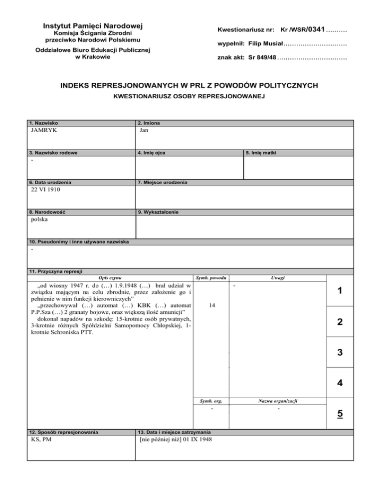 ,QVW\WXW3DPL FL1DURGRZHM Kwestionariusz nr: Kr /WSR/0341 .......... .RPLVMDFLJDQLD=EURGQL przeciwko Narodowi Polskiemu Z\SHáQLá)LOLS0XVLDá .............................. Odd]LDáRZH%LXUR(GXNDFML3XEOLF]QHM w Krakowie znak akt: Sr 849/48 ................................. INDEKS REPRESJONOWANYCH W PRL Z POWODÓW POLITYCZNYCH KWESTIONARIUSZ OSOBY REPRESJONOWANEJ 1. Nazwisko 2. Imiona JAMRYK Jan ,PL RMFD 3. Nazwisko rodowe ,PL PDWNL - 6. Data urodzenia 7. Miejsce urodzenia 22 VI 1910 1DURGRZRü :\NV]WDáFHQLH polska 3VHXGRQLP\LLQQHX*\ZDQHQD]ZLVND - 11. Przyczyna represji Opis czynu Symb. powodu ÄRG ZLRVQ\ U GR « « EUDá XG]LDá Z ]ZL]NX PDMF\P QD FHOX ]EURGQLH SU]H] ]DáR*HQLH JR L SHáQLHQLHZQLPfunkcji kierowniczych” ÄSU]HFKRZ\ZDá « DXWRPDW « .%. « DXWRPDW 336]D«JUDQDW\ERMRZHRUD]ZL NV]LORüDPXQLFML´ GRNRQDá QDSDGyZ QD V]NRG -krotnie osób prywatnych, 3-NURWQLH Uy*Q\FK 6SyáG]LHOQL 6DPRSRPRF\ &KáRSVNLHM krotnie Schroniska PTT. Uwagi - 1 14 2 3 4 12. Sposób represjonowania KS, PM Symb. org. Nazwa organizacji - - 13. Data i miejsce zatrzymania >QLHSy(QLHMQL*@,; 5 2VRE\UHSUHVMRQXMFH UHZL]MDà<6$.(GPXQG– PUBP Nowy Targ rewizja domowD%,*$-:áDG\VáDZ- PUBP Nowy Targ SU]HVá1,(0,(&-y]HI– PUBP Nowy Targ SRVWRZV]F] FLXOHG]WZD=,(/,6.,-DQ– WUBP Kraków post. o tymcz. areszt.: PAULI Jerzy – WPR Kraków SU]HVá=,(/,6.,-DQ– WUBP Kraków konfront.: NIEMIEC Józef – PUBP Nowy Targ NRQIURQW=,(/,6.,-DQ– WUBP Kraków SRVWRSRFLJQGRRGS=,(/,6.,-DQ– WUBP Kraków VSRU]DNWXRVN=,(/,6.,-DQ– WUBP Kraków zatw. aktu osk.: SMOLNICKI Piotr – WPR Kraków GRZyGFDSOXWHJ]0$5&,1.2:6.,0LHF]\VáDZ 15. Data represji 12 XI 1948 prok. obecny przy wyk. KS: GRELA Zenon – WPR Kraków 16. Miejsce represji KRAKÓW ,QVW\WXFMDUHSUHVMRQXMFD 18. Znak akt WSR Kraków 3U]HZRGQLF]F\VNáDGXV G]LRZVNLHJR .,(à7<.$/XGwik Sr 849/48 3R]RVWDOLV G]LRZLHDVHVRU]\áDZQLF\ */,1.2:6.,-HU]\á *6,(1,$.7DGHXV]á 2VNDU*\FLHO 2EURFD .2/$')<1$OIUHG 1$'(/0DNV\PLOLDQ]XU] GX 23. Wyrok w pierwszej instancji .DUDPLHUFLXWUDWDSUDZSXEOLF]Q\FKLRE\ZDWHOVNLFKSUDZKRQRURZ\FKRUD]SU]HSDGHNPLHQLD 24. Py(QLHMV]H]PLDQ\NDU\LSRGVWDZD]ZROQLHQLD - 25. Data zwolnienia - 'DWDPLHUFL 14 II 1949 0LHMVFHPLHUFL :L ]LHQLH0RQWHOXSLFKZ.UDNRZLH 3U]\F]\QDPLHUFL Wykonanie wyroku 'UyGáRLQIRUPDFML $UFKLZXP3DVWZRZHZ.UDNRZLH (APKr), WSR Kraków, Sr 1020/49 29. Miejsce pochówku b.d. 'DWDUHKDELOLWDFMLOXEXQLHZD*QZ\URNX - 32. Uwagi GDWD]DWU]\PDQLDXVWDORQDQDSRGVWSURWRNRáXUHZL]ML
