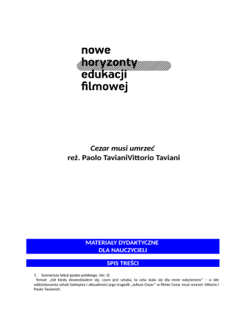 Cezar musi umrzeć reż. Paolo TavianiVittorio Taviani MATERIAŁY DYDAKTYCZNE DLA NAUCZYCIELI SPIS TREŚCI 1. Scenariusz lekcji języka polskiego. (str. 2) Temat: „Od kiedy dowiedziałem się, czym jest sztuka, ta cela stała się dla mnie więzieniem” – o sile oddziaływania sztuki Szekspira i aktualności jego tragedii „Juliusz Cezar” w filmie Cezar musi umrzeć Vittorio i Paolo Tavianich. SCENARIUSZ LEKCJI JĘZYKA POLSKIEGO Opracowała: Małgorzata Wiśniewska Temat: „Od kiedy dowiedziałem się, czym jest sztuka, ta cela stała się dla mnie więzieniem” – o sile oddziaływania sztuki Szekspira i aktualności jego tragedii „Juliusz Cezar” w filmie Cezar musi umrzeć Vittorio i Paolo Tavianich. CELE LEKCJI: Po lekcji uczeń powinien: znać sylwetkę Juliusz Cezara i tematykę tragedii Szekspira „Juliusz Cezar”; rozumieć mechanizmy adaptacji teatralno-filmowej dzieła literackiego; charakteryzować koncept (pomysł inscenizacyjny) reżyserów, pracę aktorów nad tekstem oraz poetykę i strukturę filmu; dostrzegać oddziaływanie tekstu i wymowy sztuki na aktorów-więźniów; rozumieć funkcje sztuki; umieć funkcjonalnie korzystać z zasobów Internetu lub innych źródeł wiedzy. METODY I FORMY PRACY sporządzanie notatki w domu; pogadanka nauczyciela; prezentacja ucznia; burza mózgów; dyskusja problemowa; praca ze słownikiem, praca z tekstem filmowym; ŚRODKI DYDAKTYCZNE film Vittorio i Paolo Tavianich Cezar musi umrzeć Włochy 2012; William Szekspir, Juliusz Cezar, Kraków 2007; Allan Bloom, Szekspir i polityka, Kraków 1995; Słownik pojęć i tekstów kultury, pod redakcją Ewy Szczęsnej, WSiP, Warszawa 2002; www.imperiumromanum.edu.pl; recenzje ze stron: www.wyborcza.pl; www.dwutygodnik.com; www.rp.pl; www.filmweb.pl; Krzysztof Łapiński, Camorra wystawia Szekspira. O filmie „Cezar musi umrzeć” braci Taviani „Kultura Liberalna” nr 211 (4/2013) z 22 stycznia 2013 r. Wszelkie prawa do materiałów dydaktycznych zastrzeżone dla Stowarzyszenia Nowe Horyzonty 2 POJĘCIA KLUCZOWE: paradokument adaptacja teatralna intertekstualność świadomość tragiczna CZAS 2 lekcje PRZEBIEG LEKCJI 1. Kim był Juliusz Cezar? – sprawdzanie pracy domowej Młodzież miała za zadanie przygotować przed pokazem notatkę o Juliuszu Cezarze, ze zwróceniem szczególnej uwagi na okoliczności jego śmierci, np.: Gajusz Juliusz Cezar (12 lipca 100 - 15 marca 44 p.n.e.) Jeden z członków stronnictwa popularów w Rzymie, które forsowało projekty zmian w państwie. Piastował kolejno urzędy kwestora, edyla, pretora, konsula i dyktatora. Sławę zdobył dzięki namiestnictwu w Galii. Pomoc żołnierzy pozwoliła mu na pokonanie opozycji, skupionej wokół senatu i Pompejusza, i przejęcie władzy w Rzymie. Cezar przeprowadził liczne reformy, mające podnieść państwo z anarchii i wojen. Został jedynowładcą Rzymu, a Senat stał się instytucją fasadową, ponieważ przewagę uzyskali w nim jego zwolennicy. W odróżnieniu od poprzedników Cezar nie mordował ani nie skazywał na banicję swoich przeciwników, głosząc zasadę „łagodności rządów”. Nie mścił się na swych dawnych przeciwnikach politycznych, cofając nawet konfiskaty majątków. Mimo to został szybko znienawidzony przez starą arystokrację za okazywanie niemal całkowitej pogardy dla starych instytucji republikańskich. Po rozgromieniu armii synów Pompejusza, wrócił do stolicy Imperium jako niekwestionowany władca. 14 lutego 44 roku p.n.e. Senat obwołał Cezara dyktatorem wieczystym (dictator in perpetuum), najwyższym kapłanem, imperatorem i „ojcem ojczyzny”. Próbowano go obwołać królem Rzymu, ale Cezar odmówił, gdyż nadal starał się zachowywać pozory republikańskiej legalności.Wówczas ma czele opozycji wobec Cezara stanął Gajusz Kasjusz Longinus i Marek Juniusz Brutus. Byli oni związani wcześniej z obozem Pompejusza, po klęsce pod Farsalos poddali się Cezarowi, nadal jednak głosili wobec niego swoją niechęć. Cezara ostrzegano przed zamachem na jego życie, jednak dyktator lekceważył przepowiednie wróżbitów i ostrzeżenia żony, która w dniu, kiedy zamordowano władcę, miała zły sen. Oto opis zabójstwa: „Na ostatnim posiedzeniu senatu 15 marca 44 roku p.n.e. w dniu id marcowych, Cezar zajął miejsce na złoconym krześle. Podszedł do niego Tulliusz Cymber, prosząc o łaskę dla wygnanego brata, a za nim zaczęli podchodzić inni wtajemniczeni. Cezar rozdrażniony tą natarczywością próbował wstać, ale wtedy Cymber ściągnął mu togę, co miało być umówionym znakiem dla wszystkich do ataku. Pierwszy cios zadał Publiusz Serwiliusz Kaska, jednak uderzenie było za słabe. Cezar odpłacił się mu ciosem w ramię, jednak wtedy posypały się na niego, wedle tradycji, 23 ciosy zadane sztyletami. Ostatni cios, zadany ręką Brutusa, którego Cezar uważał za przyjaciela, okazał się śmiertelny. W Wszelkie prawa do materiałów dydaktycznych zastrzeżone dla Stowarzyszenia Nowe Horyzonty 3 chwili jego zadawania, Cezar miał wyszeptać: „I ty, Brutusie, przeciw mnie?” (Et tu, Brute, contra me?). Jak się później okazało Cezar w swym testamencie ustanowił swoim spadkobiercą Oktawiana, wnuka jego córki, Julii. 2. W jaki sposób Szekspir ukazał sylwetkę Juliusza Cezara w swoim dramacie? – pogadanka nauczyciela/prezentacja ustna wybranego ucznia Szekspir skupił się na spisku na życie Cezara, ukazując przy tej okazji nieposkromioną żądzę władzy, której ulega wybitny wódz i bohater. Szekspir portretuje człowieka samotnego, nieufnego, zmagającego się z własnymi słabościami, który nie chce utracić swej pozycji, ale też nie czuje się szczęśliwy. Tragizm dotyczy też drugiej ważnej postaci tragedii, czyli Brutusa. Namówiony przez Kasjusza, który potrzebuje jego autorytetu i szacunku, jakim cieszy się w Rzymie, przystępuje do spisku, wiedziony szlachetnymi intencjami – obroną zagrożonych prz