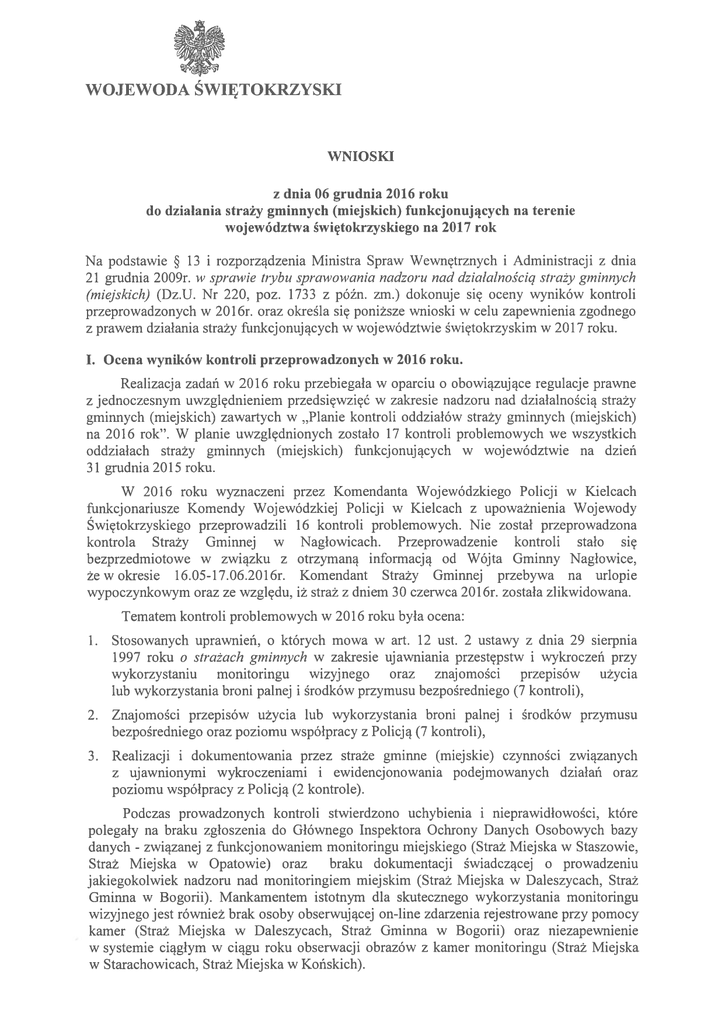 WOJEWODA ŚWIĘTOKRZYSKI WNIOSKI z dnia 06 grudnia 2016 roku do działania straży gminnych (miejskich) funkcjonujących na terenie województwa świętokrzyskiego na 2017 rok Na podstawie 13 i rozporządzenia Ministra Spraw Wewnętrznych i Administracji z dnia 21 grudnia 2009r. w sprawie trybu sprawowania nadzoru nad działalnością straży gminnych (miejskich) (Dz.U. Nr 220, poz. 1733 z późn. zm.) dokonuje się oceny wyników kontroli przeprowadzonych w 201 6r. oraz określa się poniższe wnioski w celu zapewnienia zgodnego z prawem działania straży funkcjonujących w województwie świętokrzyskim w 2017 roku. I. Ocena wyników kontroli przeprowadzonych w 2016 roku. Realizacja zadań w 2016 roku przebiegała w oparciu o obowiązujące regulacje prawne z jednoczesnym uwzględnieniem przedsięwzięć w zakresie nadzoru nad działalnością straży gminnych (miejskich) zawartych w „Planie kontroli oddziałów straży gminnych (miejskich) na 2016 rok”. W planie uwzględnionych zostało 17 kontroli problemowych we wszystkich oddziałach straży gminnych (miejskich) funkcjonujących w województwie na dzień 31 grudnia20l5 roku. W 2016 roku wyznaczeni przez Komendanta Wojewódzkiego Policji w Kielcach funkcjonariusze Komendy Wojewódzkiej Policji w Kielcach z upoważnienia Wojewody Swiętokrzyskiego przeprowadzili 16 kontroli problemowych. Nie został przeprowadzona kontrola Straży Gminnej w Nagłowicach. Przeprowadzenie kontroli stało się bezprzedmiotowe w związku z otrzymaną informacją od Wójta Gminny Nagłowice, że w okresie 16.05-17.06.2016r. Komendant Straży Gminnej przebywa na urlopie wypoczynkowym oraz ze względu, iż straż z dniem 30 czerwca 2016r. została zlikwidowana. Tematem kontroli problemowych w 2016 roku była ocena: 1. Stosowanych uprawnień, o których mowa w art. 12 ust. 2 ustawy z dnia 29 sierpnia 1997 roku o strażach gminnych w zakresie ujawniania przestępstw i wykroczeń przy wykorzystaniu monitoringu wizyjnego oraz znajomości przepisów użycia lub wykorzystania broni palnej i środków przymusu bezpośredniego (7 kontroli), 2. Znajomości przepisów użycia lub wykorzystania broni palnej i środków przymusu bezpośredniego oraz poziomu współpracy z Policją (7 kontroli), 3. Realizacji i dokumentowania przez straże gminne (miejskie) czynności związanych z ujawnionymi wykroczeniami i ewidencjonowania podejmowanych działań oraz poziomu współpracy z Policją (2 kontrole). Podczas prowadzonych kontroli stwierdzono uchybienia i nieprawidłowości, które polegały na braku zgłoszenia do Głównego Inspektora Ochrony Danych Osobowych bazy danych związanej z funkcjonowaniem monitoringu miejskiego (Straż Miejska w Staszowie, braku dokumentacji świadczącej o prowadzeniu Straż Miejska w Opatowie) oraz monitoringiem miejskim (Straż Miejska w Daleszycach, Straż jakiegokolwiek nadzoru nad Gminna w Bogorii). Mankamentem istotnym dla skutecznego wykorzystania monitoringu wizyjnego jest również brak osoby obserwującej on-line zdarzenia rejestrowane przy pomocy kamer (Straż Miejska w Daleszycach, Straż Gminna w Bogorii) oraz niezapewnienie w systemie ciągłym w ciągu roku obserwacji obrazów z kamer monitoringu (Straż Miejska w Starachowicach, Straż Miejska w Końskich). - 2 Ponadto niektórzy strażnicy nie wykazali się wystarczającą znajomością przepisów użycia lub wykorzystania broni palnej i środków przymusu bezpośredniego (Straż Miejska w Starachowicach, Straż Miejska w Ostrowcu Swiętokrzyskim, Straż Miejska w Kielcach) albo z uwagi na usprawiedliwioną nieobecność w czasie kontroli nie przystąpili do sprawdzenia znajomości przepisów użycia lub wykorzystania broni palnej i środków przymusu (Straż Miejska w Daleszycach, Straż Gminna w Bogorii, Straż Miejska w Kielcach). W związku z wystąpieniem wyżej opisanych nieprawidłowości i uchybień zalecenia pokontrolne sformułowane były głównie, w zakresie: 1. Niezwłocznego zgłoszenia bazy danych monitoringu miejskiego do Głównego Inspektora Ochrony Danych Osobowych. 2. Realizacji i dokumentowania sprawowanego nadzoru nad funkcjonowaniem monitoringu oraz zapewnienia rejestracji wizji przy pomocy monitoringu miejskiego/gminnego zgodnie z przepisami określonymi w rozporządzenia Rady Ministrów z dnia 16 grudnia 2009r. W sprawie sposobu obserwowania i rejestrowania przy użyciu środków technicznych obrazu zdarzeń w miejscach publicznych przez straż gminną/miejską (Dz. U. Nr 220, poz. 1”720). 3. Uzupełnienia wiedzy przez strażników, którzy nie osiągnęli wymaganych 50% punktów podczas sprawdzianu w sferze wykorzystania lub użycia broni palnej i środków przymusu bezpośredniego oraz zobowiązania do przystąpienia do sprawdzianu w drugim terminie. Strażnicy, którzy nie przystąpili do sprawdzianu również zostali zobowiązani do przystąpienia do sprawdzianu, na terenie obiektów Komendy Wojewódzkiej Policji w Kielcach. Wystąpienia pokontrolne Wojewody Świętokrzyskiego przekazane zostały komendantom straży gminnych (miejskich), a ich kopie wójtom, burmistrzom, prezydentom miast oraz Komendantowi Wojewódzkiemu Policji w Kielcach. Wystąpienia pokontrolne zostały także opublikowane w Biuletynie Informacji Publicznej Swiętokrzyskiego Urzędu Wojewódzkiego na stronie httm//bip.kielce.uw.oy.pl/ w zakładce „Kontrole i audyty”. W sytuacji wystąpienia nieprawidłowości i uchybień informacje o realizacji zaleceń z jednostek skontrolowanych były przesyłane za pośrednictwem Komendanta Wojewódzkiego Policji w Kielcach do Wojewody Swiętokrzyskiego. Z uwagi na likwidację Straży Gminnej funkcjonującej w strukturze Urzędu Gminy w Nagłowicach oraz rozwiązanie Straży Gminnej w Nowym Korczynie z dniem 30 czerwca 2016 roku na terenie województwa świętokrzyskiego w 2017r. będzie funkcjonować 15 oddziałów straży gminnych (miejskich), w tym 14 miejskich oraz 1 straż gminna. — II. Wnioski do działania straży w 201